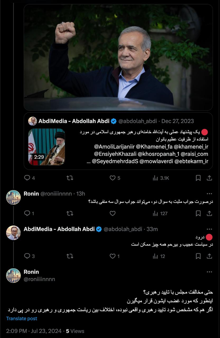 Home/PoliticsI had stated during the election days that Dr. Masoud Pezeshkian, like Dr. Saeed Jalili, is a soldier and absolutely subordinate to the Supreme Leader and the leadership of the nation.Read1 minute -Saturday 2026/01/24 - 17:04News Code:24236Share آقای دکتر مسعود پزشکیان همانند دکتر سعید جلیلی هر دو سرباز و تابع ولی مطلقه فقیه و امامت امت هستند Take less than a minute, register and share your opinion under this post.Insulting or inciting messages will be deleted.Sign UpComming Up Next The Omani foreign minister, whom I hope will one day publish a memoir of the details of these negotiations, which would certainly be very interesting to read, is now in Washington to provide further explanation.خواندن 1 minute Mr. Mohammad Jafar Qaempanah, Executive Deputy of the President, Mr. Majid Farahani, Deputy of Coordination and Follow-up of the Executive Deputy of the President, helloخواندن 1 minute I was thinking about the strange and ruthless labyrinth of power and politics.خواندن 1 minute Greetings, Mr. Houshmand. Why were these martyrs not buried within the Holy Shrine of Imam Reza or the Astan-e Quds territory, but instead in Behesht-e Reza?خواندن 1 minute The issue is very simple: solving the difference between fatwa and government decreeخواندن 1 minuteMost ReadMemories of Akbar Hashemi - February 20, 2000 - Meeting with Abdullah Jasbi and Concerns About Election ResultsMovie / Where is Commander Morteza Talaie?Akbar Hashemi's memoirs - 1999 September 10 - The two-person political negotiations with Vaez Tabasi continued until he was escorted to Tehran, where Hashemi apparently decided to seriously participate in the sixth parliamentary elections.The records of the recent periods of the Islamic Council showed that the parliament is not in charge of affairs and cannot interfere or pass resolutions on the authority of the Commander-in-Chief of the Armed Forces at any level, let alone supervise.What will be the future of Iran with the announced candidates for the presidential election? / Conversation with Dr. Taghi Azad AramakiCan I feel tired with you?A Basiji veterinarian was appointed head of the health network instead of an otolaryngologist.Akbar Hashemi's memoirs - 1999 September 5 - The meeting of the senior managers of the judiciary with Hashemi Rafsanjani and their complaint about the neglect of Hashemi Shahroudi, the new head of the judiciary, continues.Memories of Akbar Hashemi - 1999 September 7 - In continuation of the efforts of the late Vaez Tabasi, who used to encourage Hashemi to participate in the elections in frequent meetings, this time he also met with Hashemi.Akbar Hashemi's memories - 1999 September 9 - Continued visits to the belongings, buildings and works of Astan Quds