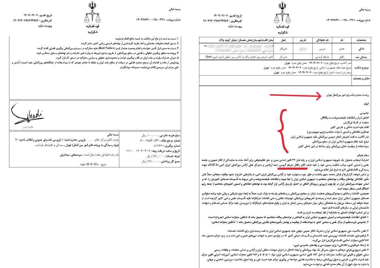 Home/PoliticsAfter yesterday’s agreement between the Islamic Republic and the International Atomic Energy Agency, signed by Seyed Abbas Araghchi and Emmanuel GrossiRead1 minute -Thursday 2025/09/11 - 22:51News Code:22566Share Now we must see what Dr. Saeed Farhadnia, the investigator of Branch One of the Prosecutor’s Office for International Affairs, will do regarding the complaint filed by a journalist residing in Iran against Grossi. Now we must see what Dr. Saeed Farhadnia, the investigator of Branch One of the Prosecutor’s Office for International Affairs, will do regarding the complaint filed by a journalist residing in Iran against Grossi.Will he temporarily hold it, applying various extensions, or will a non-prosecution order be issued and approved by the prosecutor?And if a non-prosecution order is issued, what will the competent court do if the complainant objects?Of course, the future of this complaint is entirely clear.Related news Greetings, Mr. Secretary of the Supreme National Security Council. Take less than a minute, register and share your opinion under this post.Insulting or inciting messages will be deleted.Sign UpComming Up Next I remembered Dr. Sadegh Zibakalam's speech about six months ago, when he said: If we enter into a military conflict, whether the system remains or not, not a single electric pole will remain intact in Iran - are you listening?خواندن 0 If this public announcement is not hindered like other parts of the system's security megaproject, yesخواندن 1 minute Regardless of the result of the establishment or non-continuation of the establishment of the Islamic Republic; Should the main leadership option after Ayatollah Khamenei be acted in this way?خواندن 1 minute According to the significant custom of the seminary and jurisprudence, now we have to see which jurist will perform the funeral prayer for Ayatollah Khamenei?خواندن 1 minute In the news of his appointment, I wrote that he is the commander of the camp at the same time as the deputy commander of the army corpsخواندن 1 minuteMost ReadMemories of Akbar Hashemi - February 20, 2000 - Meeting with Abdullah Jasbi and Concerns About Election ResultsMovie / Where is Commander Morteza Talaie?Akbar Hashemi's memoirs - 1999 September 10 - The two-person political negotiations with Vaez Tabasi continued until he was escorted to Tehran, where Hashemi apparently decided to seriously participate in the sixth parliamentary elections.The records of the recent periods of the Islamic Council showed that the parliament is not in charge of affairs and cannot interfere or pass resolutions on the authority of the Commander-in-Chief of the Armed Forces at any level, let alone supervise.What will be the future of Iran with the announced candidates for the presidential election? / Conversation with Dr. Taghi Azad AramakiCan I feel tired with you?A Basiji veterinarian was appointed head of the health network instead of an otolaryngologist.Akbar Hashemi's memoirs - 1999 September 5 - The meeting of the senior managers of the judiciary with Hashemi Rafsanjani and their complaint about the neglect of Hashemi Shahroudi, the new head of the judiciary, continues.Memories of Akbar Hashemi - 1999 September 7 - In continuation of the efforts of the late Vaez Tabasi, who used to encourage Hashemi to participate in the elections in frequent meetings, this time he also met with Hashemi.Akbar Hashemi's memories - 1999 September 9 - Continued visits to the belongings, buildings and works of Astan Quds