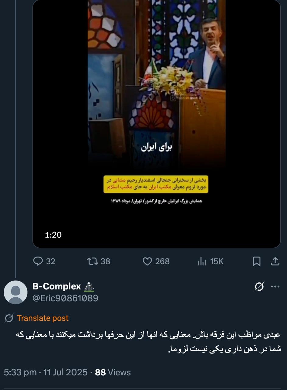 Home/PoliticsI merely narrated a historical event and did not judge. I also have no information about his fate and Hamid Baqaei after being released from prison. Are they still close to Ahmadinejad or not?Read1 minute -Wednesday 2025/07/16 - 13:04News Code:21198Share عبدی مواظب این فرقه باش. معنایی که انها از این حرفها برداشت میکنند با معنایی که شما در ذهن داری یکی نیست لزوما.— B-Complex 🏔️ (@Eric90861089) July 11, 2025🔴درودمن صرفاً یک رویداد تاریخی را باز روایت کردم و قضاوتی نکردم.🔸 هیچ اطلاعی هم از سرنوشت او و حمید بقایی پس از رهایی از زندان ندارم که بالاخره چه میکنند؟ هنوز نزدیک به احمدی نژاد هستند یا نه؟— AbdiMedia - Abdollah Abdi (@abdolah_abdi) July 11, 2025Related news What clashes with Esfandiar Rahim Mashaei based on these words that did not Take less than a minute, register and share your opinion under this post.Insulting or inciting messages will be deleted.Sign UpComming Up Next I remembered Dr. Sadegh Zibakalam's speech about six months ago, when he said: If we enter into a military conflict, whether the system remains or not, not a single electric pole will remain intact in Iran - are you listening?خواندن 0 If this public announcement is not hindered like other parts of the system's security megaproject, yesخواندن 1 minute Regardless of the result of the establishment or non-continuation of the establishment of the Islamic Republic; Should the main leadership option after Ayatollah Khamenei be acted in this way?خواندن 1 minute According to the significant custom of the seminary and jurisprudence, now we have to see which jurist will perform the funeral prayer for Ayatollah Khamenei?خواندن 1 minute In the news of his appointment, I wrote that he is the commander of the camp at the same time as the deputy commander of the army corpsخواندن 1 minuteMost ReadMemories of Akbar Hashemi - February 20, 2000 - Meeting with Abdullah Jasbi and Concerns About Election ResultsMovie / Where is Commander Morteza Talaie?Akbar Hashemi's memoirs - 1999 September 10 - The two-person political negotiations with Vaez Tabasi continued until he was escorted to Tehran, where Hashemi apparently decided to seriously participate in the sixth parliamentary elections.The records of the recent periods of the Islamic Council showed that the parliament is not in charge of affairs and cannot interfere or pass resolutions on the authority of the Commander-in-Chief of the Armed Forces at any level, let alone supervise.What will be the future of Iran with the announced candidates for the presidential election? / Conversation with Dr. Taghi Azad AramakiCan I feel tired with you?A Basiji veterinarian was appointed head of the health network instead of an otolaryngologist.Akbar Hashemi's memoirs - 1999 September 5 - The meeting of the senior managers of the judiciary with Hashemi Rafsanjani and their complaint about the neglect of Hashemi Shahroudi, the new head of the judiciary, continues.Memories of Akbar Hashemi - 1999 September 7 - In continuation of the efforts of the late Vaez Tabasi, who used to encourage Hashemi to participate in the elections in frequent meetings, this time he also met with Hashemi.Akbar Hashemi's memories - 1999 September 9 - Continued visits to the belongings, buildings and works of Astan Quds