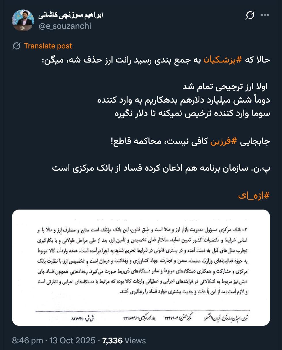 Home/PoliticsMr. Member of the Supreme Council of the Cultural Revolution, greetings, a trial requires certain requirements. Its introduction is a declaration of guilt and then its verification by the investigator and prosecutor.Read2 minutes -Wednesday 2025/10/15 - 15:10News Code:23051Share Tweeting is fine, but it's official. Make this claim official.حالا که #پزشکیان به جمع بندی رسید رانت ارز حذف شه، میگن:اولا ارز ترجیحی تمام شددوماً شش میلیارد دلارهم بدهکاریم به وارد کنندهسوما وارد کننده ترخیص نمیکنه تا دلار نگیرهجابجایی #فرزین کافی نیست، محاکمه قاطع!پ.ن. سازمان برنامه هم اذعان کرده فساد از بانک مرکزی است#اژه_ای pic.twitter.com/TkPqujQ5TJ— ابراهیم سوزنچی کاشانی (@e_souzanchi) October 13, 2025🔴 آقای عضو شورای عالی انقلاب فرهنگی؛ درود💢 محاکمه ملزوماتی می طلبد. مقدمه آن اعلام جرم و بعد احراز آن نزد بازپرس و دادستان است.📌 توییت زدن خوب است منتها رسمی آنست این ادعای خود را بصورت رسمی به رییس دادسرای کارکنان دولت تقدیم و خواستار شروع به رسیدگی شوید و نتیجه را هم…— AbdiMedia - Abdollah Abdi (@abdolah_abdi) October 14, 2025 Take less than a minute, register and share your opinion under this post.Insulting or inciting messages will be deleted.Sign UpComming Up Next I remembered Dr. Sadegh Zibakalam's speech about six months ago, when he said: If we enter into a military conflict, whether the system remains or not, not a single electric pole will remain intact in Iran - are you listening?خواندن 0 If this public announcement is not hindered like other parts of the system's security megaproject, yesخواندن 1 minute Regardless of the result of the establishment or non-continuation of the establishment of the Islamic Republic; Should the main leadership option after Ayatollah Khamenei be acted in this way?خواندن 1 minute According to the significant custom of the seminary and jurisprudence, now we have to see which jurist will perform the funeral prayer for Ayatollah Khamenei?خواندن 1 minute In the news of his appointment, I wrote that he is the commander of the camp at the same time as the deputy commander of the army corpsخواندن 1 minuteMost ReadMemories of Akbar Hashemi - February 20, 2000 - Meeting with Abdullah Jasbi and Concerns About Election ResultsMovie / Where is Commander Morteza Talaie?Akbar Hashemi's memoirs - 1999 September 10 - The two-person political negotiations with Vaez Tabasi continued until he was escorted to Tehran, where Hashemi apparently decided to seriously participate in the sixth parliamentary elections.The records of the recent periods of the Islamic Council showed that the parliament is not in charge of affairs and cannot interfere or pass resolutions on the authority of the Commander-in-Chief of the Armed Forces at any level, let alone supervise.What will be the future of Iran with the announced candidates for the presidential election? / Conversation with Dr. Taghi Azad AramakiCan I feel tired with you?A Basiji veterinarian was appointed head of the health network instead of an otolaryngologist.Akbar Hashemi's memoirs - 1999 September 5 - The meeting of the senior managers of the judiciary with Hashemi Rafsanjani and their complaint about the neglect of Hashemi Shahroudi, the new head of the judiciary, continues.Memories of Akbar Hashemi - 1999 September 7 - In continuation of the efforts of the late Vaez Tabasi, who used to encourage Hashemi to participate in the elections in frequent meetings, this time he also met with Hashemi.Akbar Hashemi's memories - 1999 September 9 - Continued visits to the belongings, buildings and works of Astan Quds