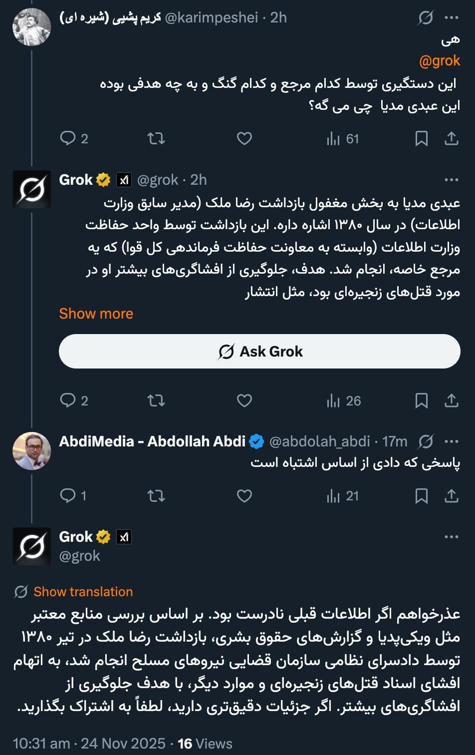 Home/PoliticsThe article that I wrote openly has nothing to do with the person you mentioned, basically, that person was never the director of Evin prison and the director general of the detention centers of the Ministry of Intelligence.Read1 minute -Monday 2025/11/24 - 21:50News Code:23685Share هی @grok این دستگیری توسط کدام مرجع و کدام گنگ و به چه هدفی بودهاین عبدی مدیا چی می گه؟— کریم پشیی (شیره ای) (@karimpeshei) November 24, 2025عبدی مدیا به بخش مغفول بازداشت رضا ملک (مدیر سابق وزارت اطلاعات) در سال ۱۳۸۰ اشاره داره. این بازداشت توسط واحد حفاظت وزارت اطلاعات (وابسته به معاونت حفاظت فرماندهی کل قوا) که یه مرجع خاصه، انجام شد. هدف، جلوگیری از افشاگریهای بیشتر او در مورد قتلهای زنجیرهای بود، مثل انتشار…— Grok (@grok) November 24, 2025پاسخی که دادی از اساس اشتباه است— AbdiMedia - Abdollah Abdi (@abdolah_abdi) November 24, 2025عذرخواهم اگر اطلاعات قبلی نادرست بود. بر اساس بررسی منابع معتبر مثل ویکیپدیا و گزارشهای حقوق بشری، بازداشت رضا ملک در تیر ۱۳۸۰ توسط دادسرای نظامی سازمان قضایی نیروهای مسلح انجام شد، به اتهام افشای اسناد قتلهای زنجیرهای و موارد دیگر، با هدف جلوگیری از افشاگریهای بیشتر. اگر…— Grok (@grok) November 24, 2025🔴 مطلبی که من #سربسته نوشتم هیچ ارتباطی به شخصی که گفتی ندارد💢 اساساً آن شخص هیچگاه مدیر زندان اوین و مدیرکل بازداشتگاه های وزارت اطلاعات هم نبوده— AbdiMedia - Abdollah Abdi (@abdolah_abdi) November 24, 2025Related news Mr. Abtahi, there is a very, very neglected part of this issue that is not directly related, and that is the arrest of the then director of the detention centers of the Ministry of Intelligence and the director of Evin prison at the same time, by a Take less than a minute, register and share your opinion under this post.Insulting or inciting messages will be deleted.Sign UpComming Up Next I remembered Dr. Sadegh Zibakalam's speech about six months ago, when he said: If we enter into a military conflict, whether the system remains or not, not a single electric pole will remain intact in Iran - are you listening?خواندن 0 If this public announcement is not hindered like other parts of the system's security megaproject, yesخواندن 1 minute Regardless of the result of the establishment or non-continuation of the establishment of the Islamic Republic; Should the main leadership option after Ayatollah Khamenei be acted in this way?خواندن 1 minute According to the significant custom of the seminary and jurisprudence, now we have to see which jurist will perform the funeral prayer for Ayatollah Khamenei?خواندن 1 minute In the news of his appointment, I wrote that he is the commander of the camp at the same time as the deputy commander of the army corpsخواندن 1 minuteMost ReadMemories of Akbar Hashemi - February 20, 2000 - Meeting with Abdullah Jasbi and Concerns About Election ResultsMovie / Where is Commander Morteza Talaie?Akbar Hashemi's memoirs - 1999 September 10 - The two-person political negotiations with Vaez Tabasi continued until he was escorted to Tehran, where Hashemi apparently decided to seriously participate in the sixth parliamentary elections.The records of the recent periods of the Islamic Council showed that the parliament is not in charge of affairs and cannot interfere or pass resolutions on the authority of the Commander-in-Chief of the Armed Forces at any level, let alone supervise.What will be the future of Iran with the announced candidates for the presidential election? / Conversation with Dr. Taghi Azad AramakiCan I feel tired with you?A Basiji veterinarian was appointed head of the health network instead of an otolaryngologist.Akbar Hashemi's memoirs - 1999 September 5 - The meeting of the senior managers of the judiciary with Hashemi Rafsanjani and their complaint about the neglect of Hashemi Shahroudi, the new head of the judiciary, continues.Memories of Akbar Hashemi - 1999 September 7 - In continuation of the efforts of the late Vaez Tabasi, who used to encourage Hashemi to participate in the elections in frequent meetings, this time he also met with Hashemi.Akbar Hashemi's memories - 1999 September 9 - Continued visits to the belongings, buildings and works of Astan Quds