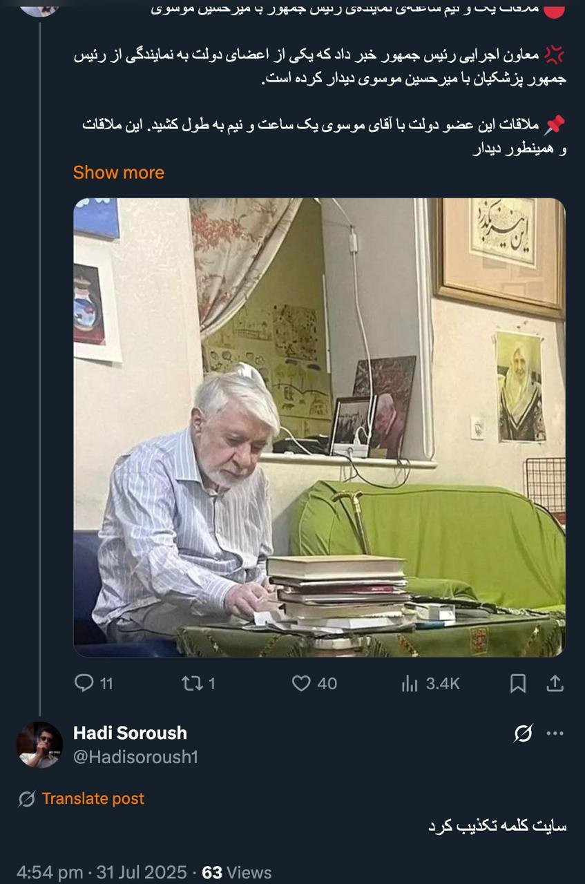 Home/PoliticsThe Executive Vice President officially announces that the President's representative has met; The kalameh denies! What is the story really?Read1 minute -Thursday 2025/07/31 - 22:14News Code:21833Share سایت کلمه تکذیب کرد— Hadi Soroush (@Hadisoroush1) July 31, 2025🔴 درودمعاون اجرایی رییس جمهور رسماً اعلام میکند نماینده رییس جمهور دیدار داشته؛ کلمه تکذیب میکند!🔸داستان واقعا چیست؟— AbdiMedia - Abdollah Abdi (@abdolah_abdi) July 31, 2025 Take less than a minute, register and share your opinion under this post.Insulting or inciting messages will be deleted.Sign UpComming Up Next I remembered Dr. Sadegh Zibakalam's speech about six months ago, when he said: If we enter into a military conflict, whether the system remains or not, not a single electric pole will remain intact in Iran - are you listening?خواندن 0 If this public announcement is not hindered like other parts of the system's security megaproject, yesخواندن 1 minute Regardless of the result of the establishment or non-continuation of the establishment of the Islamic Republic; Should the main leadership option after Ayatollah Khamenei be acted in this way?خواندن 1 minute According to the significant custom of the seminary and jurisprudence, now we have to see which jurist will perform the funeral prayer for Ayatollah Khamenei?خواندن 1 minute In the news of his appointment, I wrote that he is the commander of the camp at the same time as the deputy commander of the army corpsخواندن 1 minuteMost ReadMemories of Akbar Hashemi - February 20, 2000 - Meeting with Abdullah Jasbi and Concerns About Election ResultsMovie / Where is Commander Morteza Talaie?Akbar Hashemi's memoirs - 1999 September 10 - The two-person political negotiations with Vaez Tabasi continued until he was escorted to Tehran, where Hashemi apparently decided to seriously participate in the sixth parliamentary elections.The records of the recent periods of the Islamic Council showed that the parliament is not in charge of affairs and cannot interfere or pass resolutions on the authority of the Commander-in-Chief of the Armed Forces at any level, let alone supervise.What will be the future of Iran with the announced candidates for the presidential election? / Conversation with Dr. Taghi Azad AramakiCan I feel tired with you?A Basiji veterinarian was appointed head of the health network instead of an otolaryngologist.Akbar Hashemi's memoirs - 1999 September 5 - The meeting of the senior managers of the judiciary with Hashemi Rafsanjani and their complaint about the neglect of Hashemi Shahroudi, the new head of the judiciary, continues.Memories of Akbar Hashemi - 1999 September 7 - In continuation of the efforts of the late Vaez Tabasi, who used to encourage Hashemi to participate in the elections in frequent meetings, this time he also met with Hashemi.Akbar Hashemi's memories - 1999 September 9 - Continued visits to the belongings, buildings and works of Astan Quds