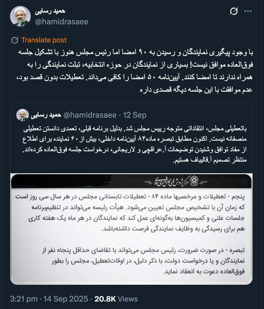 Home/PoliticsHaj Sheikh, greetings. As stated in the text of the law, it may be done; as you surely know, it is a possibility, not an obligation.Read1 minute -Monday 2025/09/15 - 04:15News Code:22601Share با وجود پیگیری نمایندگان و رسیدن به ۹۰ امضا اما رئیس مجلس هنوز با تشکیل جلسه فوقالعاده موافق نیست! بسیاری از نمایندگان در حوزه انتخابیه، تبلت نمایندگی را به همراه ندارند تا امضا کنند. آییننامه ۵۰ امضا را کافی میداند. تعطیلات بدون قصد بود، عدم موافقت با این جلسه دیگه قصدی داره https://t.co/WXevB8doR2— حمید رسایی (@hamidrasaee) September 14, 2025🔴حاج شیخدرود🔸در نص قانون آمده #میتواند و حتما مستحضرید میتواند تکلیف نیست— AbdiMedia - Abdollah Abdi (@abdolah_abdi) September 14, 2025 Take less than a minute, register and share your opinion under this post.Insulting or inciting messages will be deleted.Sign UpComming Up Next I remembered Dr. Sadegh Zibakalam's speech about six months ago, when he said: If we enter into a military conflict, whether the system remains or not, not a single electric pole will remain intact in Iran - are you listening?خواندن 0 If this public announcement is not hindered like other parts of the system's security megaproject, yesخواندن 1 minute Regardless of the result of the establishment or non-continuation of the establishment of the Islamic Republic; Should the main leadership option after Ayatollah Khamenei be acted in this way?خواندن 1 minute According to the significant custom of the seminary and jurisprudence, now we have to see which jurist will perform the funeral prayer for Ayatollah Khamenei?خواندن 1 minute In the news of his appointment, I wrote that he is the commander of the camp at the same time as the deputy commander of the army corpsخواندن 1 minuteMost ReadMemories of Akbar Hashemi - February 20, 2000 - Meeting with Abdullah Jasbi and Concerns About Election ResultsMovie / Where is Commander Morteza Talaie?Akbar Hashemi's memoirs - 1999 September 10 - The two-person political negotiations with Vaez Tabasi continued until he was escorted to Tehran, where Hashemi apparently decided to seriously participate in the sixth parliamentary elections.The records of the recent periods of the Islamic Council showed that the parliament is not in charge of affairs and cannot interfere or pass resolutions on the authority of the Commander-in-Chief of the Armed Forces at any level, let alone supervise.What will be the future of Iran with the announced candidates for the presidential election? / Conversation with Dr. Taghi Azad AramakiCan I feel tired with you?A Basiji veterinarian was appointed head of the health network instead of an otolaryngologist.Akbar Hashemi's memoirs - 1999 September 5 - The meeting of the senior managers of the judiciary with Hashemi Rafsanjani and their complaint about the neglect of Hashemi Shahroudi, the new head of the judiciary, continues.Memories of Akbar Hashemi - 1999 September 7 - In continuation of the efforts of the late Vaez Tabasi, who used to encourage Hashemi to participate in the elections in frequent meetings, this time he also met with Hashemi.Akbar Hashemi's memories - 1999 September 9 - Continued visits to the belongings, buildings and works of Astan Quds