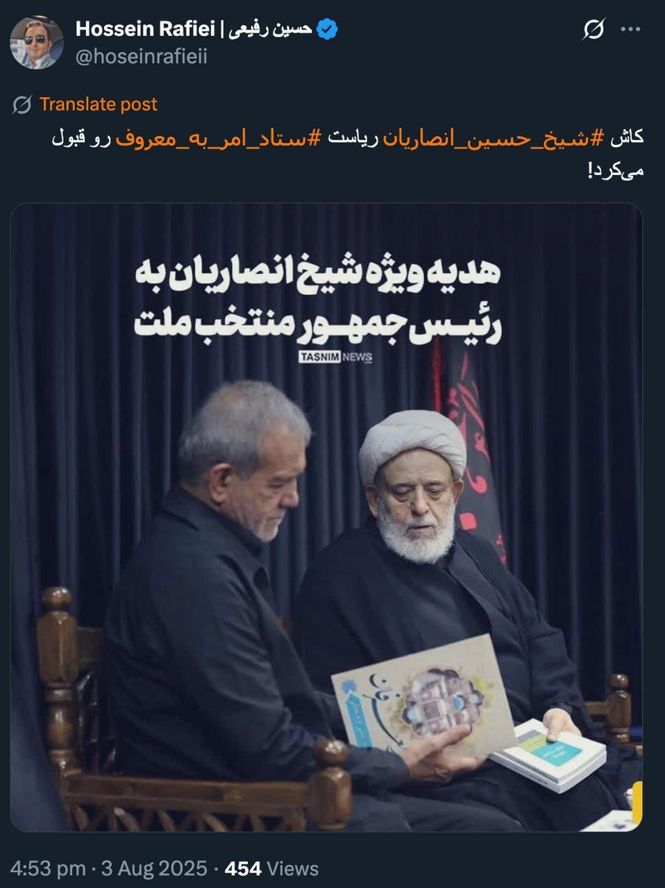 Home/PoliticsThe head of the headquarters must be one of Tehran's temporary Fridays ImamsRead1 minute -Sunday 2025/08/03 - 21:36News Code:21863Share In fact, the interim Friday Imam is credited with his legal personality, the head of the headquartersکاش #شیخ_حسین_انصاریان ریاست #ستاد_امر_به_معروف رو قبول میکرد! pic.twitter.com/EwExH2raaf— Hossein Rafiei | حسین رفیعی (@hoseinrafieii) August 3, 2025⭕️ درودریاست این ستاد حتما باید یکی از ائمه جمعه های موقت تهران باشد🔸در حقیقت امام جمعه موقت به اعتبار شخصیت حقوقی خود رییس این ستاد میشود— AbdiMedia - Abdollah Abdi (@abdolah_abdi) August 3, 2025 Take less than a minute, register and share your opinion under this post.Insulting or inciting messages will be deleted.Sign UpComming Up Next I remembered Dr. Sadegh Zibakalam's speech about six months ago, when he said: If we enter into a military conflict, whether the system remains or not, not a single electric pole will remain intact in Iran - are you listening?خواندن 0 If this public announcement is not hindered like other parts of the system's security megaproject, yesخواندن 1 minute Regardless of the result of the establishment or non-continuation of the establishment of the Islamic Republic; Should the main leadership option after Ayatollah Khamenei be acted in this way?خواندن 1 minute According to the significant custom of the seminary and jurisprudence, now we have to see which jurist will perform the funeral prayer for Ayatollah Khamenei?خواندن 1 minute In the news of his appointment, I wrote that he is the commander of the camp at the same time as the deputy commander of the army corpsخواندن 1 minuteMost ReadMemories of Akbar Hashemi - February 20, 2000 - Meeting with Abdullah Jasbi and Concerns About Election ResultsMovie / Where is Commander Morteza Talaie?Akbar Hashemi's memoirs - 1999 September 10 - The two-person political negotiations with Vaez Tabasi continued until he was escorted to Tehran, where Hashemi apparently decided to seriously participate in the sixth parliamentary elections.The records of the recent periods of the Islamic Council showed that the parliament is not in charge of affairs and cannot interfere or pass resolutions on the authority of the Commander-in-Chief of the Armed Forces at any level, let alone supervise.What will be the future of Iran with the announced candidates for the presidential election? / Conversation with Dr. Taghi Azad AramakiCan I feel tired with you?A Basiji veterinarian was appointed head of the health network instead of an otolaryngologist.Akbar Hashemi's memoirs - 1999 September 5 - The meeting of the senior managers of the judiciary with Hashemi Rafsanjani and their complaint about the neglect of Hashemi Shahroudi, the new head of the judiciary, continues.Memories of Akbar Hashemi - 1999 September 7 - In continuation of the efforts of the late Vaez Tabasi, who used to encourage Hashemi to participate in the elections in frequent meetings, this time he also met with Hashemi.Akbar Hashemi's memories - 1999 September 9 - Continued visits to the belongings, buildings and works of Astan Quds