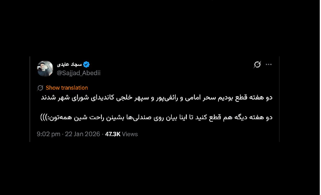 Home/PoliticsSardar Dr. Hossein Elah Akram is also there; don't forgetRead1 minute -Sunday 2026/01/25 - 07:19News Code:24258Share دو هفته قطع بودیم سحر امامی و رائفیپور و سپهر خلجی کاندیدای شورای شهر شدند دو هفته دیگه هم قطع کنید تا اینا بیان روی صندلیها بشینن راحت شین همهتون:)))— سجاد عابدی (@Sajjad_Abedii) January 22, 2026🔴سردار دکتر حسین اله اکرم هم هست؛ یادت نره— AbdiMedia - Abdollah Abdi (@abdolah_abdi) January 24, 2026 Take less than a minute, register and share your opinion under this post.Insulting or inciting messages will be deleted.Sign UpComming Up Next I remembered Dr. Sadegh Zibakalam's speech about six months ago, when he said: If we enter into a military conflict, whether the system remains or not, not a single electric pole will remain intact in Iran - are you listening?خواندن 0 If this public announcement is not hindered like other parts of the system's security megaproject, yesخواندن 1 minute Regardless of the result of the establishment or non-continuation of the establishment of the Islamic Republic; Should the main leadership option after Ayatollah Khamenei be acted in this way?خواندن 1 minute According to the significant custom of the seminary and jurisprudence, now we have to see which jurist will perform the funeral prayer for Ayatollah Khamenei?خواندن 1 minute In the news of his appointment, I wrote that he is the commander of the camp at the same time as the deputy commander of the army corpsخواندن 1 minuteMost ReadMemories of Akbar Hashemi - February 20, 2000 - Meeting with Abdullah Jasbi and Concerns About Election ResultsMovie / Where is Commander Morteza Talaie?Akbar Hashemi's memoirs - 1999 September 10 - The two-person political negotiations with Vaez Tabasi continued until he was escorted to Tehran, where Hashemi apparently decided to seriously participate in the sixth parliamentary elections.The records of the recent periods of the Islamic Council showed that the parliament is not in charge of affairs and cannot interfere or pass resolutions on the authority of the Commander-in-Chief of the Armed Forces at any level, let alone supervise.What will be the future of Iran with the announced candidates for the presidential election? / Conversation with Dr. Taghi Azad AramakiCan I feel tired with you?A Basiji veterinarian was appointed head of the health network instead of an otolaryngologist.Akbar Hashemi's memoirs - 1999 September 5 - The meeting of the senior managers of the judiciary with Hashemi Rafsanjani and their complaint about the neglect of Hashemi Shahroudi, the new head of the judiciary, continues.Memories of Akbar Hashemi - 1999 September 7 - In continuation of the efforts of the late Vaez Tabasi, who used to encourage Hashemi to participate in the elections in frequent meetings, this time he also met with Hashemi.Akbar Hashemi's memories - 1999 September 9 - Continued visits to the belongings, buildings and works of Astan Quds