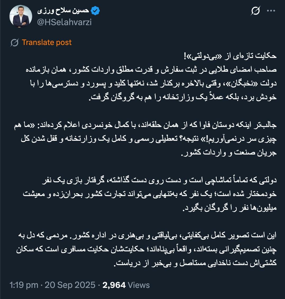 Home/PoliticsIt doesn't matter, what mountain is its back connected to and solid?Read1 minute -Saturday 2025/09/20 - 18:22News Code:22696Share حکایت تازهای از «بیدولتی»!صاحب امضای طلایی در ثبت سفارش و قدرت مطلق واردات کشور، همان بازمانده دولت «نخبگان»، وقتی بالاخره برکنار شد، نهتنها کلید و پسورد و دسترسیها را با خودش برد، بلکه عملاً یک وزارتخانه را هم به گروگان گرفت.جالبتر اینکه دوستان فاوا که از همان حلقهاند،…— حسین سلاح ورزی (@HSelahvarzi) September 20, 2025🔴 درودخودش مهم نیست، پشتش به کدام کوه وصل و محکم هست؟— AbdiMedia - Abdollah Abdi (@abdolah_abdi) September 20, 2025 Take less than a minute, register and share your opinion under this post.Insulting or inciting messages will be deleted.Sign UpComming Up Next I remembered Dr. Sadegh Zibakalam's speech about six months ago, when he said: If we enter into a military conflict, whether the system remains or not, not a single electric pole will remain intact in Iran - are you listening?خواندن 0 If this public announcement is not hindered like other parts of the system's security megaproject, yesخواندن 1 minute Regardless of the result of the establishment or non-continuation of the establishment of the Islamic Republic; Should the main leadership option after Ayatollah Khamenei be acted in this way?خواندن 1 minute According to the significant custom of the seminary and jurisprudence, now we have to see which jurist will perform the funeral prayer for Ayatollah Khamenei?خواندن 1 minute In the news of his appointment, I wrote that he is the commander of the camp at the same time as the deputy commander of the army corpsخواندن 1 minuteMost ReadMemories of Akbar Hashemi - February 20, 2000 - Meeting with Abdullah Jasbi and Concerns About Election ResultsMovie / Where is Commander Morteza Talaie?Akbar Hashemi's memoirs - 1999 September 10 - The two-person political negotiations with Vaez Tabasi continued until he was escorted to Tehran, where Hashemi apparently decided to seriously participate in the sixth parliamentary elections.The records of the recent periods of the Islamic Council showed that the parliament is not in charge of affairs and cannot interfere or pass resolutions on the authority of the Commander-in-Chief of the Armed Forces at any level, let alone supervise.What will be the future of Iran with the announced candidates for the presidential election? / Conversation with Dr. Taghi Azad AramakiCan I feel tired with you?A Basiji veterinarian was appointed head of the health network instead of an otolaryngologist.Akbar Hashemi's memoirs - 1999 September 5 - The meeting of the senior managers of the judiciary with Hashemi Rafsanjani and their complaint about the neglect of Hashemi Shahroudi, the new head of the judiciary, continues.Memories of Akbar Hashemi - 1999 September 7 - In continuation of the efforts of the late Vaez Tabasi, who used to encourage Hashemi to participate in the elections in frequent meetings, this time he also met with Hashemi.Akbar Hashemi's memories - 1999 September 9 - Continued visits to the belongings, buildings and works of Astan Quds