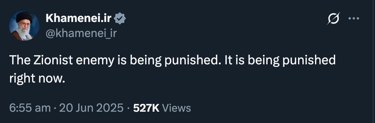 Home/PoliticsThe account of the leader of the Islamic Republic wrote on the social network X: Israel is currently being punished.Read0 -Sunday 2025/07/13 - 07:40News Code:20028Share Take less than a minute, register and share your opinion under this post.Insulting or inciting messages will be deleted.Sign UpComming Up Next Twitter responses on Februaryخواندن 2 minutes Mr. Ashna, greetings. Are you also examining the theory that this U.S. military mobilization might ultimately have a target other than the Islamic Republic?خواندن 1 minute The matter is perfectly clear. They were released following a directive from the Judiciary, and this directive was followed up with such speed that bail was accepted and they were released even on a holiday.خواندن 1 minute Dr., greetings. What was the outcome of the Medical Examiner's (Forensic Medicine) report that the family was pursuing through the Prosecutor's Office?خواندن 1 minute Twitter responses on Februaryخواندن 4 minutesMost ReadMemories of Akbar Hashemi - February 20, 2000 - Meeting with Abdullah Jasbi and Concerns About Election ResultsMovie / Where is Commander Morteza Talaie?Akbar Hashemi's memoirs - 1999 September 10 - The two-person political negotiations with Vaez Tabasi continued until he was escorted to Tehran, where Hashemi apparently decided to seriously participate in the sixth parliamentary elections.The records of the recent periods of the Islamic Council showed that the parliament is not in charge of affairs and cannot interfere or pass resolutions on the authority of the Commander-in-Chief of the Armed Forces at any level, let alone supervise.What will be the future of Iran with the announced candidates for the presidential election? / Conversation with Dr. Taghi Azad AramakiCan I feel tired with you?A Basiji veterinarian was appointed head of the health network instead of an otolaryngologist.Akbar Hashemi's memoirs - 1999 September 5 - The meeting of the senior managers of the judiciary with Hashemi Rafsanjani and their complaint about the neglect of Hashemi Shahroudi, the new head of the judiciary, continues.Memories of Akbar Hashemi - 1999 September 7 - In continuation of the efforts of the late Vaez Tabasi, who used to encourage Hashemi to participate in the elections in frequent meetings, this time he also met with Hashemi.Akbar Hashemi's memories - 1999 September 9 - Continued visits to the belongings, buildings and works of Astan Quds