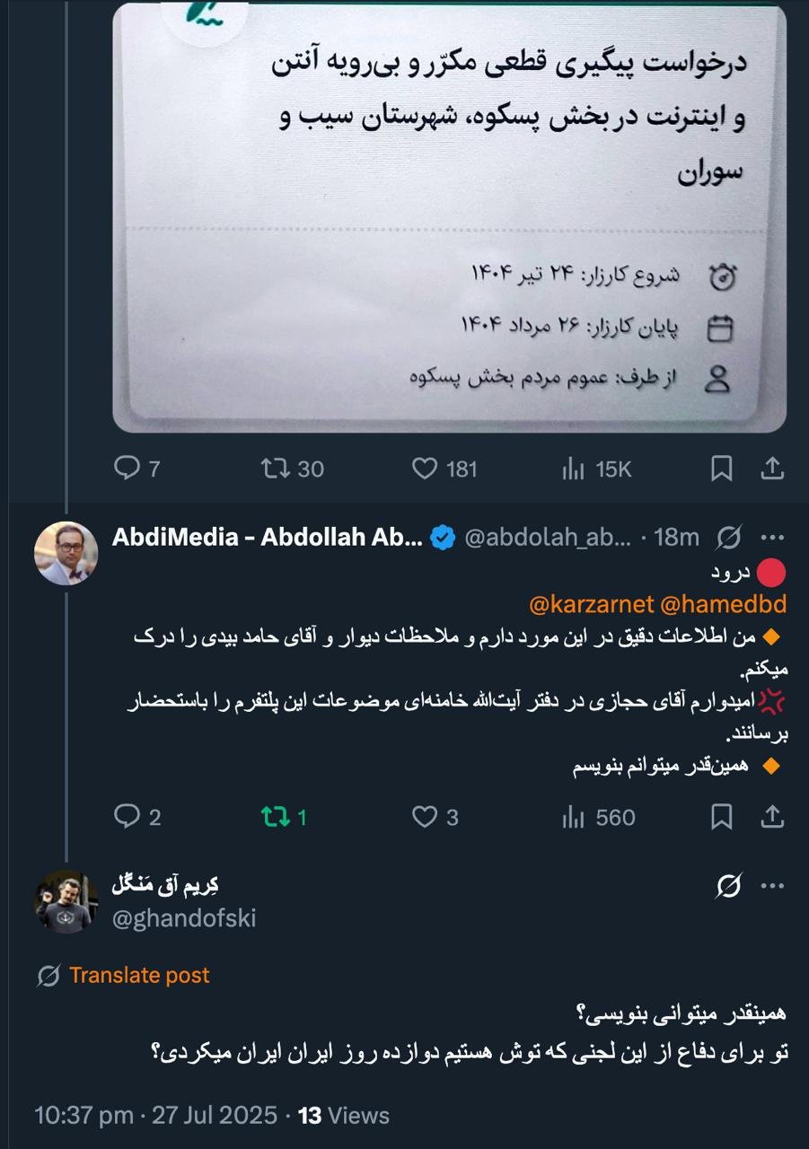 Home/PoliticsBecause Mr. Hamed Bidi and the campaign did not publish a story, I do not know if my information is published or against them?Read1 minute -Monday 2025/07/28 - 11:54News Code:21790Share So I just solve the campaign's problems and the like they can't So I only know the problems of the campaign and the like that cannot be publicly addressed at the level of Mr. Seyyed Ali Asghar Hejazi and reported to the Supreme Leader of the Islamic Republic.همینقدر میتوانی بنویسی؟تو برای دفاع از این لجنی که توش هستیم دوازده روز ایران ایران میکردی؟— کِریم آق مَنگُل (@ghandofski) July 27, 2025🔴درود @SeyedmehrdadS @m_fazaeli چون آقای حامد بیدی و کارزار مطلبی را منتشر نکردند بنده نمیدانم انتشار اطلاعات من بر له آنها خواهد بود یا علیه آنها؟🔸بنابراین من هم #فقط حل مشکلات کارزار و #مانند_آنها را که نمیتوانند به #مصلحت مطالبی را علنی بگویند در سطح آقای سید علی اصغر…— AbdiMedia - Abdollah Abdi (@abdolah_abdi) July 27, 2025Related news I have detailed information about this and I understand the wall and Mr. Hamed Bidi's considerations Take less than a minute, register and share your opinion under this post.Insulting or inciting messages will be deleted.Sign UpComming Up Next I remembered Dr. Sadegh Zibakalam's speech about six months ago, when he said: If we enter into a military conflict, whether the system remains or not, not a single electric pole will remain intact in Iran - are you listening?خواندن 0 If this public announcement is not hindered like other parts of the system's security megaproject, yesخواندن 1 minute Regardless of the result of the establishment or non-continuation of the establishment of the Islamic Republic; Should the main leadership option after Ayatollah Khamenei be acted in this way?خواندن 1 minute According to the significant custom of the seminary and jurisprudence, now we have to see which jurist will perform the funeral prayer for Ayatollah Khamenei?خواندن 1 minute In the news of his appointment, I wrote that he is the commander of the camp at the same time as the deputy commander of the army corpsخواندن 1 minuteMost ReadMemories of Akbar Hashemi - February 20, 2000 - Meeting with Abdullah Jasbi and Concerns About Election ResultsMovie / Where is Commander Morteza Talaie?Akbar Hashemi's memoirs - 1999 September 10 - The two-person political negotiations with Vaez Tabasi continued until he was escorted to Tehran, where Hashemi apparently decided to seriously participate in the sixth parliamentary elections.The records of the recent periods of the Islamic Council showed that the parliament is not in charge of affairs and cannot interfere or pass resolutions on the authority of the Commander-in-Chief of the Armed Forces at any level, let alone supervise.What will be the future of Iran with the announced candidates for the presidential election? / Conversation with Dr. Taghi Azad AramakiCan I feel tired with you?A Basiji veterinarian was appointed head of the health network instead of an otolaryngologist.Akbar Hashemi's memoirs - 1999 September 5 - The meeting of the senior managers of the judiciary with Hashemi Rafsanjani and their complaint about the neglect of Hashemi Shahroudi, the new head of the judiciary, continues.Memories of Akbar Hashemi - 1999 September 7 - In continuation of the efforts of the late Vaez Tabasi, who used to encourage Hashemi to participate in the elections in frequent meetings, this time he also met with Hashemi.Akbar Hashemi's memories - 1999 September 9 - Continued visits to the belongings, buildings and works of Astan Quds