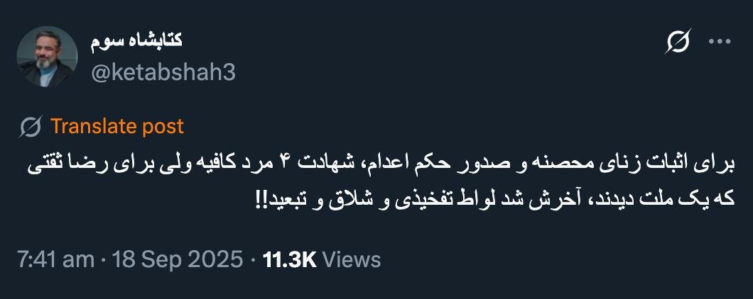 Home/PoliticsThe major policy of the Islamic Republic for years, apart from intentional murder, retribution, and rape, appears to have been that in cases where Islamic legal limits (Hudud) are proven, judges lead to doubts as much as possible Read1 minute -Saturday 2025/09/20 - 16:10News Code:22657Share thus avoiding strict application.برای اثبات زنای محصنه و صدور حکم اعدام، شهادت ۴ مرد کافیه ولی برای رضا ثقتی که یک ملت دیدند، آخرش شد لواط تفخیذی و شلاق و تبعید!!— کتابشاه سوم (@ketabshah3) September 18, 2025🔴 درودبدون توجه به مصداق نامبرده، سالهاست جز قتل عمد و قصاص و تجاوز به عنف گویا سیاست کلان جمهوری اسلامی اینست در موارد اثبات حدود شرعی تا جایی که ممکن است قضات به شبهه دلالت کنند.— AbdiMedia - Abdollah Abdi (@abdolah_abdi) September 18, 2025 Take less than a minute, register and share your opinion under this post.Insulting or inciting messages will be deleted.Sign UpComming Up Next I remembered Dr. Sadegh Zibakalam's speech about six months ago, when he said: If we enter into a military conflict, whether the system remains or not, not a single electric pole will remain intact in Iran - are you listening?خواندن 0 If this public announcement is not hindered like other parts of the system's security megaproject, yesخواندن 1 minute Regardless of the result of the establishment or non-continuation of the establishment of the Islamic Republic; Should the main leadership option after Ayatollah Khamenei be acted in this way?خواندن 1 minute According to the significant custom of the seminary and jurisprudence, now we have to see which jurist will perform the funeral prayer for Ayatollah Khamenei?خواندن 1 minute In the news of his appointment, I wrote that he is the commander of the camp at the same time as the deputy commander of the army corpsخواندن 1 minuteMost ReadMemories of Akbar Hashemi - February 20, 2000 - Meeting with Abdullah Jasbi and Concerns About Election ResultsMovie / Where is Commander Morteza Talaie?Akbar Hashemi's memoirs - 1999 September 10 - The two-person political negotiations with Vaez Tabasi continued until he was escorted to Tehran, where Hashemi apparently decided to seriously participate in the sixth parliamentary elections.The records of the recent periods of the Islamic Council showed that the parliament is not in charge of affairs and cannot interfere or pass resolutions on the authority of the Commander-in-Chief of the Armed Forces at any level, let alone supervise.What will be the future of Iran with the announced candidates for the presidential election? / Conversation with Dr. Taghi Azad AramakiCan I feel tired with you?A Basiji veterinarian was appointed head of the health network instead of an otolaryngologist.Akbar Hashemi's memoirs - 1999 September 5 - The meeting of the senior managers of the judiciary with Hashemi Rafsanjani and their complaint about the neglect of Hashemi Shahroudi, the new head of the judiciary, continues.Memories of Akbar Hashemi - 1999 September 7 - In continuation of the efforts of the late Vaez Tabasi, who used to encourage Hashemi to participate in the elections in frequent meetings, this time he also met with Hashemi.Akbar Hashemi's memories - 1999 September 9 - Continued visits to the belongings, buildings and works of Astan Quds