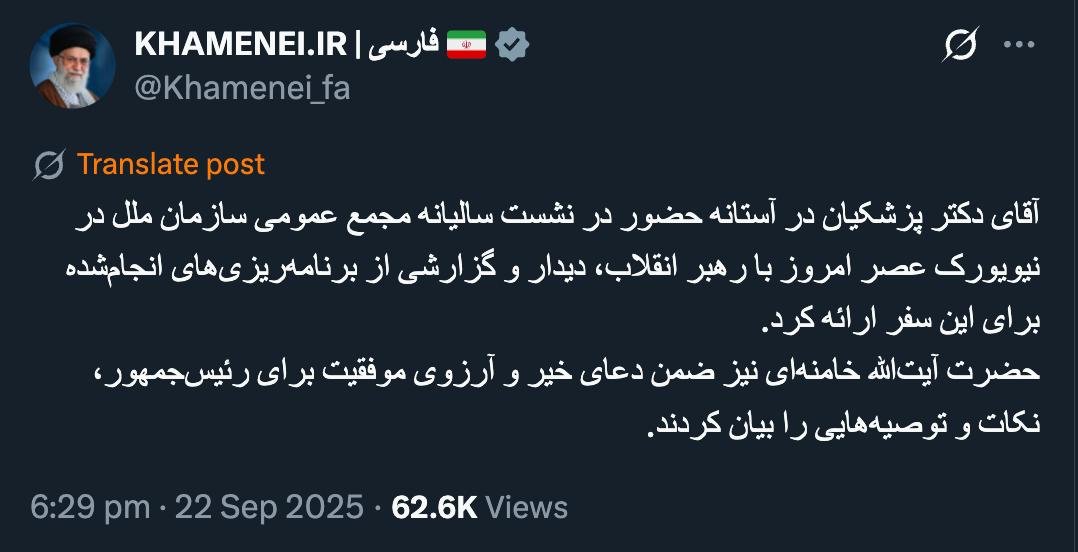 Home/PoliticsI wish the recommendations regarding planning were intentionally made a little more transparent and publicRead1 minute -Wednesday 2025/09/24 - 14:36News Code:22750Share آقای دکتر پزشکیان در آستانه حضور در نشست سالیانه مجمع عمومی سازمان ملل در نیویورک عصر امروز با رهبر انقلاب، دیدار و گزارشی از برنامهریزیهای انجامشده برای این سفر ارائه کرد.حضرت آیتالله خامنهای نیز ضمن دعای خیر و آرزوی موفقیت برای رئیسجمهور، نکات و توصیههایی را بیان کردند.— KHAMENEI.IR | فارسی 🇮🇷 (@Khamenei_fa) September 22, 2025🔴 درودتوصیه ها در خصوص #برنامه_ریزی ها کاش #تعمداً کمی شفاف و رسانه ای میشد#کاش...— AbdiMedia - Abdollah Abdi (@abdolah_abdi) September 22, 2025 Take less than a minute, register and share your opinion under this post.Insulting or inciting messages will be deleted.Sign UpComming Up Next Twitter responses on Februaryخواندن 4 minutes What is really going on inside the country?خواندن 1 minute Confirmation of Abdi Media's notes regarding secret negotiations between the United States and the Islamic Republic by the Ministry of Intelligence's Foreign Intelligence and Movements Organization.خواندن 1 minute Will the day ever come when the accurate narrative of the Jame'eh group's arrest is told? The plans they had, which were thwarted by the meeting between the mother of the Jalaeipour martyrs and Ayatollah Khamenei,خواندن 1 minute Mr. Ambassador of the Islamic Republic, greetings. Does the realization of this seriousness also have a timeframe?خواندن 1 minuteMost ReadMemories of Akbar Hashemi - February 20, 2000 - Meeting with Abdullah Jasbi and Concerns About Election ResultsMovie / Where is Commander Morteza Talaie?Akbar Hashemi's memoirs - 1999 September 10 - The two-person political negotiations with Vaez Tabasi continued until he was escorted to Tehran, where Hashemi apparently decided to seriously participate in the sixth parliamentary elections.The records of the recent periods of the Islamic Council showed that the parliament is not in charge of affairs and cannot interfere or pass resolutions on the authority of the Commander-in-Chief of the Armed Forces at any level, let alone supervise.What will be the future of Iran with the announced candidates for the presidential election? / Conversation with Dr. Taghi Azad AramakiCan I feel tired with you?A Basiji veterinarian was appointed head of the health network instead of an otolaryngologist.Akbar Hashemi's memoirs - 1999 September 5 - The meeting of the senior managers of the judiciary with Hashemi Rafsanjani and their complaint about the neglect of Hashemi Shahroudi, the new head of the judiciary, continues.Memories of Akbar Hashemi - 1999 September 7 - In continuation of the efforts of the late Vaez Tabasi, who used to encourage Hashemi to participate in the elections in frequent meetings, this time he also met with Hashemi.Akbar Hashemi's memories - 1999 September 9 - Continued visits to the belongings, buildings and works of Astan Quds