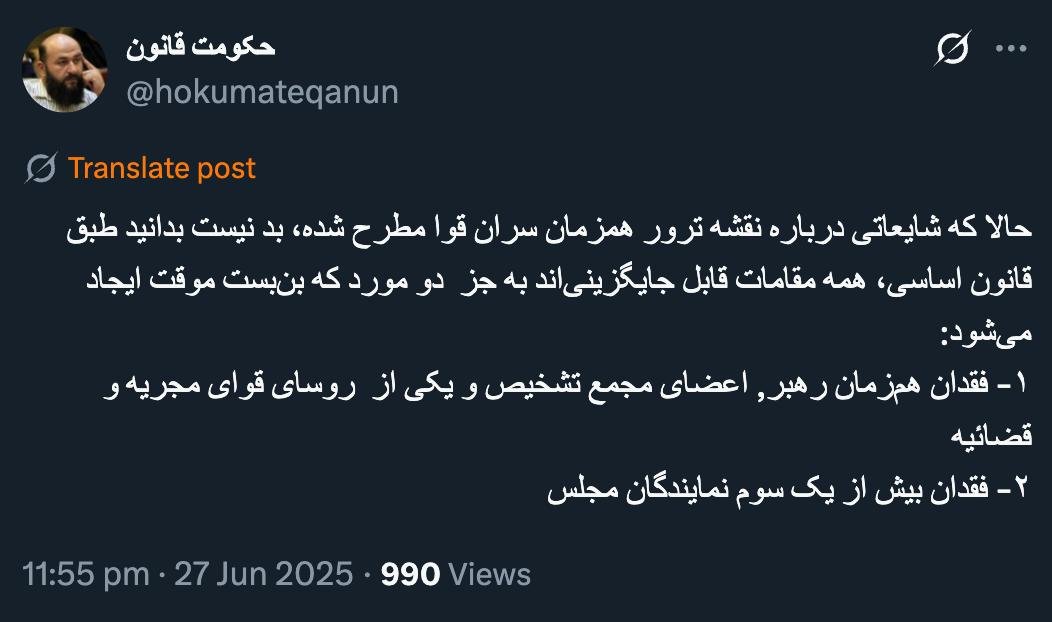 Home/PoliticsWhat happens to the legal assumption of the lack or presence of leadership experts to elect a leader?Read1 minute -Wednesday 2025/07/16 - 13:03News Code:20406Share حالا که شایعاتی درباره نقشه ترور همزمان سران قوا مطرح شده، بد نیست بدانید طبق قانون اساسی، همه مقامات قابل جایگزینیاند به جز دو مورد که بنبست موقت ایجاد میشود:۱- فقدان همزمان رهبر, اعضای مجمع تشخیص و یکی از روسای قوای مجریه و قضائیه ۲- فقدان بیش از یک سوم نمایندگان مجلس— حکومت قانون (@hokumateqanun) June 27, 2025🔴 دروددر فرض عدم وجود یا حضور خبرگان رهبری برای انتخاب رهبر از لحاظ حقوقی چه میشود؟— AbdiMedia - Abdollah Abdi (@abdolah_abdi) June 28, 2025 Take less than a minute, register and share your opinion under this post.Insulting or inciting messages will be deleted.Sign UpComming Up Next I remembered Dr. Sadegh Zibakalam's speech about six months ago, when he said: If we enter into a military conflict, whether the system remains or not, not a single electric pole will remain intact in Iran - are you listening?خواندن 0 If this public announcement is not hindered like other parts of the system's security megaproject, yesخواندن 1 minute Regardless of the result of the establishment or non-continuation of the establishment of the Islamic Republic; Should the main leadership option after Ayatollah Khamenei be acted in this way?خواندن 1 minute According to the significant custom of the seminary and jurisprudence, now we have to see which jurist will perform the funeral prayer for Ayatollah Khamenei?خواندن 1 minute In the news of his appointment, I wrote that he is the commander of the camp at the same time as the deputy commander of the army corpsخواندن 1 minuteMost ReadMemories of Akbar Hashemi - February 20, 2000 - Meeting with Abdullah Jasbi and Concerns About Election ResultsMovie / Where is Commander Morteza Talaie?Akbar Hashemi's memoirs - 1999 September 10 - The two-person political negotiations with Vaez Tabasi continued until he was escorted to Tehran, where Hashemi apparently decided to seriously participate in the sixth parliamentary elections.The records of the recent periods of the Islamic Council showed that the parliament is not in charge of affairs and cannot interfere or pass resolutions on the authority of the Commander-in-Chief of the Armed Forces at any level, let alone supervise.What will be the future of Iran with the announced candidates for the presidential election? / Conversation with Dr. Taghi Azad AramakiCan I feel tired with you?A Basiji veterinarian was appointed head of the health network instead of an otolaryngologist.Akbar Hashemi's memoirs - 1999 September 5 - The meeting of the senior managers of the judiciary with Hashemi Rafsanjani and their complaint about the neglect of Hashemi Shahroudi, the new head of the judiciary, continues.Memories of Akbar Hashemi - 1999 September 7 - In continuation of the efforts of the late Vaez Tabasi, who used to encourage Hashemi to participate in the elections in frequent meetings, this time he also met with Hashemi.Akbar Hashemi's memories - 1999 September 9 - Continued visits to the belongings, buildings and works of Astan Quds