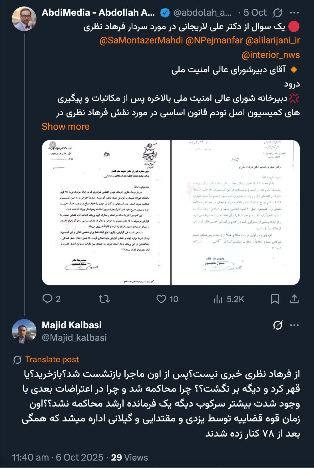 Home/PoliticsTwitter replies for October 7Read1 minute -Wednesday 2025/10/08 - 13:18News Code:22983Share It is and the site has its own name, and at a ceremony in the presence of Sardar Radan. The reason for the lack of summons of senior military and law enforcement commanders is the legal restriction on the Criminal Procedure Code, which I mentioned in another note entitled Sardar Ahmad Vahidi in Abdi Media.از فرهاد نظری خبری نیست؟پس از اون ماجرا بازنشست شد؟بازخرید؟یا قهر کرد و دیگه بر نگشت؟؟ چرا محاکمه شد و چرا در اعتراضات بعدی با وجود شدت بیشتر سرکوب دیگه یک فرمانده ارشد محاکمه نشد؟؟اون زمان قوه قضاییه توسط یزدی و مقتدایی و گیلانی اداره میشد که همگی بعد از ۷۸ کنار زده شدند— Majid Kalbasi (@Majid_kalbasi) October 6, 2025🔴 درودهست و سایت هم بنام خودش دارد واخیرا هم دریک مراسم در حضور سردار رادان سخنرانی کرده بود💢 علت عدم احضار فرماندهان ارشد نظامی و انتظامی هم محدودیت قانونی در آیین دادرسی کیفری است که در یادداشت دیگری تحت عنوان راه سخت احضار سردار احمد وحیدی در عبدی مدیا به آن اشاره کردم— AbdiMedia - Abdollah Abdi (@abdolah_abdi) October 7, 2025Related news A question for Dr. Ali Larijani about Sardar Farhad Nazari Take less than a minute, register and share your opinion under this post.Insulting or inciting messages will be deleted.Sign UpComming Up Next I remembered Dr. Sadegh Zibakalam's speech about six months ago, when he said: If we enter into a military conflict, whether the system remains or not, not a single electric pole will remain intact in Iran - are you listening?خواندن 0 If this public announcement is not hindered like other parts of the system's security megaproject, yesخواندن 1 minute Regardless of the result of the establishment or non-continuation of the establishment of the Islamic Republic; Should the main leadership option after Ayatollah Khamenei be acted in this way?خواندن 1 minute According to the significant custom of the seminary and jurisprudence, now we have to see which jurist will perform the funeral prayer for Ayatollah Khamenei?خواندن 1 minute In the news of his appointment, I wrote that he is the commander of the camp at the same time as the deputy commander of the army corpsخواندن 1 minuteMost ReadMemories of Akbar Hashemi - February 20, 2000 - Meeting with Abdullah Jasbi and Concerns About Election ResultsMovie / Where is Commander Morteza Talaie?Akbar Hashemi's memoirs - 1999 September 10 - The two-person political negotiations with Vaez Tabasi continued until he was escorted to Tehran, where Hashemi apparently decided to seriously participate in the sixth parliamentary elections.The records of the recent periods of the Islamic Council showed that the parliament is not in charge of affairs and cannot interfere or pass resolutions on the authority of the Commander-in-Chief of the Armed Forces at any level, let alone supervise.What will be the future of Iran with the announced candidates for the presidential election? / Conversation with Dr. Taghi Azad AramakiCan I feel tired with you?A Basiji veterinarian was appointed head of the health network instead of an otolaryngologist.Akbar Hashemi's memoirs - 1999 September 5 - The meeting of the senior managers of the judiciary with Hashemi Rafsanjani and their complaint about the neglect of Hashemi Shahroudi, the new head of the judiciary, continues.Memories of Akbar Hashemi - 1999 September 7 - In continuation of the efforts of the late Vaez Tabasi, who used to encourage Hashemi to participate in the elections in frequent meetings, this time he also met with Hashemi.Akbar Hashemi's memories - 1999 September 9 - Continued visits to the belongings, buildings and works of Astan Quds