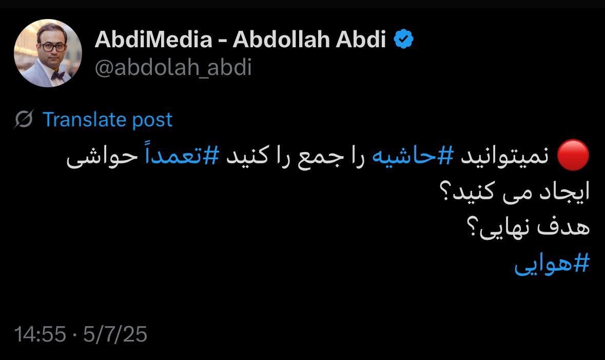Home/PoliticsCan't plural the margin you deliberately create the edges? The ultimate goal?Read1 minute -Monday 2025/07/14 - 22:33News Code:20937Share Air Take less than a minute, register and share your opinion under this post.Insulting or inciting messages will be deleted.Sign UpComming Up Next I remembered Dr. Sadegh Zibakalam's speech about six months ago, when he said: If we enter into a military conflict, whether the system remains or not, not a single electric pole will remain intact in Iran - are you listening?خواندن 0 If this public announcement is not hindered like other parts of the system's security megaproject, yesخواندن 1 minute Regardless of the result of the establishment or non-continuation of the establishment of the Islamic Republic; Should the main leadership option after Ayatollah Khamenei be acted in this way?خواندن 1 minute According to the significant custom of the seminary and jurisprudence, now we have to see which jurist will perform the funeral prayer for Ayatollah Khamenei?خواندن 1 minute In the news of his appointment, I wrote that he is the commander of the camp at the same time as the deputy commander of the army corpsخواندن 1 minuteMost ReadMemories of Akbar Hashemi - February 20, 2000 - Meeting with Abdullah Jasbi and Concerns About Election ResultsMovie / Where is Commander Morteza Talaie?Akbar Hashemi's memoirs - 1999 September 10 - The two-person political negotiations with Vaez Tabasi continued until he was escorted to Tehran, where Hashemi apparently decided to seriously participate in the sixth parliamentary elections.The records of the recent periods of the Islamic Council showed that the parliament is not in charge of affairs and cannot interfere or pass resolutions on the authority of the Commander-in-Chief of the Armed Forces at any level, let alone supervise.What will be the future of Iran with the announced candidates for the presidential election? / Conversation with Dr. Taghi Azad AramakiCan I feel tired with you?A Basiji veterinarian was appointed head of the health network instead of an otolaryngologist.Akbar Hashemi's memoirs - 1999 September 5 - The meeting of the senior managers of the judiciary with Hashemi Rafsanjani and their complaint about the neglect of Hashemi Shahroudi, the new head of the judiciary, continues.Memories of Akbar Hashemi - 1999 September 7 - In continuation of the efforts of the late Vaez Tabasi, who used to encourage Hashemi to participate in the elections in frequent meetings, this time he also met with Hashemi.Akbar Hashemi's memories - 1999 September 9 - Continued visits to the belongings, buildings and works of Astan Quds
