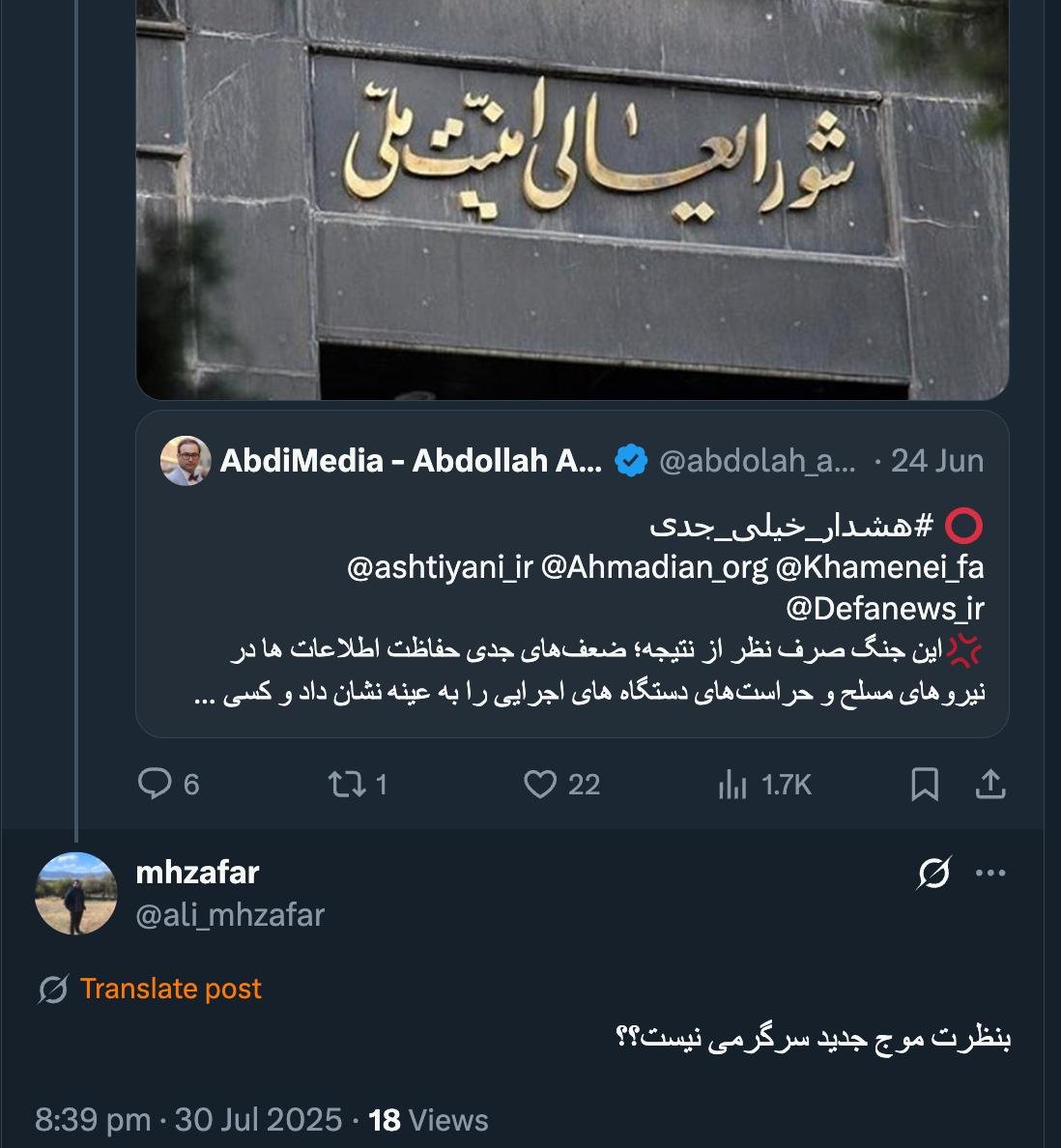 Home/PoliticsSecurity changes, if implemented, are not fun.Read1 minute -Thursday 2025/07/31 - 11:43News Code:21823Share بنظرت موج جدید سرگرمی نیست؟؟— mhzafar (@ali_mhzafar) July 30, 2025🔴 درودتغییرات #امنیتی اگر اعمال شود سرگرمی نیست— AbdiMedia - Abdollah Abdi (@abdolah_abdi) July 30, 2025Related news Has the Ayatollah realized the need for reforms in the security apparatus? Take less than a minute, register and share your opinion under this post.Insulting or inciting messages will be deleted.Sign UpComming Up Next I remembered Dr. Sadegh Zibakalam's speech about six months ago, when he said: If we enter into a military conflict, whether the system remains or not, not a single electric pole will remain intact in Iran - are you listening?خواندن 0 If this public announcement is not hindered like other parts of the system's security megaproject, yesخواندن 1 minute Regardless of the result of the establishment or non-continuation of the establishment of the Islamic Republic; Should the main leadership option after Ayatollah Khamenei be acted in this way?خواندن 1 minute According to the significant custom of the seminary and jurisprudence, now we have to see which jurist will perform the funeral prayer for Ayatollah Khamenei?خواندن 1 minute In the news of his appointment, I wrote that he is the commander of the camp at the same time as the deputy commander of the army corpsخواندن 1 minuteMost ReadMemories of Akbar Hashemi - February 20, 2000 - Meeting with Abdullah Jasbi and Concerns About Election ResultsMovie / Where is Commander Morteza Talaie?Akbar Hashemi's memoirs - 1999 September 10 - The two-person political negotiations with Vaez Tabasi continued until he was escorted to Tehran, where Hashemi apparently decided to seriously participate in the sixth parliamentary elections.The records of the recent periods of the Islamic Council showed that the parliament is not in charge of affairs and cannot interfere or pass resolutions on the authority of the Commander-in-Chief of the Armed Forces at any level, let alone supervise.What will be the future of Iran with the announced candidates for the presidential election? / Conversation with Dr. Taghi Azad AramakiCan I feel tired with you?A Basiji veterinarian was appointed head of the health network instead of an otolaryngologist.Akbar Hashemi's memoirs - 1999 September 5 - The meeting of the senior managers of the judiciary with Hashemi Rafsanjani and their complaint about the neglect of Hashemi Shahroudi, the new head of the judiciary, continues.Memories of Akbar Hashemi - 1999 September 7 - In continuation of the efforts of the late Vaez Tabasi, who used to encourage Hashemi to participate in the elections in frequent meetings, this time he also met with Hashemi.Akbar Hashemi's memories - 1999 September 9 - Continued visits to the belongings, buildings and works of Astan Quds