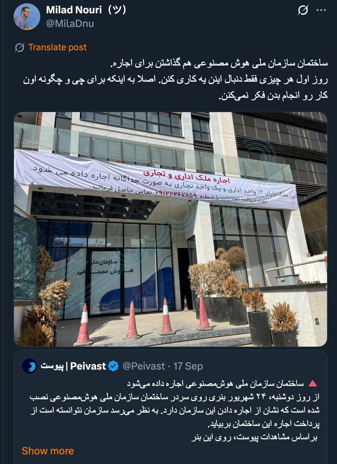 Home/PoliticsI really don’t know what to say.Read1 minute -Saturday 2025/09/20 - 03:18News Code:22663Share ساختمان سازمان ملی هوش مصنوعی هم گذاشتن برای اجاره.روز اول هر چیزی فقط دنبال اینن یه کاری کنن. اصلا به اینکه برای چی و چگونه اون کار رو انجام بدن فکر نمیکنن. https://t.co/k5bPeVDvHj pic.twitter.com/DLhuJZEd4o— Milad Nouri(ツ) (@MilaDnu) September 18, 2025🔴 درودواقعا نمیدانم چه باید گفت؟— AbdiMedia - Abdollah Abdi (@abdolah_abdi) September 18, 2025 Take less than a minute, register and share your opinion under this post.Insulting or inciting messages will be deleted.Sign UpComming Up Next I remembered Dr. Sadegh Zibakalam's speech about six months ago, when he said: If we enter into a military conflict, whether the system remains or not, not a single electric pole will remain intact in Iran - are you listening?خواندن 0 If this public announcement is not hindered like other parts of the system's security megaproject, yesخواندن 1 minute Regardless of the result of the establishment or non-continuation of the establishment of the Islamic Republic; Should the main leadership option after Ayatollah Khamenei be acted in this way?خواندن 1 minute According to the significant custom of the seminary and jurisprudence, now we have to see which jurist will perform the funeral prayer for Ayatollah Khamenei?خواندن 1 minute In the news of his appointment, I wrote that he is the commander of the camp at the same time as the deputy commander of the army corpsخواندن 1 minuteMost ReadMemories of Akbar Hashemi - February 20, 2000 - Meeting with Abdullah Jasbi and Concerns About Election ResultsMovie / Where is Commander Morteza Talaie?Akbar Hashemi's memoirs - 1999 September 10 - The two-person political negotiations with Vaez Tabasi continued until he was escorted to Tehran, where Hashemi apparently decided to seriously participate in the sixth parliamentary elections.The records of the recent periods of the Islamic Council showed that the parliament is not in charge of affairs and cannot interfere or pass resolutions on the authority of the Commander-in-Chief of the Armed Forces at any level, let alone supervise.What will be the future of Iran with the announced candidates for the presidential election? / Conversation with Dr. Taghi Azad AramakiCan I feel tired with you?A Basiji veterinarian was appointed head of the health network instead of an otolaryngologist.Akbar Hashemi's memoirs - 1999 September 5 - The meeting of the senior managers of the judiciary with Hashemi Rafsanjani and their complaint about the neglect of Hashemi Shahroudi, the new head of the judiciary, continues.Memories of Akbar Hashemi - 1999 September 7 - In continuation of the efforts of the late Vaez Tabasi, who used to encourage Hashemi to participate in the elections in frequent meetings, this time he also met with Hashemi.Akbar Hashemi's memories - 1999 September 9 - Continued visits to the belongings, buildings and works of Astan Quds
