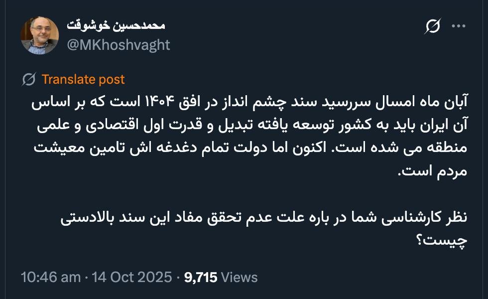 Home/PoliticsDidn't 2025 change to 2041?Read1 minute -Wednesday 2025/10/15 - 15:10News Code:23050Share آبان ماه امسال سررسید سند چشم انداز در افق ۱۴۰۴ است که بر اساس آن ایران باید به کشور توسعه یافته تبدیل و قدرت اول اقتصادی و علمی منطقه می شده است. اکنون اما دولت تمام دغدغه اش تامین معیشت مردم است.نظر کارشناسی شما در باره علت عدم تحقق مفاد این سند بالادستی چیست؟— محمدحسین خوشوقت (@MKhoshvaght) October 14, 2025🔴 درود۱۴۰۴ به ۱۴۲۰ تغییر نکرده؟— AbdiMedia - Abdollah Abdi (@abdolah_abdi) October 14, 2025 Take less than a minute, register and share your opinion under this post.Insulting or inciting messages will be deleted.Sign UpComming Up Next I remembered Dr. Sadegh Zibakalam's speech about six months ago, when he said: If we enter into a military conflict, whether the system remains or not, not a single electric pole will remain intact in Iran - are you listening?خواندن 0 If this public announcement is not hindered like other parts of the system's security megaproject, yesخواندن 1 minute Regardless of the result of the establishment or non-continuation of the establishment of the Islamic Republic; Should the main leadership option after Ayatollah Khamenei be acted in this way?خواندن 1 minute According to the significant custom of the seminary and jurisprudence, now we have to see which jurist will perform the funeral prayer for Ayatollah Khamenei?خواندن 1 minute In the news of his appointment, I wrote that he is the commander of the camp at the same time as the deputy commander of the army corpsخواندن 1 minuteMost ReadMemories of Akbar Hashemi - February 20, 2000 - Meeting with Abdullah Jasbi and Concerns About Election ResultsMovie / Where is Commander Morteza Talaie?Akbar Hashemi's memoirs - 1999 September 10 - The two-person political negotiations with Vaez Tabasi continued until he was escorted to Tehran, where Hashemi apparently decided to seriously participate in the sixth parliamentary elections.The records of the recent periods of the Islamic Council showed that the parliament is not in charge of affairs and cannot interfere or pass resolutions on the authority of the Commander-in-Chief of the Armed Forces at any level, let alone supervise.What will be the future of Iran with the announced candidates for the presidential election? / Conversation with Dr. Taghi Azad AramakiCan I feel tired with you?A Basiji veterinarian was appointed head of the health network instead of an otolaryngologist.Akbar Hashemi's memoirs - 1999 September 5 - The meeting of the senior managers of the judiciary with Hashemi Rafsanjani and their complaint about the neglect of Hashemi Shahroudi, the new head of the judiciary, continues.Memories of Akbar Hashemi - 1999 September 7 - In continuation of the efforts of the late Vaez Tabasi, who used to encourage Hashemi to participate in the elections in frequent meetings, this time he also met with Hashemi.Akbar Hashemi's memories - 1999 September 9 - Continued visits to the belongings, buildings and works of Astan Quds