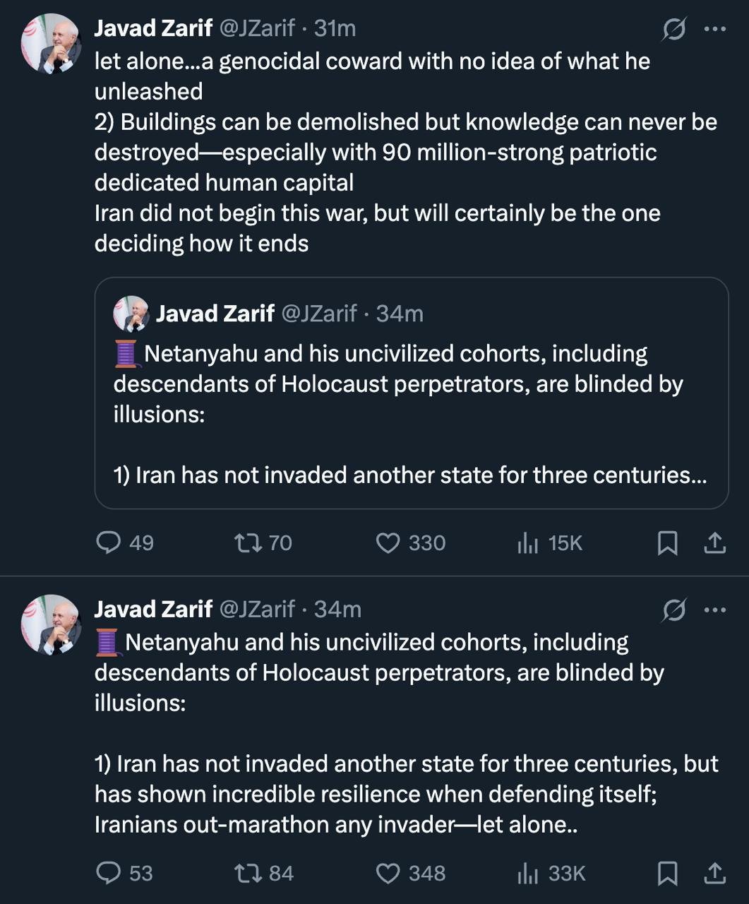 Home/PoliticsMohammad Javad Zarif wrote in his latest Twitter post: Netanyahu and his unconscious accomplices, including the descendants of the Holocaust agents, have been blinded with illusions.Read1 minute -Saturday 2025/07/12 - 20:11News Code:20003Share Iran did not start this war, but it will certainly be the one who decides how to finish. Netanyahu and his unconscious accomplices, including the descendants of the Holocaust agents, have been blinded with illusions:2) Iran has not attacked another country for three centuries, but has shown an incredible self -resistance in defense; The Iranians drive every striker from the field - let alone a genocide coward who has no idea of what he has begun.2) Buildings can be destroyed, but knowledge can never be destroyed - especially with the human capital of ninety million patriots and sacrifices.Iran did not start this war, but it will certainly be the one who decides how to finish. Take less than a minute, register and share your opinion under this post.Insulting or inciting messages will be deleted.Sign UpComming Up Next Mr. Ashna, greetings. Are you also examining the theory that this U.S. military mobilization might ultimately have a target other than the Islamic Republic?خواندن 1 minute The matter is perfectly clear. They were released following a directive from the Judiciary, and this directive was followed up with such speed that bail was accepted and they were released even on a holiday.خواندن 1 minute Dr., greetings. What was the outcome of the Medical Examiner's (Forensic Medicine) report that the family was pursuing through the Prosecutor's Office?خواندن 1 minute Twitter responses on Februaryخواندن 4 minutes What is really going on inside the country?خواندن 1 minuteMost ReadMemories of Akbar Hashemi - February 20, 2000 - Meeting with Abdullah Jasbi and Concerns About Election ResultsMovie / Where is Commander Morteza Talaie?Akbar Hashemi's memoirs - 1999 September 10 - The two-person political negotiations with Vaez Tabasi continued until he was escorted to Tehran, where Hashemi apparently decided to seriously participate in the sixth parliamentary elections.The records of the recent periods of the Islamic Council showed that the parliament is not in charge of affairs and cannot interfere or pass resolutions on the authority of the Commander-in-Chief of the Armed Forces at any level, let alone supervise.What will be the future of Iran with the announced candidates for the presidential election? / Conversation with Dr. Taghi Azad AramakiCan I feel tired with you?A Basiji veterinarian was appointed head of the health network instead of an otolaryngologist.Akbar Hashemi's memoirs - 1999 September 5 - The meeting of the senior managers of the judiciary with Hashemi Rafsanjani and their complaint about the neglect of Hashemi Shahroudi, the new head of the judiciary, continues.Memories of Akbar Hashemi - 1999 September 7 - In continuation of the efforts of the late Vaez Tabasi, who used to encourage Hashemi to participate in the elections in frequent meetings, this time he also met with Hashemi.Akbar Hashemi's memories - 1999 September 9 - Continued visits to the belongings, buildings and works of Astan Quds