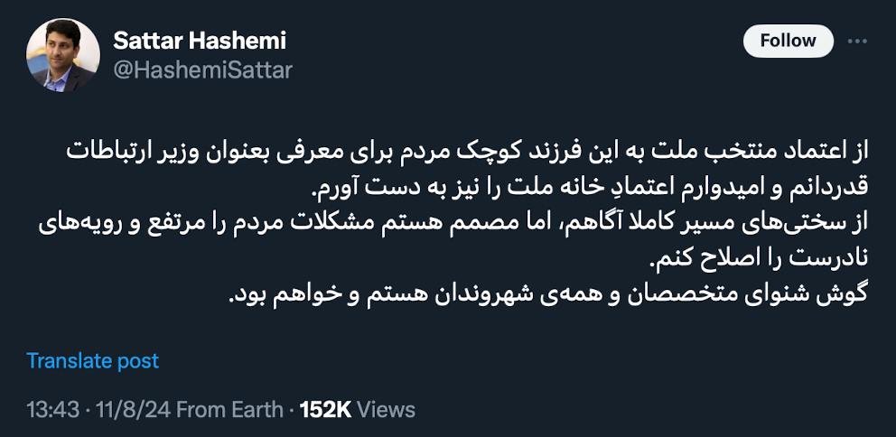 Home/PoliticsDr. Hashemi, greetingsRead1 minute -Monday 2024/10/07 - 21:33News Code:6427Share Please make better use of the esteemed Mr. Dr. Seyyed Zia Hashemi and his political experiences.You have valuable academic and practical backgrounds.I hope you don’t get sidetracked and maintain your independence, so it doesn't come across that you want to be the face of another person or specific group of former managers from the "Ministry of Intelligence" in the "Ministry of Communications."Both you and your esteemed brother are respected by me. Take less than a minute, register and share your opinion under this post.Insulting or inciting messages will be deleted.Sign UpComming Up Next The Omani foreign minister, whom I hope will one day publish a memoir of the details of these negotiations, which would certainly be very interesting to read, is now in Washington to provide further explanation.خواندن 1 minute Mr. Mohammad Jafar Qaempanah, Executive Deputy of the President, Mr. Majid Farahani, Deputy of Coordination and Follow-up of the Executive Deputy of the President, helloخواندن 1 minute I was thinking about the strange and ruthless labyrinth of power and politics.خواندن 1 minute Greetings, Mr. Houshmand. Why were these martyrs not buried within the Holy Shrine of Imam Reza or the Astan-e Quds territory, but instead in Behesht-e Reza?خواندن 1 minute The issue is very simple: solving the difference between fatwa and government decreeخواندن 1 minuteMost ReadMemories of Akbar Hashemi - February 20, 2000 - Meeting with Abdullah Jasbi and Concerns About Election ResultsMovie / Where is Commander Morteza Talaie?Akbar Hashemi's memoirs - 1999 September 10 - The two-person political negotiations with Vaez Tabasi continued until he was escorted to Tehran, where Hashemi apparently decided to seriously participate in the sixth parliamentary elections.The records of the recent periods of the Islamic Council showed that the parliament is not in charge of affairs and cannot interfere or pass resolutions on the authority of the Commander-in-Chief of the Armed Forces at any level, let alone supervise.What will be the future of Iran with the announced candidates for the presidential election? / Conversation with Dr. Taghi Azad AramakiCan I feel tired with you?A Basiji veterinarian was appointed head of the health network instead of an otolaryngologist.Akbar Hashemi's memoirs - 1999 September 5 - The meeting of the senior managers of the judiciary with Hashemi Rafsanjani and their complaint about the neglect of Hashemi Shahroudi, the new head of the judiciary, continues.Memories of Akbar Hashemi - 1999 September 7 - In continuation of the efforts of the late Vaez Tabasi, who used to encourage Hashemi to participate in the elections in frequent meetings, this time he also met with Hashemi.Akbar Hashemi's memories - 1999 September 9 - Continued visits to the belongings, buildings and works of Astan Quds