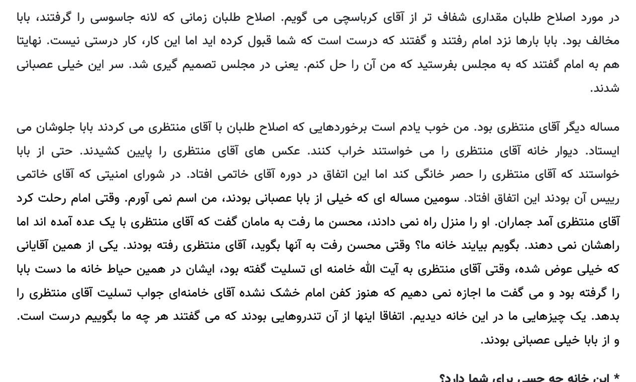 Home/PoliticsPart of Fatemeh Hashemi's interview criticizing the reformists' past and the way Akbar Hashemi Rafsanjani was treatedRead2 minutes -Friday 2025/01/10 - 23:55News Code:11554Share The reformists asked my father to put Mr. Montazeri under house arrest, but this happened during Mr. Khatami's tenureThe reformists asked my father to put Mr. Montazeri under house arrest, but this happened during Mr. Khatami's tenureFatemeh Hashemi Rafsanjani: I will be a little more transparent about the reformists than Mr. Karbaschi. When the reformists took over the nest of espionage, Baba was against it.Baba went to the Imam many times and said, "It is true that you have accepted, but this is not the right thing to do. In the end, they told the Imam to send it to the parliament so that I could solve it. In other words, the decision was made in the parliament. They were very angry about this.Another issue was Mr. Montazeri. I remember very well the confrontations that the reformists had with Mr. Montazeri, and Baba would stand in front of them. They wanted to destroy the wall of Mr. Montazeri's house. They pulled down Mr. Montazeri's photographs.They even asked Baba to put Mr. Montazeri under house arrest, but this happened during Mr. Khatami's tenure. This happened in the Security Council, of which Mr. Khatami was the chairman. The third thing that was very angry with Baba was that I will not mention.When the Imam passed away, Mr. Montazeri came to Jamaran. They wouldn't let him in, so Mohsen went to us and told Mom that Mr. Montazeri had come with some people Take less than a minute, register and share your opinion under this post.Insulting or inciting messages will be deleted.Sign UpComming Up Next I remembered Dr. Sadegh Zibakalam's speech about six months ago, when he said: If we enter into a military conflict, whether the system remains or not, not a single electric pole will remain intact in Iran - are you listening?خواندن 0 If this public announcement is not hindered like other parts of the system's security megaproject, yesخواندن 1 minute Regardless of the result of the establishment or non-continuation of the establishment of the Islamic Republic; Should the main leadership option after Ayatollah Khamenei be acted in this way?خواندن 1 minute According to the significant custom of the seminary and jurisprudence, now we have to see which jurist will perform the funeral prayer for Ayatollah Khamenei?خواندن 1 minute In the news of his appointment, I wrote that he is the commander of the camp at the same time as the deputy commander of the army corpsخواندن 1 minuteMost ReadMemories of Akbar Hashemi - February 20, 2000 - Meeting with Abdullah Jasbi and Concerns About Election ResultsMovie / Where is Commander Morteza Talaie?Akbar Hashemi's memoirs - 1999 September 10 - The two-person political negotiations with Vaez Tabasi continued until he was escorted to Tehran, where Hashemi apparently decided to seriously participate in the sixth parliamentary elections.The records of the recent periods of the Islamic Council showed that the parliament is not in charge of affairs and cannot interfere or pass resolutions on the authority of the Commander-in-Chief of the Armed Forces at any level, let alone supervise.What will be the future of Iran with the announced candidates for the presidential election? / Conversation with Dr. Taghi Azad AramakiCan I feel tired with you?A Basiji veterinarian was appointed head of the health network instead of an otolaryngologist.Akbar Hashemi's memoirs - 1999 September 5 - The meeting of the senior managers of the judiciary with Hashemi Rafsanjani and their complaint about the neglect of Hashemi Shahroudi, the new head of the judiciary, continues.Memories of Akbar Hashemi - 1999 September 7 - In continuation of the efforts of the late Vaez Tabasi, who used to encourage Hashemi to participate in the elections in frequent meetings, this time he also met with Hashemi.Akbar Hashemi's memories - 1999 September 9 - Continued visits to the belongings, buildings and works of Astan Quds