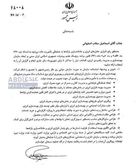 Home/PoliticsAnd ..... Finally the President's order to form energy optimization and management organizationRead1 minute -Tuesday 2025/07/29 - 12:48News Code:21798Share But President Massoud Pezeshkian, in an unbelievable decree, with all the options and even his own option But President Massoud Khan Pezeshkian, in an unbelievable decree, with all the options and even his own option, which had drafted his ruling in the office of the Presidential Office. Ismail Saghab Isfahani commissioned the formation of the "Strategic Energy Optimization and Strategic Management Organization" as the "state organization under the president" by the end of September.Government of the CovenantRelated news Mr. President, did you appoint Mr. Ismail Saghab Isfahani to establish the Energy Organization? Take less than a minute, register and share your opinion under this post.Insulting or inciting messages will be deleted.Sign UpComming Up Next Twitter responses on Februaryخواندن 4 minutes What is really going on inside the country?خواندن 1 minute Confirmation of Abdi Media's notes regarding secret negotiations between the United States and the Islamic Republic by the Ministry of Intelligence's Foreign Intelligence and Movements Organization.خواندن 1 minute Will the day ever come when the accurate narrative of the Jame'eh group's arrest is told? The plans they had, which were thwarted by the meeting between the mother of the Jalaeipour martyrs and Ayatollah Khamenei,خواندن 1 minute Mr. Ambassador of the Islamic Republic, greetings. Does the realization of this seriousness also have a timeframe?خواندن 1 minuteMost ReadMemories of Akbar Hashemi - February 20, 2000 - Meeting with Abdullah Jasbi and Concerns About Election ResultsMovie / Where is Commander Morteza Talaie?Akbar Hashemi's memoirs - 1999 September 10 - The two-person political negotiations with Vaez Tabasi continued until he was escorted to Tehran, where Hashemi apparently decided to seriously participate in the sixth parliamentary elections.The records of the recent periods of the Islamic Council showed that the parliament is not in charge of affairs and cannot interfere or pass resolutions on the authority of the Commander-in-Chief of the Armed Forces at any level, let alone supervise.What will be the future of Iran with the announced candidates for the presidential election? / Conversation with Dr. Taghi Azad AramakiCan I feel tired with you?A Basiji veterinarian was appointed head of the health network instead of an otolaryngologist.Akbar Hashemi's memoirs - 1999 September 5 - The meeting of the senior managers of the judiciary with Hashemi Rafsanjani and their complaint about the neglect of Hashemi Shahroudi, the new head of the judiciary, continues.Memories of Akbar Hashemi - 1999 September 7 - In continuation of the efforts of the late Vaez Tabasi, who used to encourage Hashemi to participate in the elections in frequent meetings, this time he also met with Hashemi.Akbar Hashemi's memories - 1999 September 9 - Continued visits to the belongings, buildings and works of Astan Quds