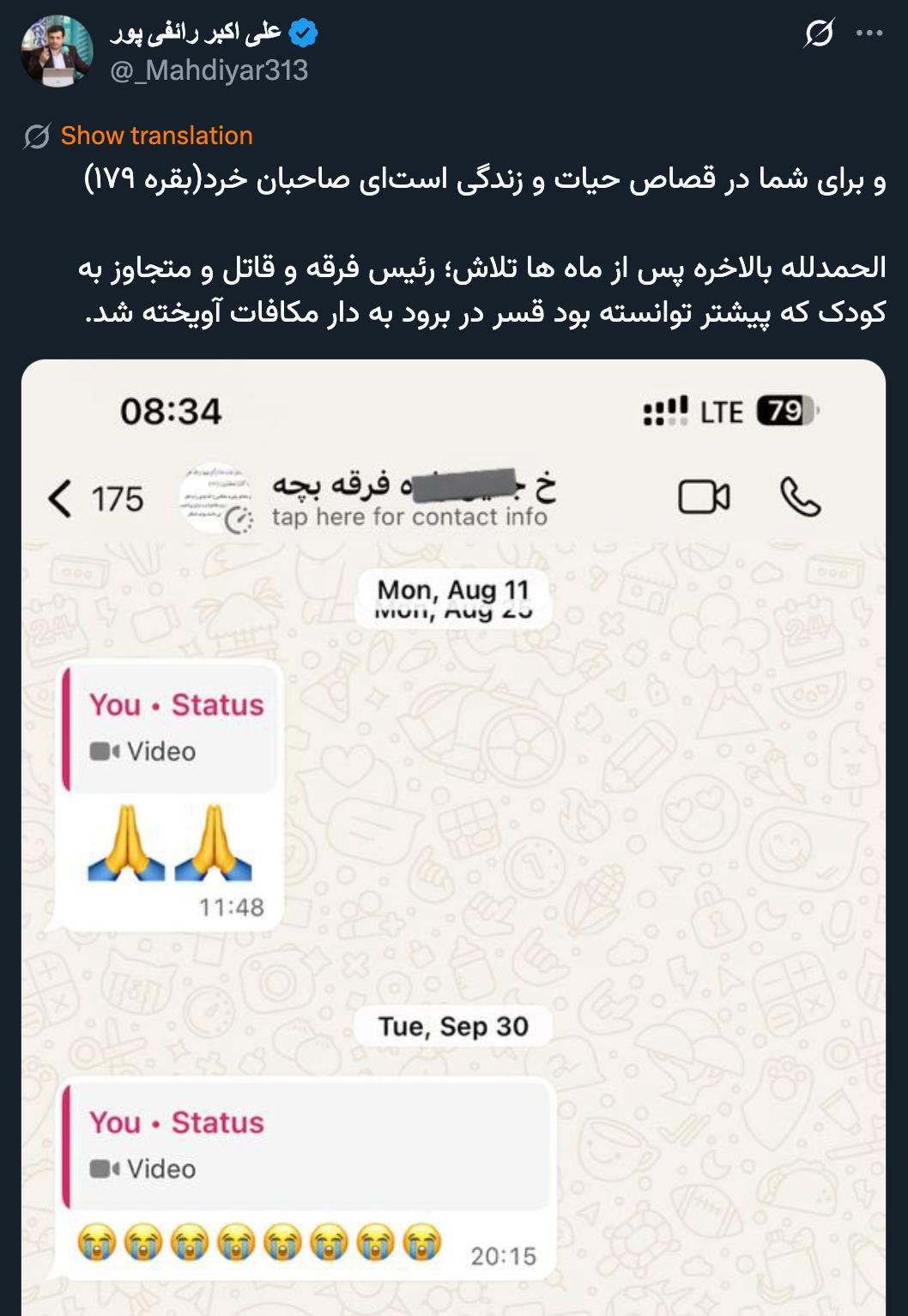 Home/PoliticsMr. Raefipour, you mention execution and retribution with the key words sect leader, but you don't say anything about the prosecutor's office executing the sentence and more details of the executive and trial case, why exactly?Read1 minute -Friday 2025/10/24 - 00:19News Code:23193Share Image و برای شما در قصاص حیات و زندگی استای صاحبان خرد(بقره ۱۷۹)الحمدلله بالاخره پس از ماه ها تلاش؛ رئیس فرقه و قاتل و متجاوز به کودک که پیشتر توانسته بود قسر در برود به دار مکافات آویخته شد. pic.twitter.com/84BUjmJ8O2— علی اکبر رائفی پور (@_Mahdiyar313) October 23, 2025🔴 آقای رائفی پوراز اعدام و قصاص با کلید واژه #رییس_فرقه نام می برید اما از دادسرای مجری حکم و جزییات بیشتر پرونده اجرایی و محاکماتی چیزی نمیگویید، دقیقا چرا؟— AbdiMedia - Abdollah Abdi (@abdolah_abdi) October 23, 2025 Take less than a minute, register and share your opinion under this post.Insulting or inciting messages will be deleted.Sign UpComming Up Next I remembered Dr. Sadegh Zibakalam's speech about six months ago, when he said: If we enter into a military conflict, whether the system remains or not, not a single electric pole will remain intact in Iran - are you listening?خواندن 0 If this public announcement is not hindered like other parts of the system's security megaproject, yesخواندن 1 minute Regardless of the result of the establishment or non-continuation of the establishment of the Islamic Republic; Should the main leadership option after Ayatollah Khamenei be acted in this way?خواندن 1 minute According to the significant custom of the seminary and jurisprudence, now we have to see which jurist will perform the funeral prayer for Ayatollah Khamenei?خواندن 1 minute In the news of his appointment, I wrote that he is the commander of the camp at the same time as the deputy commander of the army corpsخواندن 1 minuteMost ReadMemories of Akbar Hashemi - February 20, 2000 - Meeting with Abdullah Jasbi and Concerns About Election ResultsMovie / Where is Commander Morteza Talaie?Akbar Hashemi's memoirs - 1999 September 10 - The two-person political negotiations with Vaez Tabasi continued until he was escorted to Tehran, where Hashemi apparently decided to seriously participate in the sixth parliamentary elections.The records of the recent periods of the Islamic Council showed that the parliament is not in charge of affairs and cannot interfere or pass resolutions on the authority of the Commander-in-Chief of the Armed Forces at any level, let alone supervise.What will be the future of Iran with the announced candidates for the presidential election? / Conversation with Dr. Taghi Azad AramakiCan I feel tired with you?A Basiji veterinarian was appointed head of the health network instead of an otolaryngologist.Akbar Hashemi's memoirs - 1999 September 5 - The meeting of the senior managers of the judiciary with Hashemi Rafsanjani and their complaint about the neglect of Hashemi Shahroudi, the new head of the judiciary, continues.Memories of Akbar Hashemi - 1999 September 7 - In continuation of the efforts of the late Vaez Tabasi, who used to encourage Hashemi to participate in the elections in frequent meetings, this time he also met with Hashemi.Akbar Hashemi's memories - 1999 September 9 - Continued visits to the belongings, buildings and works of Astan Quds