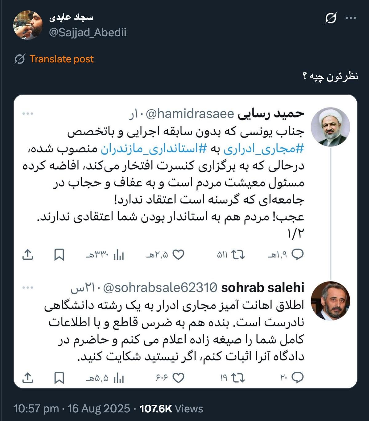 Home/PoliticsThe marriage contract, both temporary and permanent, and the child of this marriage, is also law -abiding, regardless of the persons concerned with the speaker and the audience, the insult here is not loaded here; Can you?Read1 minute -Friday 2025/08/22 - 09:05News Code:22126Share نظرتون چیه ؟ pic.twitter.com/ysmh3P7Ote— سجاد عابدی (@Sajjad_Abedii) August 16, 2025🔴 درودصیغه عقدیست اعم از موقت و دائم و فرزند حاصل از این ازدواج هم حلال زاده است💢 صرف نظر از اشخاص مدنظر گوینده و مخاطب، توهین در اینجا بار نمیشود؛ میشود؟— AbdiMedia - Abdollah Abdi (@abdolah_abdi) August 18, 2025 Take less than a minute, register and share your opinion under this post.Insulting or inciting messages will be deleted.Sign UpComming Up Next I remembered Dr. Sadegh Zibakalam's speech about six months ago, when he said: If we enter into a military conflict, whether the system remains or not, not a single electric pole will remain intact in Iran - are you listening?خواندن 0 If this public announcement is not hindered like other parts of the system's security megaproject, yesخواندن 1 minute Regardless of the result of the establishment or non-continuation of the establishment of the Islamic Republic; Should the main leadership option after Ayatollah Khamenei be acted in this way?خواندن 1 minute According to the significant custom of the seminary and jurisprudence, now we have to see which jurist will perform the funeral prayer for Ayatollah Khamenei?خواندن 1 minute In the news of his appointment, I wrote that he is the commander of the camp at the same time as the deputy commander of the army corpsخواندن 1 minuteMost ReadMemories of Akbar Hashemi - February 20, 2000 - Meeting with Abdullah Jasbi and Concerns About Election ResultsMovie / Where is Commander Morteza Talaie?Akbar Hashemi's memoirs - 1999 September 10 - The two-person political negotiations with Vaez Tabasi continued until he was escorted to Tehran, where Hashemi apparently decided to seriously participate in the sixth parliamentary elections.The records of the recent periods of the Islamic Council showed that the parliament is not in charge of affairs and cannot interfere or pass resolutions on the authority of the Commander-in-Chief of the Armed Forces at any level, let alone supervise.What will be the future of Iran with the announced candidates for the presidential election? / Conversation with Dr. Taghi Azad AramakiCan I feel tired with you?A Basiji veterinarian was appointed head of the health network instead of an otolaryngologist.Akbar Hashemi's memoirs - 1999 September 5 - The meeting of the senior managers of the judiciary with Hashemi Rafsanjani and their complaint about the neglect of Hashemi Shahroudi, the new head of the judiciary, continues.Memories of Akbar Hashemi - 1999 September 7 - In continuation of the efforts of the late Vaez Tabasi, who used to encourage Hashemi to participate in the elections in frequent meetings, this time he also met with Hashemi.Akbar Hashemi's memories - 1999 September 9 - Continued visits to the belongings, buildings and works of Astan Quds