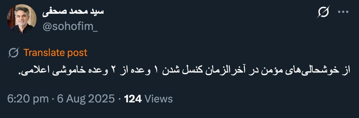Home/PoliticsDidn't they say that the blackouts were going to increase from 2 hours to 4 hours?Read1 minute -Wednesday 2025/08/06 - 22:08News Code:21915Share از خوشحالیهای مؤمن در آخرالزمان کنسل شدن ۱ وعده از ۲ وعده خاموشی اعلامی.— سید محمد صحفی (@sohofim_) August 6, 2025🔴 درودنگفتند قرار است خاموشی ها از ۲ ساعت به ۴ ساعت افزایش پیدا کند؟— AbdiMedia - Abdollah Abdi (@abdolah_abdi) August 6, 2025 Take less than a minute, register and share your opinion under this post.Insulting or inciting messages will be deleted.Sign UpComming Up Next I remembered Dr. Sadegh Zibakalam's speech about six months ago, when he said: If we enter into a military conflict, whether the system remains or not, not a single electric pole will remain intact in Iran - are you listening?خواندن 0 If this public announcement is not hindered like other parts of the system's security megaproject, yesخواندن 1 minute Regardless of the result of the establishment or non-continuation of the establishment of the Islamic Republic; Should the main leadership option after Ayatollah Khamenei be acted in this way?خواندن 1 minute According to the significant custom of the seminary and jurisprudence, now we have to see which jurist will perform the funeral prayer for Ayatollah Khamenei?خواندن 1 minute In the news of his appointment, I wrote that he is the commander of the camp at the same time as the deputy commander of the army corpsخواندن 1 minuteMost ReadMemories of Akbar Hashemi - February 20, 2000 - Meeting with Abdullah Jasbi and Concerns About Election ResultsMovie / Where is Commander Morteza Talaie?Akbar Hashemi's memoirs - 1999 September 10 - The two-person political negotiations with Vaez Tabasi continued until he was escorted to Tehran, where Hashemi apparently decided to seriously participate in the sixth parliamentary elections.The records of the recent periods of the Islamic Council showed that the parliament is not in charge of affairs and cannot interfere or pass resolutions on the authority of the Commander-in-Chief of the Armed Forces at any level, let alone supervise.What will be the future of Iran with the announced candidates for the presidential election? / Conversation with Dr. Taghi Azad AramakiCan I feel tired with you?A Basiji veterinarian was appointed head of the health network instead of an otolaryngologist.Akbar Hashemi's memoirs - 1999 September 5 - The meeting of the senior managers of the judiciary with Hashemi Rafsanjani and their complaint about the neglect of Hashemi Shahroudi, the new head of the judiciary, continues.Memories of Akbar Hashemi - 1999 September 7 - In continuation of the efforts of the late Vaez Tabasi, who used to encourage Hashemi to participate in the elections in frequent meetings, this time he also met with Hashemi.Akbar Hashemi's memories - 1999 September 9 - Continued visits to the belongings, buildings and works of Astan Quds