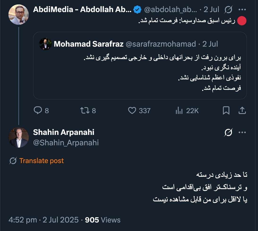 Home/PoliticsSpecial attention, of courseRead1 minute -Monday 2025/07/14 - 22:29News Code:20827Share تا حد زیادی درستهو ترسناکتر افق بیاقدامی است یا لااقل برای من قابل مشاهده نیست— Shahin Arpanahi (@Shahin_Arpanahi) July 2, 2025🔴درودالبته توجه ویژه شود #سیاست_عجیب_بیرحم_و_پیچیده_است— AbdiMedia - Abdollah Abdi (@abdolah_abdi) July 3, 2025 Take less than a minute, register and share your opinion under this post.Insulting or inciting messages will be deleted.Sign UpComming Up Next I remembered Dr. Sadegh Zibakalam's speech about six months ago, when he said: If we enter into a military conflict, whether the system remains or not, not a single electric pole will remain intact in Iran - are you listening?خواندن 0 If this public announcement is not hindered like other parts of the system's security megaproject, yesخواندن 1 minute Regardless of the result of the establishment or non-continuation of the establishment of the Islamic Republic; Should the main leadership option after Ayatollah Khamenei be acted in this way?خواندن 1 minute According to the significant custom of the seminary and jurisprudence, now we have to see which jurist will perform the funeral prayer for Ayatollah Khamenei?خواندن 1 minute In the news of his appointment, I wrote that he is the commander of the camp at the same time as the deputy commander of the army corpsخواندن 1 minuteMost ReadMemories of Akbar Hashemi - February 20, 2000 - Meeting with Abdullah Jasbi and Concerns About Election ResultsMovie / Where is Commander Morteza Talaie?Akbar Hashemi's memoirs - 1999 September 10 - The two-person political negotiations with Vaez Tabasi continued until he was escorted to Tehran, where Hashemi apparently decided to seriously participate in the sixth parliamentary elections.The records of the recent periods of the Islamic Council showed that the parliament is not in charge of affairs and cannot interfere or pass resolutions on the authority of the Commander-in-Chief of the Armed Forces at any level, let alone supervise.What will be the future of Iran with the announced candidates for the presidential election? / Conversation with Dr. Taghi Azad AramakiCan I feel tired with you?A Basiji veterinarian was appointed head of the health network instead of an otolaryngologist.Akbar Hashemi's memoirs - 1999 September 5 - The meeting of the senior managers of the judiciary with Hashemi Rafsanjani and their complaint about the neglect of Hashemi Shahroudi, the new head of the judiciary, continues.Memories of Akbar Hashemi - 1999 September 7 - In continuation of the efforts of the late Vaez Tabasi, who used to encourage Hashemi to participate in the elections in frequent meetings, this time he also met with Hashemi.Akbar Hashemi's memories - 1999 September 9 - Continued visits to the belongings, buildings and works of Astan Quds