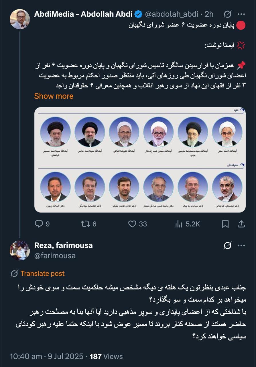 Home/PoliticsAlthough politics in Iran is variable, it is very complex and ruthless. A coup, in the sense of a real coup, is practically impossible within the structure of the Islamic Republic...Read1 minute -Wednesday 2025/07/16 - 13:04News Code:21088Share The political factions and groups within the country are ultimately and practically united in principles and under leadership; even if they deny it.Related news پایان دوره عضویت ۶ عضو شورای نگهبان Take less than a minute, register and share your opinion under this post.Insulting or inciting messages will be deleted.Sign UpComming Up Next I remembered Dr. Sadegh Zibakalam's speech about six months ago, when he said: If we enter into a military conflict, whether the system remains or not, not a single electric pole will remain intact in Iran - are you listening?خواندن 0 If this public announcement is not hindered like other parts of the system's security megaproject, yesخواندن 1 minute Regardless of the result of the establishment or non-continuation of the establishment of the Islamic Republic; Should the main leadership option after Ayatollah Khamenei be acted in this way?خواندن 1 minute According to the significant custom of the seminary and jurisprudence, now we have to see which jurist will perform the funeral prayer for Ayatollah Khamenei?خواندن 1 minute In the news of his appointment, I wrote that he is the commander of the camp at the same time as the deputy commander of the army corpsخواندن 1 minuteMost ReadMemories of Akbar Hashemi - February 20, 2000 - Meeting with Abdullah Jasbi and Concerns About Election ResultsMovie / Where is Commander Morteza Talaie?Akbar Hashemi's memoirs - 1999 September 10 - The two-person political negotiations with Vaez Tabasi continued until he was escorted to Tehran, where Hashemi apparently decided to seriously participate in the sixth parliamentary elections.The records of the recent periods of the Islamic Council showed that the parliament is not in charge of affairs and cannot interfere or pass resolutions on the authority of the Commander-in-Chief of the Armed Forces at any level, let alone supervise.What will be the future of Iran with the announced candidates for the presidential election? / Conversation with Dr. Taghi Azad AramakiCan I feel tired with you?A Basiji veterinarian was appointed head of the health network instead of an otolaryngologist.Akbar Hashemi's memoirs - 1999 September 5 - The meeting of the senior managers of the judiciary with Hashemi Rafsanjani and their complaint about the neglect of Hashemi Shahroudi, the new head of the judiciary, continues.Memories of Akbar Hashemi - 1999 September 7 - In continuation of the efforts of the late Vaez Tabasi, who used to encourage Hashemi to participate in the elections in frequent meetings, this time he also met with Hashemi.Akbar Hashemi's memories - 1999 September 9 - Continued visits to the belongings, buildings and works of Astan Quds