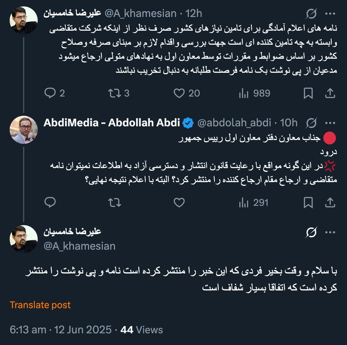 Home/PoliticsThe original letter has been sent to the president, but the outcome of his order or that of the chief of staff is unclear.Read2 minutes -Thursday 2025/06/12 - 14:50News Code:19549Share A copy has been sent to the First Vice President, which includes references, particularly to the Anti-Corruption Headquarters.A copy has been sent to the First Vice President, which includes references to the Fight Against Economic Corruption Headquarters and the Planning and Budget Organization. Can you inform us about the expert opinions of these two bodies and the final outcome of this request in the Ministry of Agriculture? نامه های اعلام آمادگی برای تامین نیازهای کشور صرف نظر از اینکه شرکت متقاضی وابسته به چه تامین کننده ای است جهت بررسی واقدام لازم بر مبنای صرفه وصلاح کشور بر اساس ضوابط و مقررات توسط معاون اول به نهادهای متولی ارجاع میشود مدعیان از پی نوشت بک نامه فرصت طلبانه به دنبال تخریب نباشند— علیرضا خامسیان (@A_khamesian) June 11, 2025🔴 جناب معاون دفتر معاون اول رییس جمهوردرود💢در این گونه مواقع با رعایت قانون انتشار و دسترسی آزاد به اطلاعات نمیتوان نامه متقاضی و ارجاع مقام ارجاع کننده را منتشر کرد؟ البته با اعلام نتیجه نهایی؟— AbdiMedia - Abdollah Abdi (@abdolah_abdi) June 11, 2025با سلام و وقت بخیر فردی که این خبر را منتشر کرده است نامه و پی نوشت را منتشر کرده است که اتفاقا بسیار شفاف است— علیرضا خامسیان (@A_khamesian) June 12, 2025🔴 اصل نامه به رییس جمهور ارسال شده که نتیجه دستور او و یا رییس دفتر مشخص نیست💢 رونوشت به معاون اول ارسال شده که ارجاعاتی داشته از جمله به ستاد مبارزه با فساد اقتصادی و سازمان برنامه و بودجه.🔸میشود نتیجه اظهارنظر کارشناسی این دو مرجع و نتیجه نهایی این درخواست در وزارت جهاد…— AbdiMedia - Abdollah Abdi (@abdolah_abdi) June 12, 2025Related news Dear Deputy of the Office of the First Vice President, in such cases, is it not possible to publish the applicant's letter and the referral of the referring authority while adhering to the Law on the Publication and Access to Information? Take less than a minute, register and share your opinion under this post.Insulting or inciting messages will be deleted.Sign UpComming Up Next I remembered Dr. Sadegh Zibakalam's speech about six months ago, when he said: If we enter into a military conflict, whether the system remains or not, not a single electric pole will remain intact in Iran - are you listening?خواندن 0 If this public announcement is not hindered like other parts of the system's security megaproject, yesخواندن 1 minute Regardless of the result of the establishment or non-continuation of the establishment of the Islamic Republic; Should the main leadership option after Ayatollah Khamenei be acted in this way?خواندن 1 minute According to the significant custom of the seminary and jurisprudence, now we have to see which jurist will perform the funeral prayer for Ayatollah Khamenei?خواندن 1 minute In the news of his appointment, I wrote that he is the commander of the camp at the same time as the deputy commander of the army corpsخواندن 1 minuteMost ReadMemories of Akbar Hashemi - February 20, 2000 - Meeting with Abdullah Jasbi and Concerns About Election ResultsMovie / Where is Commander Morteza Talaie?Akbar Hashemi's memoirs - 1999 September 10 - The two-person political negotiations with Vaez Tabasi continued until he was escorted to Tehran, where Hashemi apparently decided to seriously participate in the sixth parliamentary elections.The records of the recent periods of the Islamic Council showed that the parliament is not in charge of affairs and cannot interfere or pass resolutions on the authority of the Commander-in-Chief of the Armed Forces at any level, let alone supervise.What will be the future of Iran with the announced candidates for the presidential election? / Conversation with Dr. Taghi Azad AramakiCan I feel tired with you?A Basiji veterinarian was appointed head of the health network instead of an otolaryngologist.Akbar Hashemi's memoirs - 1999 September 5 - The meeting of the senior managers of the judiciary with Hashemi Rafsanjani and their complaint about the neglect of Hashemi Shahroudi, the new head of the judiciary, continues.Memories of Akbar Hashemi - 1999 September 7 - In continuation of the efforts of the late Vaez Tabasi, who used to encourage Hashemi to participate in the elections in frequent meetings, this time he also met with Hashemi.Akbar Hashemi's memories - 1999 September 9 - Continued visits to the belongings, buildings and works of Astan Quds