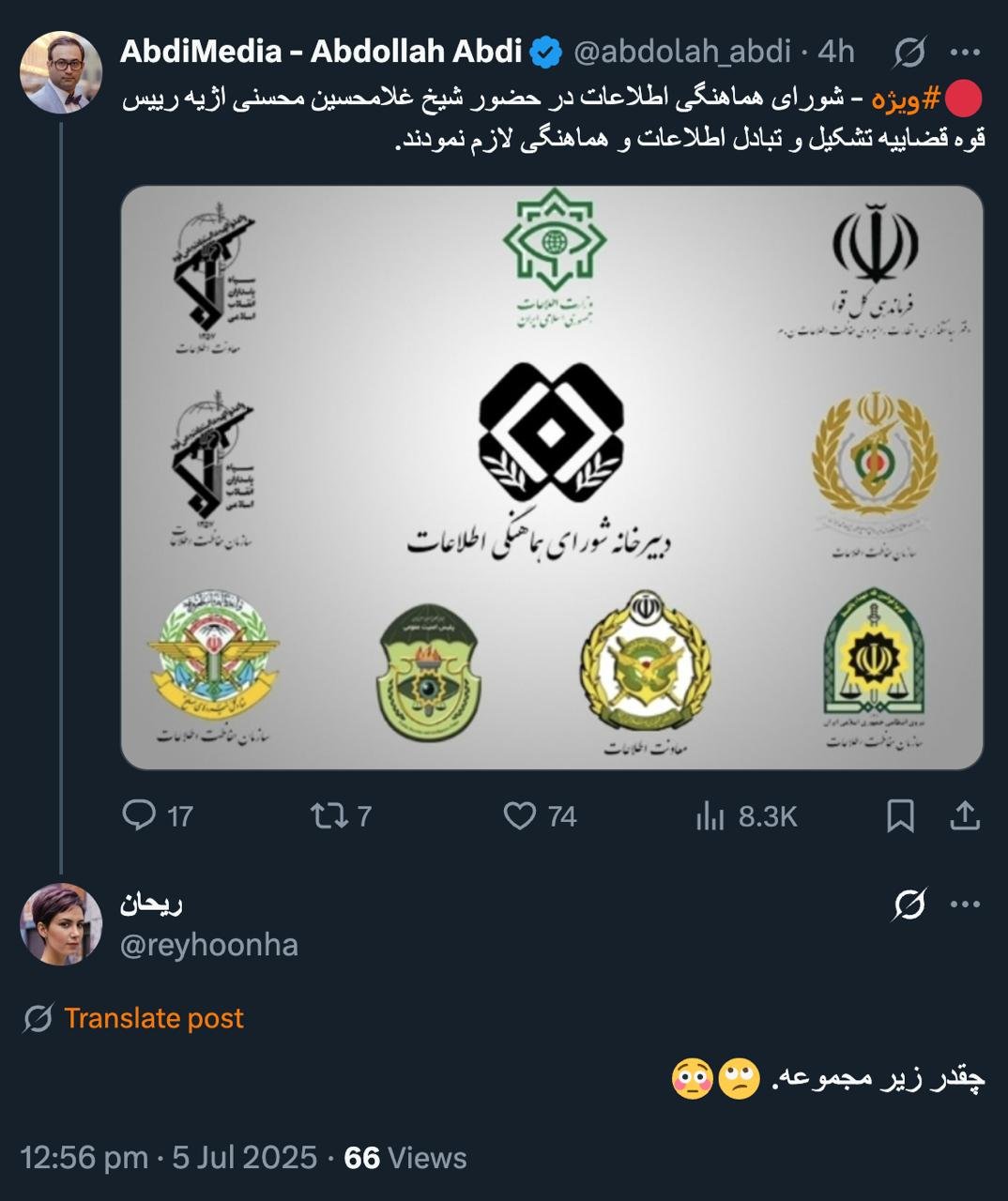 Home/PoliticsThere are a little more name in this poster, such as the head of the Leadership Bureau and ...Read1 minute -Monday 2025/07/14 - 22:32News Code:20935Share چقدر زیر مجموعه. 🙄😳— ریحان (@reyhoonha) July 5, 2025🔴 درودکمی بیشتر هم هستند که در این پوستر نامشان نیستمانند رییس سازمان حراست دفتر رهبری و...— AbdiMedia - Abdollah Abdi (@abdolah_abdi) July 5, 2025 Take less than a minute, register and share your opinion under this post.Insulting or inciting messages will be deleted.Sign UpComming Up Next I remembered Dr. Sadegh Zibakalam's speech about six months ago, when he said: If we enter into a military conflict, whether the system remains or not, not a single electric pole will remain intact in Iran - are you listening?خواندن 0 If this public announcement is not hindered like other parts of the system's security megaproject, yesخواندن 1 minute Regardless of the result of the establishment or non-continuation of the establishment of the Islamic Republic; Should the main leadership option after Ayatollah Khamenei be acted in this way?خواندن 1 minute According to the significant custom of the seminary and jurisprudence, now we have to see which jurist will perform the funeral prayer for Ayatollah Khamenei?خواندن 1 minute In the news of his appointment, I wrote that he is the commander of the camp at the same time as the deputy commander of the army corpsخواندن 1 minuteMost ReadMemories of Akbar Hashemi - February 20, 2000 - Meeting with Abdullah Jasbi and Concerns About Election ResultsMovie / Where is Commander Morteza Talaie?Akbar Hashemi's memoirs - 1999 September 10 - The two-person political negotiations with Vaez Tabasi continued until he was escorted to Tehran, where Hashemi apparently decided to seriously participate in the sixth parliamentary elections.The records of the recent periods of the Islamic Council showed that the parliament is not in charge of affairs and cannot interfere or pass resolutions on the authority of the Commander-in-Chief of the Armed Forces at any level, let alone supervise.What will be the future of Iran with the announced candidates for the presidential election? / Conversation with Dr. Taghi Azad AramakiCan I feel tired with you?A Basiji veterinarian was appointed head of the health network instead of an otolaryngologist.Akbar Hashemi's memoirs - 1999 September 5 - The meeting of the senior managers of the judiciary with Hashemi Rafsanjani and their complaint about the neglect of Hashemi Shahroudi, the new head of the judiciary, continues.Memories of Akbar Hashemi - 1999 September 7 - In continuation of the efforts of the late Vaez Tabasi, who used to encourage Hashemi to participate in the elections in frequent meetings, this time he also met with Hashemi.Akbar Hashemi's memories - 1999 September 9 - Continued visits to the belongings, buildings and works of Astan Quds