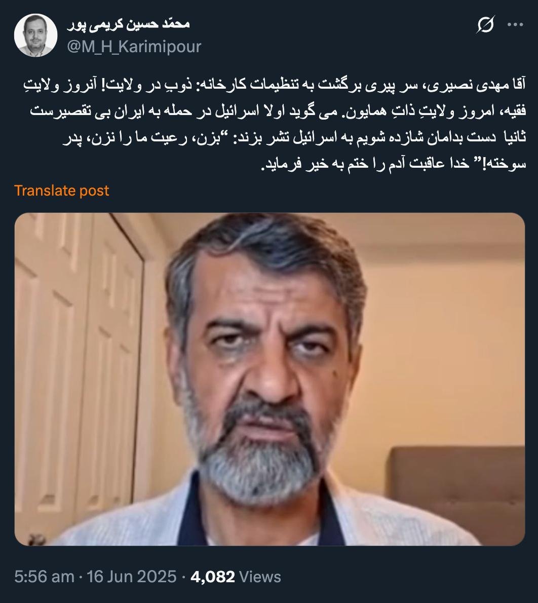 Home/PoliticsSay the extremists today are unbelieving tomorrowRead0 -Friday 2025/07/11 - 21:26News Code:19817Share Take less than a minute, register and share your opinion under this post.Insulting or inciting messages will be deleted.Sign UpComming Up Next I remembered Dr. Sadegh Zibakalam's speech about six months ago, when he said: If we enter into a military conflict, whether the system remains or not, not a single electric pole will remain intact in Iran - are you listening?خواندن 0 If this public announcement is not hindered like other parts of the system's security megaproject, yesخواندن 1 minute Regardless of the result of the establishment or non-continuation of the establishment of the Islamic Republic; Should the main leadership option after Ayatollah Khamenei be acted in this way?خواندن 1 minute According to the significant custom of the seminary and jurisprudence, now we have to see which jurist will perform the funeral prayer for Ayatollah Khamenei?خواندن 1 minute In the news of his appointment, I wrote that he is the commander of the camp at the same time as the deputy commander of the army corpsخواندن 1 minuteMost ReadMemories of Akbar Hashemi - February 20, 2000 - Meeting with Abdullah Jasbi and Concerns About Election ResultsMovie / Where is Commander Morteza Talaie?Akbar Hashemi's memoirs - 1999 September 10 - The two-person political negotiations with Vaez Tabasi continued until he was escorted to Tehran, where Hashemi apparently decided to seriously participate in the sixth parliamentary elections.The records of the recent periods of the Islamic Council showed that the parliament is not in charge of affairs and cannot interfere or pass resolutions on the authority of the Commander-in-Chief of the Armed Forces at any level, let alone supervise.What will be the future of Iran with the announced candidates for the presidential election? / Conversation with Dr. Taghi Azad AramakiCan I feel tired with you?A Basiji veterinarian was appointed head of the health network instead of an otolaryngologist.Akbar Hashemi's memoirs - 1999 September 5 - The meeting of the senior managers of the judiciary with Hashemi Rafsanjani and their complaint about the neglect of Hashemi Shahroudi, the new head of the judiciary, continues.Memories of Akbar Hashemi - 1999 September 7 - In continuation of the efforts of the late Vaez Tabasi, who used to encourage Hashemi to participate in the elections in frequent meetings, this time he also met with Hashemi.Akbar Hashemi's memories - 1999 September 9 - Continued visits to the belongings, buildings and works of Astan Quds