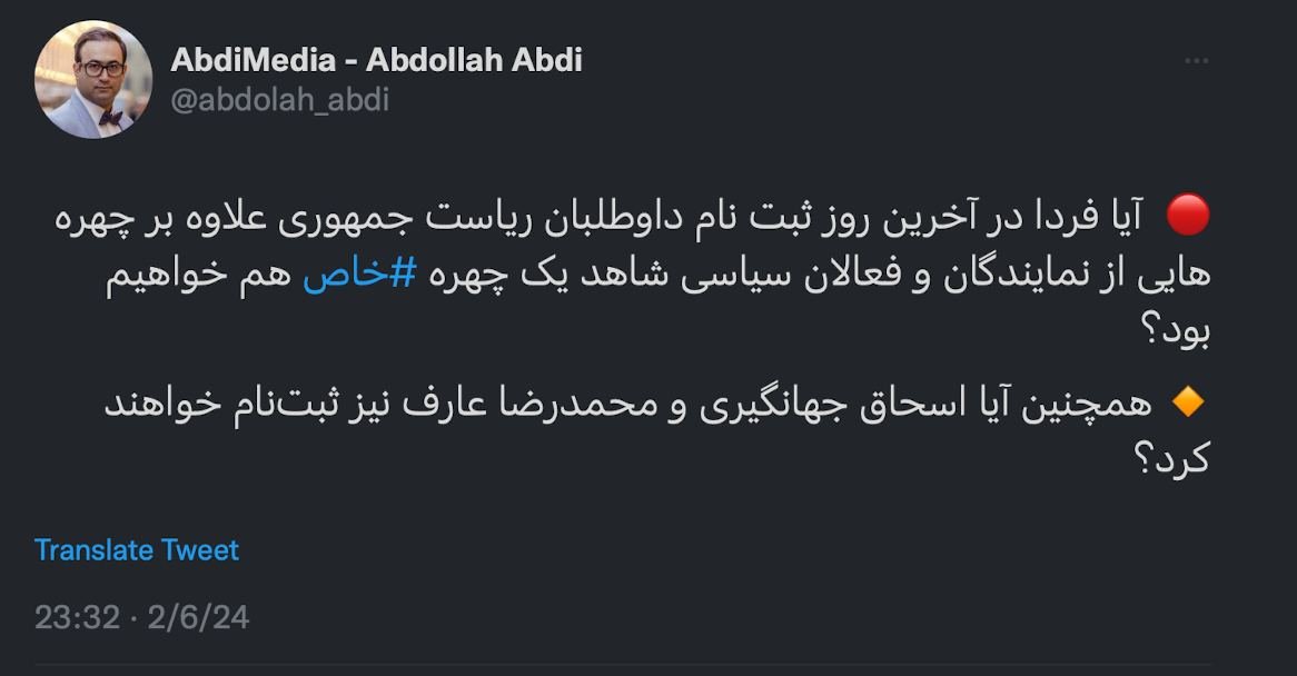 Home/PoliticsWill we witness a prominent figure, in addition to representatives and political activists, registering on the last day of presidential candidate registration tomorrow?Read1 minute -Sunday 2024/10/20 - 16:02News Code:5458Share Also, will Es’haq Jahangiri and Mohammad Reza Aref register as well? Take less than a minute, register and share your opinion under this post.Insulting or inciting messages will be deleted.Sign UpComming Up Next Mr. Ashna, greetings. Are you also examining the theory that this U.S. military mobilization might ultimately have a target other than the Islamic Republic?خواندن 1 minute The matter is perfectly clear. They were released following a directive from the Judiciary, and this directive was followed up with such speed that bail was accepted and they were released even on a holiday.خواندن 1 minute Dr., greetings. What was the outcome of the Medical Examiner's (Forensic Medicine) report that the family was pursuing through the Prosecutor's Office?خواندن 1 minute Twitter responses on Februaryخواندن 4 minutes What is really going on inside the country?خواندن 1 minuteMost ReadMemories of Akbar Hashemi - February 20, 2000 - Meeting with Abdullah Jasbi and Concerns About Election ResultsMovie / Where is Commander Morteza Talaie?Akbar Hashemi's memoirs - 1999 September 10 - The two-person political negotiations with Vaez Tabasi continued until he was escorted to Tehran, where Hashemi apparently decided to seriously participate in the sixth parliamentary elections.The records of the recent periods of the Islamic Council showed that the parliament is not in charge of affairs and cannot interfere or pass resolutions on the authority of the Commander-in-Chief of the Armed Forces at any level, let alone supervise.What will be the future of Iran with the announced candidates for the presidential election? / Conversation with Dr. Taghi Azad AramakiCan I feel tired with you?A Basiji veterinarian was appointed head of the health network instead of an otolaryngologist.Akbar Hashemi's memoirs - 1999 September 5 - The meeting of the senior managers of the judiciary with Hashemi Rafsanjani and their complaint about the neglect of Hashemi Shahroudi, the new head of the judiciary, continues.Memories of Akbar Hashemi - 1999 September 7 - In continuation of the efforts of the late Vaez Tabasi, who used to encourage Hashemi to participate in the elections in frequent meetings, this time he also met with Hashemi.Akbar Hashemi's memories - 1999 September 9 - Continued visits to the belongings, buildings and works of Astan Quds