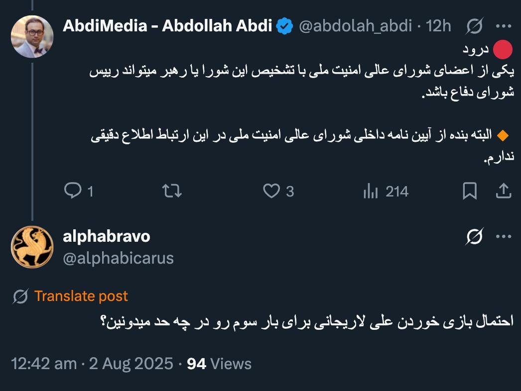 Home/PoliticsTwitter answers August 2 2025Read1 minute -Saturday 2025/08/02 - 18:52News Code:21852Share I hope that Ali Larijani does not start the whistle before the presidential presidency, and he really does not believe that he is the president and Massoud Medical President; Although it is. احتمال بازی خوردن علی لاریجانی برای بار سوم رو در چه حد میدونین؟— alphabravo (@alphabicarus) August 1, 2025🔴 درودامیدوارم علی لاریجانی @alilarijani_ir مانند دوره ریاست جمهوری پیش از زدن سوت بازی را شروع نکند.🔸و #واقعا باورش نشود که او رییس جمهور و مسعود پزشکیان رییس جمهور ظاهری است؛ هرچند باشد.— AbdiMedia - Abdollah Abdi (@abdolah_abdi) August 2, 2025 Take less than a minute, register and share your opinion under this post.Insulting or inciting messages will be deleted.Sign UpComming Up Next I remembered Dr. Sadegh Zibakalam's speech about six months ago, when he said: If we enter into a military conflict, whether the system remains or not, not a single electric pole will remain intact in Iran - are you listening?خواندن 0 If this public announcement is not hindered like other parts of the system's security megaproject, yesخواندن 1 minute Regardless of the result of the establishment or non-continuation of the establishment of the Islamic Republic; Should the main leadership option after Ayatollah Khamenei be acted in this way?خواندن 1 minute According to the significant custom of the seminary and jurisprudence, now we have to see which jurist will perform the funeral prayer for Ayatollah Khamenei?خواندن 1 minute In the news of his appointment, I wrote that he is the commander of the camp at the same time as the deputy commander of the army corpsخواندن 1 minuteMost ReadMemories of Akbar Hashemi - February 20, 2000 - Meeting with Abdullah Jasbi and Concerns About Election ResultsMovie / Where is Commander Morteza Talaie?Akbar Hashemi's memoirs - 1999 September 10 - The two-person political negotiations with Vaez Tabasi continued until he was escorted to Tehran, where Hashemi apparently decided to seriously participate in the sixth parliamentary elections.The records of the recent periods of the Islamic Council showed that the parliament is not in charge of affairs and cannot interfere or pass resolutions on the authority of the Commander-in-Chief of the Armed Forces at any level, let alone supervise.What will be the future of Iran with the announced candidates for the presidential election? / Conversation with Dr. Taghi Azad AramakiCan I feel tired with you?A Basiji veterinarian was appointed head of the health network instead of an otolaryngologist.Akbar Hashemi's memoirs - 1999 September 5 - The meeting of the senior managers of the judiciary with Hashemi Rafsanjani and their complaint about the neglect of Hashemi Shahroudi, the new head of the judiciary, continues.Memories of Akbar Hashemi - 1999 September 7 - In continuation of the efforts of the late Vaez Tabasi, who used to encourage Hashemi to participate in the elections in frequent meetings, this time he also met with Hashemi.Akbar Hashemi's memories - 1999 September 9 - Continued visits to the belongings, buildings and works of Astan Quds