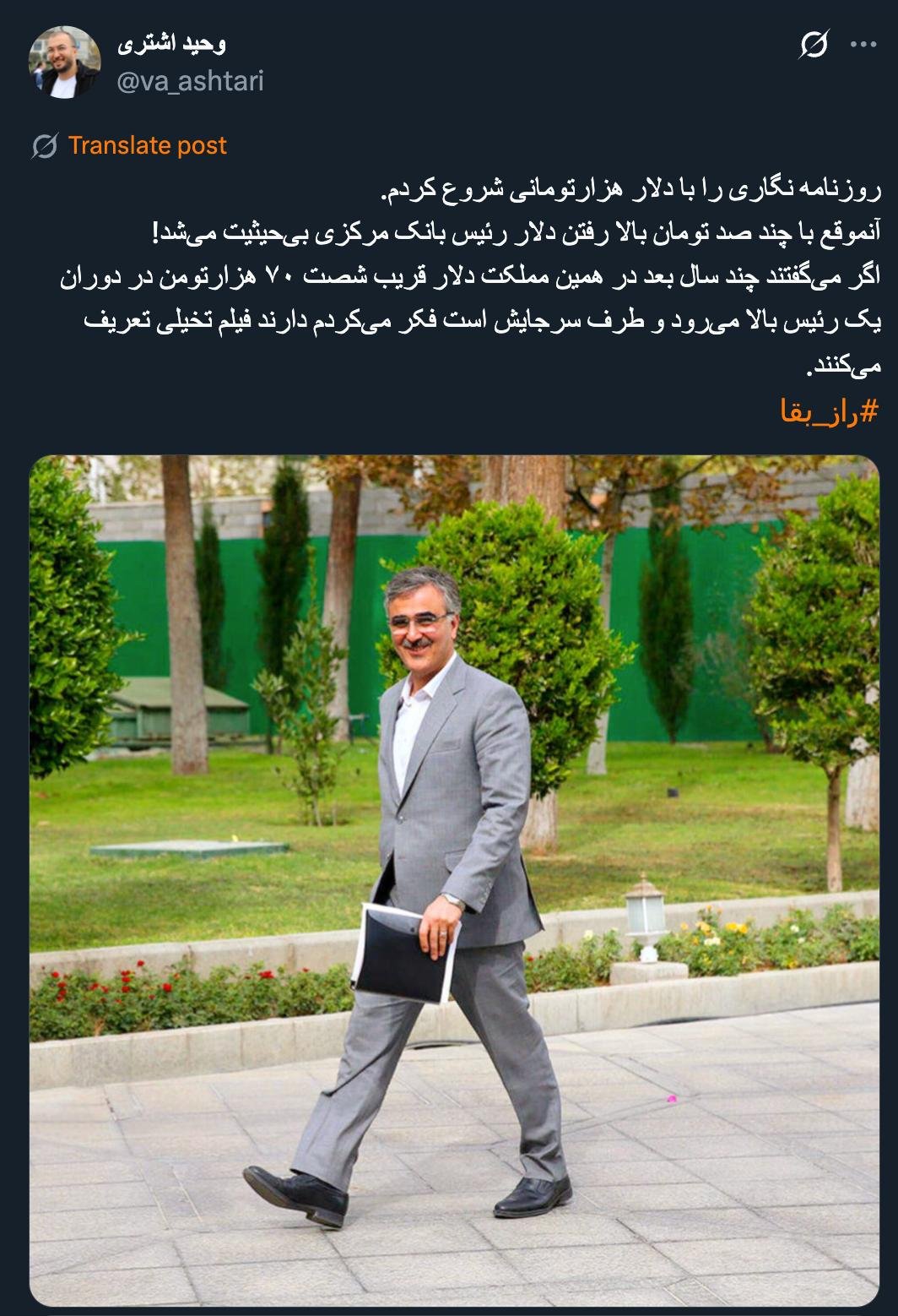 Home/PoliticsRead parts of the book A Moment from History written by Tahmasb Mazaheri and see the documents published in its second volume, which of course do not include secret and confidential matters hidden between sentences and words.Read1 minute -Saturday 2025/09/27 - 17:34News Code:22817Share You will become more familiar with very bitter truths through the words and writings of one of the most trustworthy and influential officials of the Islamic Republic. روزنامه نگاری را با دلار هزارتومانی شروع کردم.آنموقع با چند صد تومان بالا رفتن دلار رئیس بانک مرکزی بیحیثیت میشد!اگر میگفتند چند سال بعد در همین مملکت دلار قریب شصت ۷۰ هزارتومن در دوران یک رئیس بالا میرود و طرف سرجایش است فکر میکردم دارند فیلم تخیلی تعریف میکنند.#راز_بقا https://t.co/1EiOc4OPZa pic.twitter.com/fDnuvfKL9Y— وحید اشتری (@va_ashtari) September 26, 2025🔴 درودبخش هایی از کتاب لحظه ای از تاریخ نوشته طهماسب مظاهری را بخوانید و اسناد منتشر شده در جلد دوم آن را ببینید که البته مطالب سری و محرمانه و میان جملات و کلمات را ننوشته.🔸با حقیقت های بسیار تلخی از زبان و قلم یکی از امین ترین و ذی نفوذ ترین مسئولان جمهوری اسلامی آشنا تر…— AbdiMedia - Abdollah Abdi (@abdolah_abdi) September 26, 2025 Take less than a minute, register and share your opinion under this post.Insulting or inciting messages will be deleted.Sign UpComming Up Next I remembered Dr. Sadegh Zibakalam's speech about six months ago, when he said: If we enter into a military conflict, whether the system remains or not, not a single electric pole will remain intact in Iran - are you listening?خواندن 0 If this public announcement is not hindered like other parts of the system's security megaproject, yesخواندن 1 minute Regardless of the result of the establishment or non-continuation of the establishment of the Islamic Republic; Should the main leadership option after Ayatollah Khamenei be acted in this way?خواندن 1 minute According to the significant custom of the seminary and jurisprudence, now we have to see which jurist will perform the funeral prayer for Ayatollah Khamenei?خواندن 1 minute In the news of his appointment, I wrote that he is the commander of the camp at the same time as the deputy commander of the army corpsخواندن 1 minuteMost ReadMemories of Akbar Hashemi - February 20, 2000 - Meeting with Abdullah Jasbi and Concerns About Election ResultsMovie / Where is Commander Morteza Talaie?Akbar Hashemi's memoirs - 1999 September 10 - The two-person political negotiations with Vaez Tabasi continued until he was escorted to Tehran, where Hashemi apparently decided to seriously participate in the sixth parliamentary elections.The records of the recent periods of the Islamic Council showed that the parliament is not in charge of affairs and cannot interfere or pass resolutions on the authority of the Commander-in-Chief of the Armed Forces at any level, let alone supervise.What will be the future of Iran with the announced candidates for the presidential election? / Conversation with Dr. Taghi Azad AramakiCan I feel tired with you?A Basiji veterinarian was appointed head of the health network instead of an otolaryngologist.Akbar Hashemi's memoirs - 1999 September 5 - The meeting of the senior managers of the judiciary with Hashemi Rafsanjani and their complaint about the neglect of Hashemi Shahroudi, the new head of the judiciary, continues.Memories of Akbar Hashemi - 1999 September 7 - In continuation of the efforts of the late Vaez Tabasi, who used to encourage Hashemi to participate in the elections in frequent meetings, this time he also met with Hashemi.Akbar Hashemi's memories - 1999 September 9 - Continued visits to the belongings, buildings and works of Astan Quds