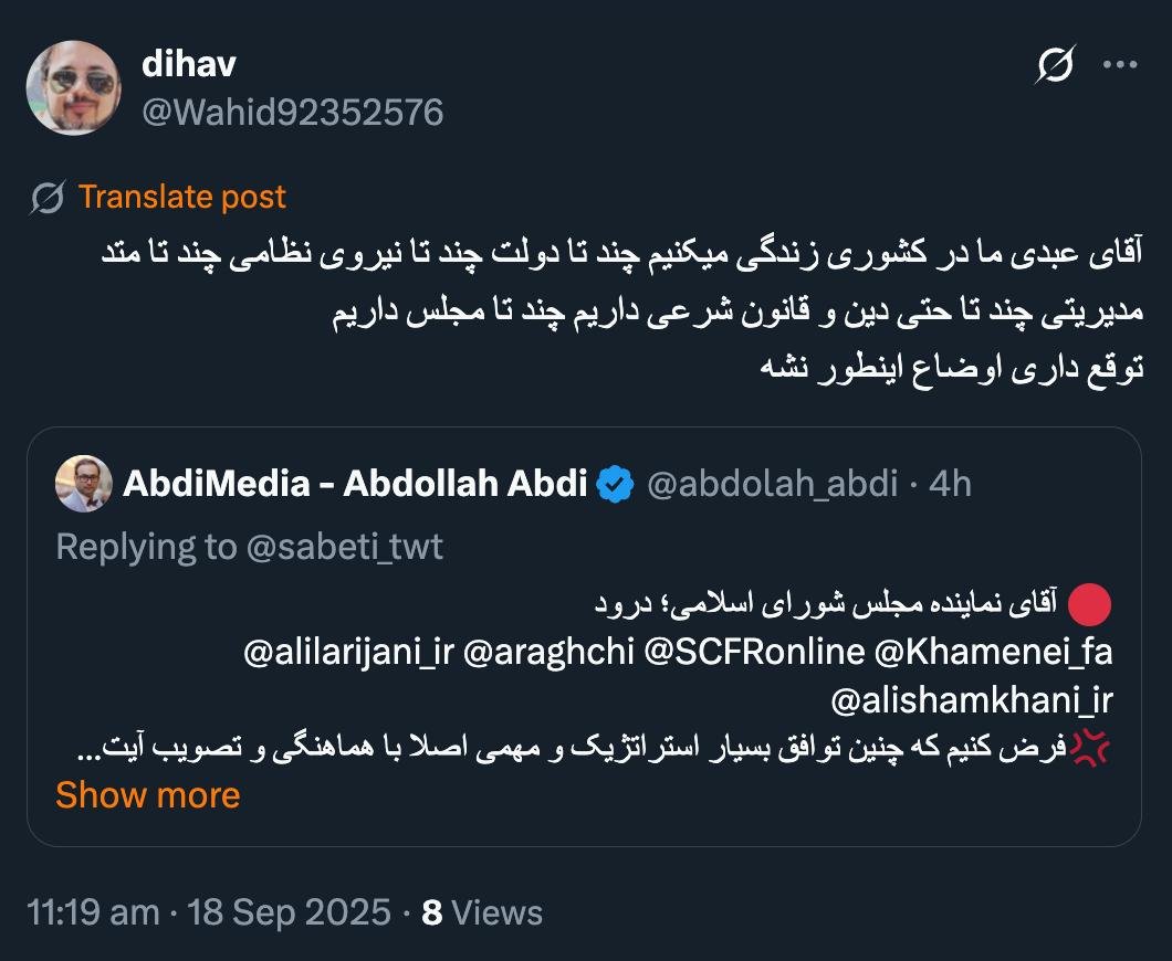 Home/PoliticsThe entire pyramid cone is a function of signals.Read1 minute -Saturday 2025/09/20 - 16:10News Code:22656Share آقای عبدی ما در کشوری زندگی میکنیم چند تا دولت چند تا نیروی نظامی چند تا متد مدیریتی چند تا حتی دین و قانون شرعی داریم چند تا مجلس داریمتوقع داری اوضاع اینطور نشه https://t.co/dAk22XibSL— dihav (@Wahid92352576) September 18, 2025🔴 درودهمه این هِرم مخروط تابع #اشارات است— AbdiMedia - Abdollah Abdi (@abdolah_abdi) September 18, 2025Related news Greetings, Mr. Member of the Islamic Consultative Assembly. Let us assume that such a very strategic and important agreement was not made at all with the coordination and approval of Ayatollah Khamenei. Take less than a minute, register and share your opinion under this post.Insulting or inciting messages will be deleted.Sign UpComming Up Next I remembered Dr. Sadegh Zibakalam's speech about six months ago, when he said: If we enter into a military conflict, whether the system remains or not, not a single electric pole will remain intact in Iran - are you listening?خواندن 0 If this public announcement is not hindered like other parts of the system's security megaproject, yesخواندن 1 minute Regardless of the result of the establishment or non-continuation of the establishment of the Islamic Republic; Should the main leadership option after Ayatollah Khamenei be acted in this way?خواندن 1 minute According to the significant custom of the seminary and jurisprudence, now we have to see which jurist will perform the funeral prayer for Ayatollah Khamenei?خواندن 1 minute In the news of his appointment, I wrote that he is the commander of the camp at the same time as the deputy commander of the army corpsخواندن 1 minuteMost ReadMemories of Akbar Hashemi - February 20, 2000 - Meeting with Abdullah Jasbi and Concerns About Election ResultsMovie / Where is Commander Morteza Talaie?Akbar Hashemi's memoirs - 1999 September 10 - The two-person political negotiations with Vaez Tabasi continued until he was escorted to Tehran, where Hashemi apparently decided to seriously participate in the sixth parliamentary elections.The records of the recent periods of the Islamic Council showed that the parliament is not in charge of affairs and cannot interfere or pass resolutions on the authority of the Commander-in-Chief of the Armed Forces at any level, let alone supervise.What will be the future of Iran with the announced candidates for the presidential election? / Conversation with Dr. Taghi Azad AramakiCan I feel tired with you?A Basiji veterinarian was appointed head of the health network instead of an otolaryngologist.Akbar Hashemi's memoirs - 1999 September 5 - The meeting of the senior managers of the judiciary with Hashemi Rafsanjani and their complaint about the neglect of Hashemi Shahroudi, the new head of the judiciary, continues.Memories of Akbar Hashemi - 1999 September 7 - In continuation of the efforts of the late Vaez Tabasi, who used to encourage Hashemi to participate in the elections in frequent meetings, this time he also met with Hashemi.Akbar Hashemi's memories - 1999 September 9 - Continued visits to the belongings, buildings and works of Astan Quds
