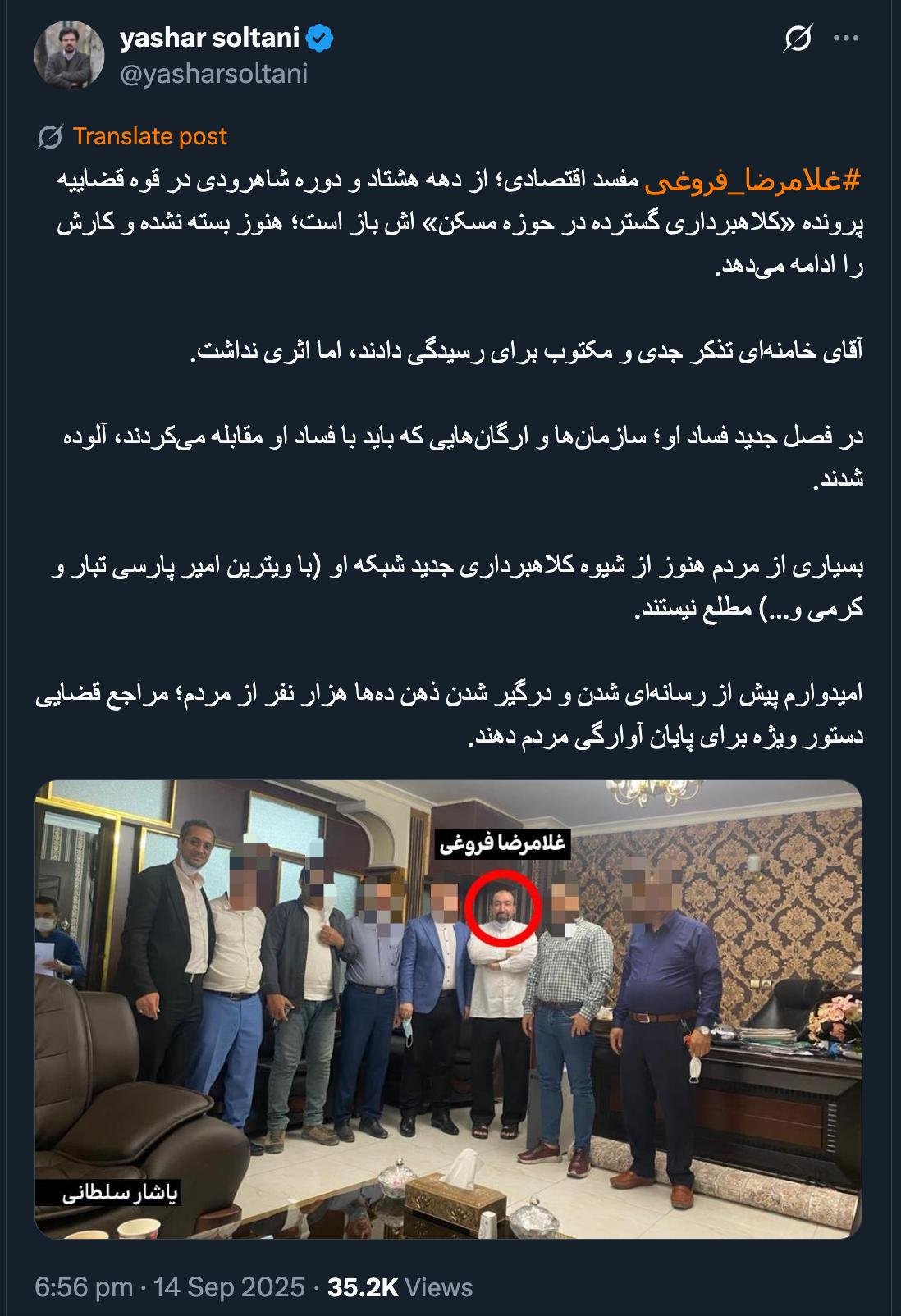 Home/PoliticsWasn’t the case of Reza Riazi and Foroughi in Branch 36 of the Tehran Court of Appeal closed during the tenure of Seyed Ahmad Zargar?Read1 minute -Monday 2025/09/15 - 04:15News Code:22600Share #غلامرضا_فروغی مفسد اقتصادی؛ از دهه هشتاد و دوره شاهرودی در قوه قضاییه پرونده «کلاهبرداری گسترده در حوزه مسکن» اش باز است؛ هنوز بسته نشده و کارش را ادامه میدهد.آقای خامنهای تذکر جدی و مکتوب برای رسیدگی دادند، اما اثری نداشت.در فصل جدید فساد او؛ سازمانها و ارگانهایی که… pic.twitter.com/h5ZNg9eQrK— yashar soltani (@yasharsoltani) September 14, 2025🔴مگر پرونده رضا ریاضی و فروغی در شعبه ۳۶ دادگاه تجدید نظر تهران در زمان ریاست سید احمد زرگر بسته نشد؟— AbdiMedia - Abdollah Abdi (@abdolah_abdi) September 14, 2025 Take less than a minute, register and share your opinion under this post.Insulting or inciting messages will be deleted.Sign UpComming Up Next I remembered Dr. Sadegh Zibakalam's speech about six months ago, when he said: If we enter into a military conflict, whether the system remains or not, not a single electric pole will remain intact in Iran - are you listening?خواندن 0 If this public announcement is not hindered like other parts of the system's security megaproject, yesخواندن 1 minute Regardless of the result of the establishment or non-continuation of the establishment of the Islamic Republic; Should the main leadership option after Ayatollah Khamenei be acted in this way?خواندن 1 minute According to the significant custom of the seminary and jurisprudence, now we have to see which jurist will perform the funeral prayer for Ayatollah Khamenei?خواندن 1 minute In the news of his appointment, I wrote that he is the commander of the camp at the same time as the deputy commander of the army corpsخواندن 1 minuteMost ReadMemories of Akbar Hashemi - February 20, 2000 - Meeting with Abdullah Jasbi and Concerns About Election ResultsMovie / Where is Commander Morteza Talaie?Akbar Hashemi's memoirs - 1999 September 10 - The two-person political negotiations with Vaez Tabasi continued until he was escorted to Tehran, where Hashemi apparently decided to seriously participate in the sixth parliamentary elections.The records of the recent periods of the Islamic Council showed that the parliament is not in charge of affairs and cannot interfere or pass resolutions on the authority of the Commander-in-Chief of the Armed Forces at any level, let alone supervise.What will be the future of Iran with the announced candidates for the presidential election? / Conversation with Dr. Taghi Azad AramakiCan I feel tired with you?A Basiji veterinarian was appointed head of the health network instead of an otolaryngologist.Akbar Hashemi's memoirs - 1999 September 5 - The meeting of the senior managers of the judiciary with Hashemi Rafsanjani and their complaint about the neglect of Hashemi Shahroudi, the new head of the judiciary, continues.Memories of Akbar Hashemi - 1999 September 7 - In continuation of the efforts of the late Vaez Tabasi, who used to encourage Hashemi to participate in the elections in frequent meetings, this time he also met with Hashemi.Akbar Hashemi's memories - 1999 September 9 - Continued visits to the belongings, buildings and works of Astan Quds