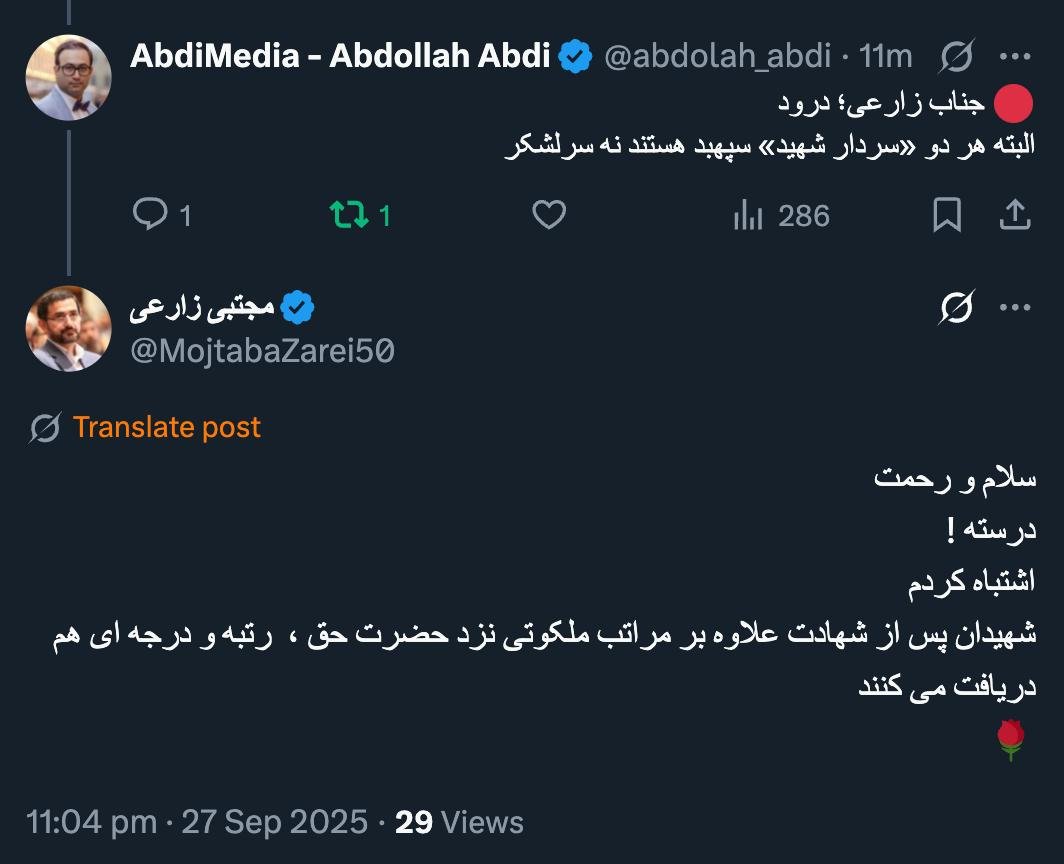 Home/PoliticsTwitter responses – 28 SeptemberRead2 minutes -Sunday 2025/09/28 - 17:46News Code:22850Share You are very kind, Mr. Zarei; your concern is truly valuable.سلام و رحمت درسته ! اشتباه کردم شهیدان پس از شهادت علاوه بر مراتب ملکوتی نزد حضرت حق ، رتبه و درجه ای هم دریافت می کنند 🌹— مجتبی زارعی (@MojtabaZarei50) September 27, 2025🔴 بزرگوارید آقای زارعیدلسوزی تان ارزشمند است— AbdiMedia - Abdollah Abdi (@abdolah_abdi) September 27, 2025With great regret, the decision-making system has long been disrupted, lacking unity and a single voice.Image درود بر شماطبیعتا باید قبل از مصاحبه باید روی مواضع اعلامی، هماهنگ شوند— سیدنظام الدین موسوی (@nezammousavi) September 27, 2025🔴 با کمال تاسف مدتهاست نظامِ #تصمیم_گیری_واحد و یک سخن گفتن، اختلال دارد— AbdiMedia - Abdollah Abdi (@abdolah_abdi) September 27, 2025Greetings,Isn’t it beautiful? Isn’t it a significant hint?For everyone who follows my posts and tweets, it is clear that this tweet is ironic, not promotional. Image 🔴شروع طوفانی بورس پس از اسنپ بک؛ زیبا نیست؟🔸تا این لحظه، بازار ۴۵۰۰۰ واحد مثبت شد. pic.twitter.com/Sv2G72zvbx— AbdiMedia - Abdollah Abdi (@abdolah_abdi) September 27, 2025اقای عبدینمیدونم به چی اعتقاد دارید،اما اگر به خدا و آخرت و ...معتقدی،نکنید با اموال و دارایی و تتمه ی زندگی مردم بیچاره بازی!این سبز فرمایشی و کشوندن پای مردم به بازاری که قطعا بزودی رنگ خون میشه،میدونید تا حالا باعث پاشیدن چند زندگی و خودکشی مردانی شده که شرمنده ی روی…— پسر عاقل نوح (@Ebne_noah) September 27, 2025🔴 درود بر شما#زیبا_نیست؟ کنایه بزرگی نیست؟🔸بر هر عزیزی که مطالب و توییت های بنده را دنبال میکند واضح و است که این توییت کنایه آمیز است و نه تبلیغ.— AbdiMedia - Abdollah Abdi (@abdolah_abdi) September 27, 2025When the status of cryptocurrencies in the financial group became clear—since they themselves wrote in writing that they cannot be traced—this will also become evident. Image اینم نظریه کارشناس هایی که پزشکیان ازشون صحبت میکرد 🤣 آخه نادان ها ، پس کیف پول دیجیتال برای چی هست ؟!شما چطور میخوایدکنترلش کنی چطور میخواید ردگیریش کنی چطور میخواید محدودش کنی چطور میخواید قانون بذاری فلسفه دارای دیجیتال همینه پس یکم کمتر چرند بگین— 🅼🅾🅷🆂🅴🅽 (@oaxaog1) September 27, 2025🔴 وقتی رمز ارزهای #گروه_مالی_زاویه روشن شد که خودشان کتباً نوشتند نمیتوانند رد یابی کنند این هم مشخص میشود— AbdiMedia - Abdollah Abdi (@abdolah_abdi) September 27, 2025Related news Greetings Mr. Zarei, of course, both the “martyred commanders” hold the rank of Lieutenant General (Sepahbod), not Major General (Sarlashkar). Greetings to Mr. Mousavi. Of course, the system must clarify the matter. When the current head of the Supreme National Security Council says something, what can the secretary do? The annual Tether (USDT) purchase limit for each individual is only $5,000, with a holding limit of $10,000. Take less than a minute, register and share your opinion under this post.Insulting or inciting messages will be deleted.Sign UpComming Up Next I remembered Dr. Sadegh Zibakalam's speech about six months ago, when he said: If we enter into a military conflict, whether the system remains or not, not a single electric pole will remain intact in Iran - are you listening?خواندن 0 If this public announcement is not hindered like other parts of the system's security megaproject, yesخواندن 1 minute Regardless of the result of the establishment or non-continuation of the establishment of the Islamic Republic; Should the main leadership option after Ayatollah Khamenei be acted in this way?خواندن 1 minute According to the significant custom of the seminary and jurisprudence, now we have to see which jurist will perform the funeral prayer for Ayatollah Khamenei?خواندن 1 minute In the news of his appointment, I wrote that he is the commander of the camp at the same time as the deputy commander of the army corpsخواندن 1 minuteMost ReadMemories of Akbar Hashemi - February 20, 2000 - Meeting with Abdullah Jasbi and Concerns About Election ResultsMovie / Where is Commander Morteza Talaie?Akbar Hashemi's memoirs - 1999 September 10 - The two-person political negotiations with Vaez Tabasi continued until he was escorted to Tehran, where Hashemi apparently decided to seriously participate in the sixth parliamentary elections.The records of the recent periods of the Islamic Council showed that the parliament is not in charge of affairs and cannot interfere or pass resolutions on the authority of the Commander-in-Chief of the Armed Forces at any level, let alone supervise.What will be the future of Iran with the announced candidates for the presidential election? / Conversation with Dr. Taghi Azad AramakiCan I feel tired with you?A Basiji veterinarian was appointed head of the health network instead of an otolaryngologist.Akbar Hashemi's memoirs - 1999 September 5 - The meeting of the senior managers of the judiciary with Hashemi Rafsanjani and their complaint about the neglect of Hashemi Shahroudi, the new head of the judiciary, continues.Memories of Akbar Hashem