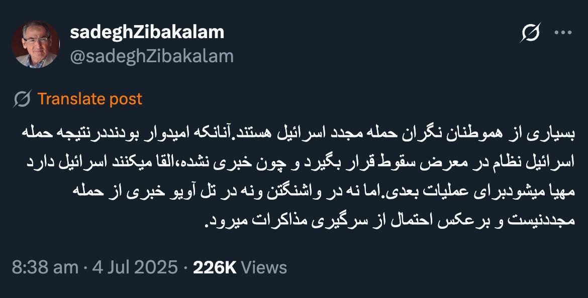 Home/PoliticsDear Dr. Zibakalam, greetings. Generally, 99 percent of the reality of all this news and analysis that we are dealing with is not among the engaged powers as we imagine it to be, or at least that's my interpretation.Read1 minute -Monday 2025/07/14 - 22:32News Code:20934Share Stay to the memoryبسیاری از هموطنان نگران حمله مجدد اسرائیل هستند.آنانکه امیدوار بودنددرنتیجه حمله اسرائیل نظام در معرض سقوط قرار بگیرد و چون خبری نشده،القا میکنند اسرائیل دارد مهیا میشودبرای عملیات بعدی.اما نه در واشنگتن ونه در تل آویو خبری از حمله مجددنیست و برعکس احتمال از سرگیری مذاکرات میرود.— sadeghZibakalam (@sadeghZibakalam) July 4, 2025🔴 جناب دکتر زیباکلامدرود💢بطورکلی ۹۹ درصد واقعیت این همه خبر و تحلیل که ما به آن می پردازیم در بین قدرت های درگیر این نیست که تصور می کنیم، یا حداقل برداشت من این است.#بماند_به_یادگار— AbdiMedia - Abdollah Abdi (@abdolah_abdi) July 5, 2025 Take less than a minute, register and share your opinion under this post.Insulting or inciting messages will be deleted.Sign UpComming Up Next I remembered Dr. Sadegh Zibakalam's speech about six months ago, when he said: If we enter into a military conflict, whether the system remains or not, not a single electric pole will remain intact in Iran - are you listening?خواندن 0 If this public announcement is not hindered like other parts of the system's security megaproject, yesخواندن 1 minute Regardless of the result of the establishment or non-continuation of the establishment of the Islamic Republic; Should the main leadership option after Ayatollah Khamenei be acted in this way?خواندن 1 minute According to the significant custom of the seminary and jurisprudence, now we have to see which jurist will perform the funeral prayer for Ayatollah Khamenei?خواندن 1 minute In the news of his appointment, I wrote that he is the commander of the camp at the same time as the deputy commander of the army corpsخواندن 1 minuteMost ReadMemories of Akbar Hashemi - February 20, 2000 - Meeting with Abdullah Jasbi and Concerns About Election ResultsMovie / Where is Commander Morteza Talaie?Akbar Hashemi's memoirs - 1999 September 10 - The two-person political negotiations with Vaez Tabasi continued until he was escorted to Tehran, where Hashemi apparently decided to seriously participate in the sixth parliamentary elections.The records of the recent periods of the Islamic Council showed that the parliament is not in charge of affairs and cannot interfere or pass resolutions on the authority of the Commander-in-Chief of the Armed Forces at any level, let alone supervise.What will be the future of Iran with the announced candidates for the presidential election? / Conversation with Dr. Taghi Azad AramakiCan I feel tired with you?A Basiji veterinarian was appointed head of the health network instead of an otolaryngologist.Akbar Hashemi's memoirs - 1999 September 5 - The meeting of the senior managers of the judiciary with Hashemi Rafsanjani and their complaint about the neglect of Hashemi Shahroudi, the new head of the judiciary, continues.Memories of Akbar Hashemi - 1999 September 7 - In continuation of the efforts of the late Vaez Tabasi, who used to encourage Hashemi to participate in the elections in frequent meetings, this time he also met with Hashemi.Akbar Hashemi's memories - 1999 September 9 - Continued visits to the belongings, buildings and works of Astan Quds