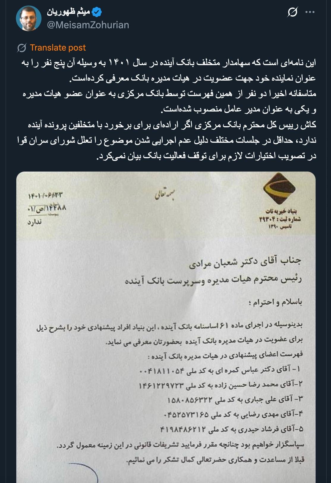 Home/PoliticsMr. Zahoorian, greetings. As a member of the Islamic Consultative Assembly, will you formally submit the criminal process regarding the actions of Bank Ayandeh—under the title of a complaint, even against the Governor of the Central BankRead1 minute -Tuesday 2025/09/30 - 14:39News Code:22885Share این نامهای است که سهامدار متخلف بانک آینده در سال ۱۴۰۱ به وسیله آن پنج نفر را به عنوان نماینده خود جهت عضویت در هیات مدیره بانک معرفی کردهاست. متاسفانه اخیرا دو نفر از همین فهرست توسط بانک مرکزی به عنوان عضو هیات مدیره و یکی به عنوان مدیر عامل منصوب شدهاست. کاش رییس کل محترم… pic.twitter.com/0WI3z5Pa1B— میثم ظهوریان (@MeisamZohurian) September 29, 2025🔴 جناب آقای ظهوریاندرود💢به عنوان نماینده مجلس شورای اسلامی فرایند #مجرمانه افعال بانک آینده را رسماً تحت عنوان شکایت حتی از رییس کل بانک مرکزی به سرپرستان دادسرای کارکنان دولت یا امور اقتصادی تقدیم خواهید کرد و بعد نتیجه را اطلاع رسانی کنید؟— AbdiMedia - Abdollah Abdi (@abdolah_abdi) September 30, 2025 Take less than a minute, register and share your opinion under this post.Insulting or inciting messages will be deleted.Sign UpComming Up Next I remembered Dr. Sadegh Zibakalam's speech about six months ago, when he said: If we enter into a military conflict, whether the system remains or not, not a single electric pole will remain intact in Iran - are you listening?خواندن 0 If this public announcement is not hindered like other parts of the system's security megaproject, yesخواندن 1 minute Regardless of the result of the establishment or non-continuation of the establishment of the Islamic Republic; Should the main leadership option after Ayatollah Khamenei be acted in this way?خواندن 1 minute According to the significant custom of the seminary and jurisprudence, now we have to see which jurist will perform the funeral prayer for Ayatollah Khamenei?خواندن 1 minute In the news of his appointment, I wrote that he is the commander of the camp at the same time as the deputy commander of the army corpsخواندن 1 minuteMost ReadMemories of Akbar Hashemi - February 20, 2000 - Meeting with Abdullah Jasbi and Concerns About Election ResultsMovie / Where is Commander Morteza Talaie?Akbar Hashemi's memoirs - 1999 September 10 - The two-person political negotiations with Vaez Tabasi continued until he was escorted to Tehran, where Hashemi apparently decided to seriously participate in the sixth parliamentary elections.The records of the recent periods of the Islamic Council showed that the parliament is not in charge of affairs and cannot interfere or pass resolutions on the authority of the Commander-in-Chief of the Armed Forces at any level, let alone supervise.What will be the future of Iran with the announced candidates for the presidential election? / Conversation with Dr. Taghi Azad AramakiCan I feel tired with you?A Basiji veterinarian was appointed head of the health network instead of an otolaryngologist.Akbar Hashemi's memoirs - 1999 September 5 - The meeting of the senior managers of the judiciary with Hashemi Rafsanjani and their complaint about the neglect of Hashemi Shahroudi, the new head of the judiciary, continues.Memories of Akbar Hashemi - 1999 September 7 - In continuation of the efforts of the late Vaez Tabasi, who used to encourage Hashemi to participate in the elections in frequent meetings, this time he also met with Hashemi.Akbar Hashemi's memories - 1999 September 9 - Continued visits to the belongings, buildings and works of Astan Quds