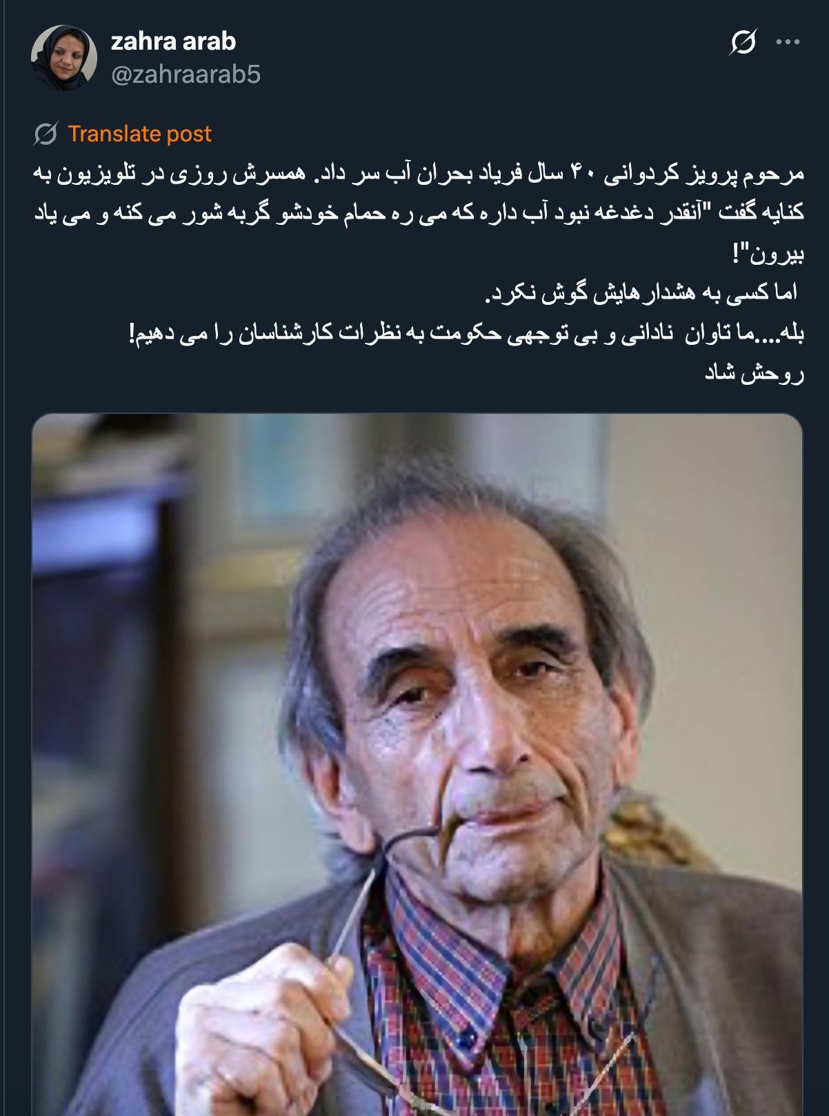 Home/Social/EnvironmentPeace be upon the soul of this great, compassionate, and honest man.Read1 minute -Sunday 2025/08/24 - 11:27News Code:22212Share مرحوم پرویز کردوانی ۴۰ سال فریاد بحران آب سر داد. همسرش روزی در تلویزیون به کنایه گفت "آنقدر دغدغه نبود آب داره که می ره حمام خودشو گربه شور می کنه و می یاد بیرون"!اما کسی به هشدارهایش گوش نکرد.بله....ما تاوان نادانی و بی توجهی حکومت به نظرات کارشناسان را می دهیم!روحش شاد pic.twitter.com/f2m2mKr1rB— zahra arab (@zahraarab5) August 21, 2025🔴 درود بر شماروح این مرد بزرگ و دلسوز و صادق شاد— AbdiMedia - Abdollah Abdi (@abdolah_abdi) August 21, 2025 Take less than a minute, register and share your opinion under this post.Insulting or inciting messages will be deleted.Sign UpComming Up Next Complete Drying of the Band-e Ali Khan Wetlandخواندن 1 minute The filling rate of Tehran's dams has reached 9%.خواندن 1 minute Comparison of the status of Taleghan Dam over the past yearخواندن 0 Important dams only have 32% of waterخواندن 1 minute Every year 50 thousand Iranians die due to terrible air pollutionخواندن 1 minuteMost ReadMemories of Akbar Hashemi - February 20, 2000 - Meeting with Abdullah Jasbi and Concerns About Election ResultsMovie / Where is Commander Morteza Talaie?Akbar Hashemi's memoirs - 1999 September 10 - The two-person political negotiations with Vaez Tabasi continued until he was escorted to Tehran, where Hashemi apparently decided to seriously participate in the sixth parliamentary elections.The records of the recent periods of the Islamic Council showed that the parliament is not in charge of affairs and cannot interfere or pass resolutions on the authority of the Commander-in-Chief of the Armed Forces at any level, let alone supervise.What will be the future of Iran with the announced candidates for the presidential election? / Conversation with Dr. Taghi Azad AramakiCan I feel tired with you?A Basiji veterinarian was appointed head of the health network instead of an otolaryngologist.Akbar Hashemi's memoirs - 1999 September 5 - The meeting of the senior managers of the judiciary with Hashemi Rafsanjani and their complaint about the neglect of Hashemi Shahroudi, the new head of the judiciary, continues.Memories of Akbar Hashemi - 1999 September 7 - In continuation of the efforts of the late Vaez Tabasi, who used to encourage Hashemi to participate in the elections in frequent meetings, this time he also met with Hashemi.Akbar Hashemi's memories - 1999 September 9 - Continued visits to the belongings, buildings and works of Astan Quds