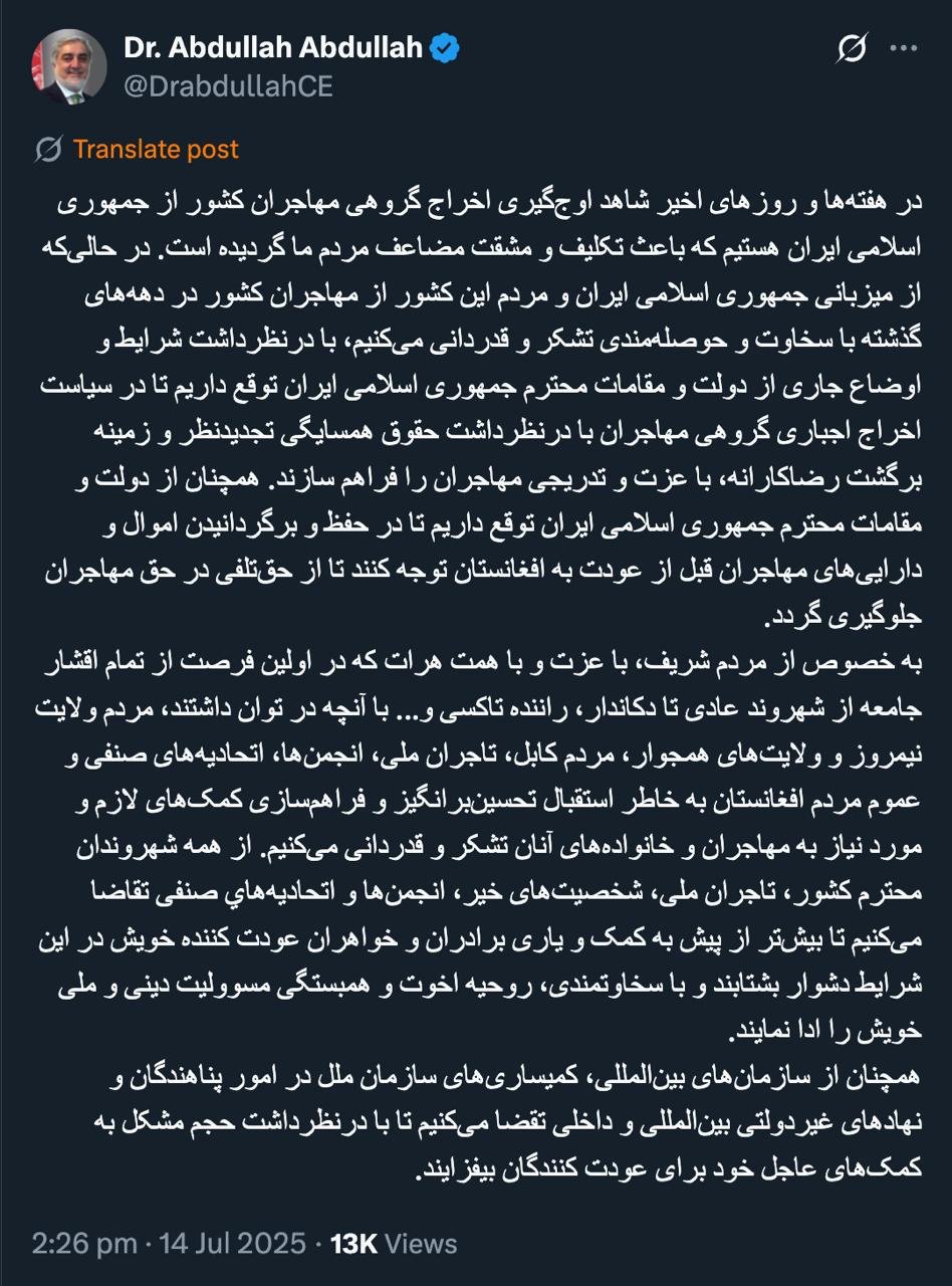 Home/WorldAbdullah Abdullah's complaint about how Afghan nationals were expelled from the Islamic RepublicRead0 -Tuesday 2025/07/15 - 09:33News Code:21338Share Take less than a minute, register and share your opinion under this post.Insulting or inciting messages will be deleted.Sign UpComming Up Next A reporter, referring to the presence of Steve Whitcaf and Jared Kushner, as well as Brad Cooper, the head of the U.S. Central Command, in negotiations with the Islamic Republic in Oman, asked Donald Trump...خواندن 1 minute Trump: We had very good talks about Iran, and it seems that Iran is very eager to reach an agreement.خواندن 1 minute The United States Ministry of Foreign Affairs called Mustafa Tajzadeh's arrest while on leave from prison and his transfer to Evin as an "obvious disregard of the Islamic Republic's principles, human dignity, and justice."خواندن 1 minute American announcements and warnings in Persianخواندن 0 Trump on how he got Hamas to accept the deal: I spoke a little bit tough and that was enough. That's what works in a tough world like this: You have to speak tough.خواندن 1 minuteMost ReadMemories of Akbar Hashemi - February 20, 2000 - Meeting with Abdullah Jasbi and Concerns About Election ResultsMovie / Where is Commander Morteza Talaie?Akbar Hashemi's memoirs - 1999 September 10 - The two-person political negotiations with Vaez Tabasi continued until he was escorted to Tehran, where Hashemi apparently decided to seriously participate in the sixth parliamentary elections.The records of the recent periods of the Islamic Council showed that the parliament is not in charge of affairs and cannot interfere or pass resolutions on the authority of the Commander-in-Chief of the Armed Forces at any level, let alone supervise.What will be the future of Iran with the announced candidates for the presidential election? / Conversation with Dr. Taghi Azad AramakiCan I feel tired with you?A Basiji veterinarian was appointed head of the health network instead of an otolaryngologist.Akbar Hashemi's memoirs - 1999 September 5 - The meeting of the senior managers of the judiciary with Hashemi Rafsanjani and their complaint about the neglect of Hashemi Shahroudi, the new head of the judiciary, continues.Memories of Akbar Hashemi - 1999 September 7 - In continuation of the efforts of the late Vaez Tabasi, who used to encourage Hashemi to participate in the elections in frequent meetings, this time he also met with Hashemi.Akbar Hashemi's memories - 1999 September 9 - Continued visits to the belongings, buildings and works of Astan Quds