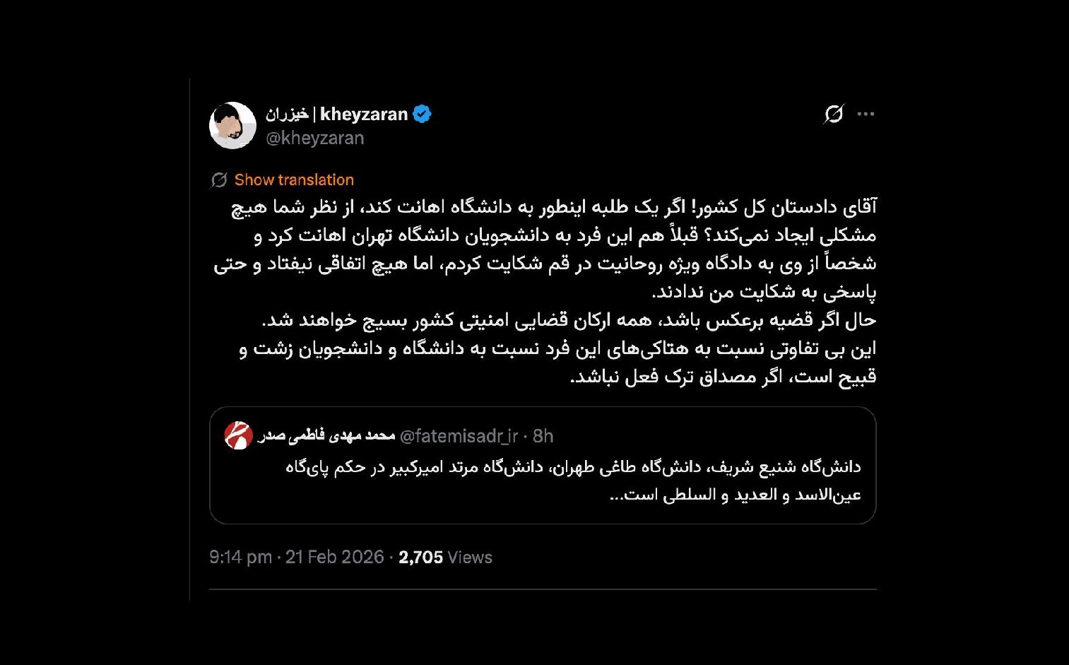 خانه/حقوقیدادستان کل کشور چه اختیاری در مورد یک طلبه دارد؟ به دادستان منصوب ویژه روحانیت یا معاونان قضایی او باید رجوع کنیدخواندن1 دقیقه -یکشنبه 1404/12/03 - 16:01کد خبر24470اشتراکگذاری آقای دادستان کل کشور! اگر یک طلبه اینطور به دانشگاه اهانت کند، از نظر شما هیچ مشکلی ایجاد نمیکند؟ قبلاً هم این فرد به دانشجویان دانشگاه تهران اهانت کرد و شخصاً از وی به دادگاه ویژه روحانیت در قم شکایت کردم، اما هیچ اتفاقی نیفتاد و حتی پاسخی به شکایت من ندادند. حال اگر قضیه… https://t.co/8qXsTKPpwc— خیزران | kheyzaran (@kheyzaran) February 21, 2026🔴درود @kheyzaran دادستان کل کشور چه اختیاری در مورد یک #طلبه دارد؟به دادستان منصوب ویژه روحانیت یا معاونان قضایی او باید رجوع کنید https://t.co/NDBfXzDBab— AbdiMedia - Abdollah Abdi (@abdolah_abdi) February 21, 2026 کمتر از یک دقیقه زمان بگذارید، ثبتنام کنید و نظرتان را زیر همین پست به اشتراک بگذارید.پیامهای توهینآمیز و یا حاوی دعوت به خشونت حذف خواهند شد.ثبت نامدر ادامه بخوانید پیشنهاد اصلاح را مدتها پیش در عبدی مدیا نوشتم و بارها تکرار کردم اخیرا هم خواستار آن شدم حداقل گستره آن را زیاد کنند رییس قوه هم در دیدار با وکلا وعده ها داد اما دریغ..خواندن 1 دقیقه استاد در صدر این مطالبه گران شخص رییس قوه قضاییه است که علنی چنین مطالبهای دارد و در رسانه ها هم مکرر گفته استخواندن 1 دقیقه خیلی مهم / قابل توجه: وکلای دادگستری در سراسر کشور سردفتران و دفتریاران سراسر کشورخواندن 2 دقیقه درکانون وکلای دادگستری خوزستان چه خبر است؟ / استعفای تعدادی از وکلای عضو هیئت مدیره این کانونخواندن 1 دقیقه مادام که تبصره ذیل ماده ۴۸ قانون آیین دادرسی کیفری حذف یا اصلاح نشده...خواندن 1 دقیقهباید خواندخاطرات اکبر هاشمی - ۱ اسفند ۱۳۷۸ - ملاقات عبدالله جاسبی و نگرانی از نتایج انتخاباتفیلم/ سردار مرتضی طلایی کجاست؟خاطرات اکبر هاشمی - ۱۹ شهريور ۱۳۷۸ - مذاکرات دو نفره سیاسی با واعظ طبسی تا هنگام بدرقه به سوی تهران هم ادامه داشته که در نهایت هاشمی ظاهرا از اینجا تصمیم به شرکت جدی در انتخابات مجلس ششم گرفتسوابق ادوار اخیر مجلس شورای اسلامی نشان داد که مجلس در راس امور نیست و در اختیارات فرمانده کل قوا و نیروهای مسلح در هیچ سطحی نمیتواند دخالت و یا مصوبه طی کند، چه برسد که نظارت کندآینده ایران با نامزدهای اعلام شده انتخابات ریاست جمهوری چه میشود؟ / گفتگو با دکتر تقی آزاد ارمکیمیشه با شما احساس خستگی کرد؟یک دامپزشک بسیجی بجای جراح گوش و حلق و بینی سرپرست شبکه بهداشت ایذه شد!خاطرات اکبر هاشمی - ۱۴ شهريور ۱۳۷۸ - دیدار مدیران ارشد دستگاه قضایی با هاشمی رفسنجانی و گله آنان از بی توجهی هاشمی شاهرودی رییس جدید قوه قضاییه ادامه داردخاطرات اکبر هاشمی - ۱۶ شهريور ۱۳۷۸ - در ادامه تلاش های مرحوم واعظ طبسی که در دیدارهای مکرر برای تشویق هاشمی به شرکت در انتخابات اقدام میکرد این بار هم او با هاشمی ملاقات کردخاطرات اکبر هاشمی - ۱۸ شهريور ۱۳۷۸ - ادامه بازدید ها از متعلقات و ابنیه و آثار آستان قدس