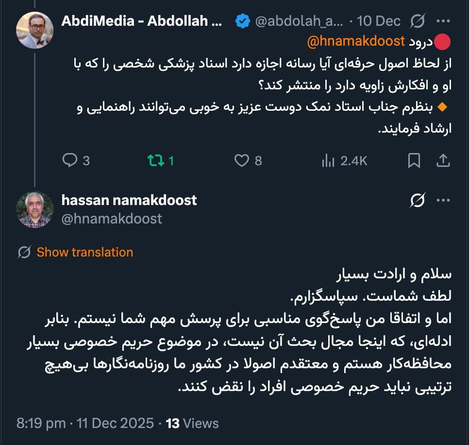 خانه/رسانهاز لحاظ اصول حرفهای آیا رسانه اجازه دارد اسناد پزشکی شخصی را که با او و افکارش زاویه دارد را منتشر کند؟خواندن1 دقیقه -جمعه 1404/09/21 - 12:26کد خبر23894اشتراکگذاری بنظرم جناب استاد نمک دوست عزیز به خوبی میتوانند راهنمایی و ارشاد فرمایند.♦️طالبی دارستانی سکته نکرده است + اسناد پزشکی🔹از ساعاتی پیش تصاویری از پرونده پزشکی مهری #طالبی_دارستانی که با اظهار مشکل جسمانی به بیمارستان مراجعه و تحت نظر پزشک بود در فضای مجازی منتشر شده که بررسی تصاویر منتشر شده در فضای مجازی نشان میدهد فرد مورد اشاره دچار سکته نشده… pic.twitter.com/WmZp3za5s3— Mahyar Kardar (@MahyarKardar_ir) December 10, 2025🔴درود @hnamakdoost از لحاظ اصول حرفهای آیا رسانه اجازه دارد اسناد پزشکی شخصی را که با او و افکارش زاویه دارد را منتشر کند؟🔸بنظرم جناب استاد نمک دوست عزیز به خوبی میتوانند راهنمایی و ارشاد فرمایند.— AbdiMedia - Abdollah Abdi (@abdolah_abdi) December 10, 2025 بزرگوارید استادسپاس از پاسخ حضرتعالیسلام و ارادت بسیارلطف شماست. سپاسگزارم.اما و اتفاقا من پاسخگوی مناسبی برای پرسش مهم شما نیستم. بنابر ادلهای، که اینجا مجال بحث آن نیست، در موضوع حریم خصوصی بسیار محافظهکار هستم و معتقدم اصولا در کشور ما روزنامهنگارها بیهیچ ترتیبی نباید حریم خصوصی افراد را نقض کنند.— hassan namakdoost (@hnamakdoost) December 11, 2025🔴 بزرگوارید استادسپاس از پاسخ حضرتعالی— AbdiMedia - Abdollah Abdi (@abdolah_abdi) December 11, 2025 کمتر از یک دقیقه زمان بگذارید، ثبتنام کنید و نظرتان را زیر همین پست به اشتراک بگذارید.پیامهای توهینآمیز و یا حاوی دعوت به خشونت حذف خواهند شد.ثبت نامدر ادامه بخوانید جناب مجتهد زاده درود آیا شما شکایت رسمی ای در دادسرا کردید؟ مطمئنید برای فیلتر دستور قضایی وجود دارد؟خواندن 1 دقیقه پایگاه خبری-تحلیلی دیدارنیوز «مسدود» شد!خواندن 3 دقیقه خانم ها و آقایان محترم خبرگزاری میزانخواندن 1 دقیقه گاهی رسانه های مستقل اینگونه و در این شرایط تنهایی تلخ را عمیقتر حس میکنند بسیار متاسفم.خواندن 1 دقیقه آقای نوری قزلجه وزیر جهاد کشاورزی درودخواندن 1 دقیقهباید خواندخاطرات اکبر هاشمی - ۱ اسفند ۱۳۷۸ - ملاقات عبدالله جاسبی و نگرانی از نتایج انتخاباتفیلم/ سردار مرتضی طلایی کجاست؟خاطرات اکبر هاشمی - ۱۹ شهريور ۱۳۷۸ - مذاکرات دو نفره سیاسی با واعظ طبسی تا هنگام بدرقه به سوی تهران هم ادامه داشته که در نهایت هاشمی ظاهرا از اینجا تصمیم به شرکت جدی در انتخابات مجلس ششم گرفتسوابق ادوار اخیر مجلس شورای اسلامی نشان داد که مجلس در راس امور نیست و در اختیارات فرمانده کل قوا و نیروهای مسلح در هیچ سطحی نمیتواند دخالت و یا مصوبه طی کند، چه برسد که نظارت کندآینده ایران با نامزدهای اعلام شده انتخابات ریاست جمهوری چه میشود؟ / گفتگو با دکتر تقی آزاد ارمکیمیشه با شما احساس خستگی کرد؟یک دامپزشک بسیجی بجای جراح گوش و حلق و بینی سرپرست شبکه بهداشت ایذه شد!خاطرات اکبر هاشمی - ۱۴ شهريور ۱۳۷۸ - دیدار مدیران ارشد دستگاه قضایی با هاشمی رفسنجانی و گله آنان از بی توجهی هاشمی شاهرودی رییس جدید قوه قضاییه ادامه داردخاطرات اکبر هاشمی - ۱۶ شهريور ۱۳۷۸ - در ادامه تلاش های مرحوم واعظ طبسی که در دیدارهای مکرر برای تشویق هاشمی به شرکت در انتخابات اقدام میکرد این بار هم او با هاشمی ملاقات کردخاطرات اکبر هاشمی - ۱۸ شهريور ۱۳۷۸ - ادامه بازدید ها از متعلقات و ابنیه و آثار آستان قدس
