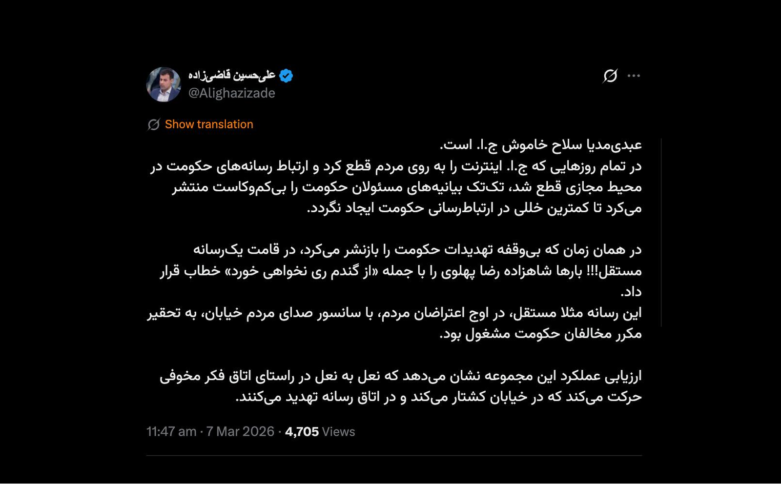 خانه/سیاست آقای علی حسین قاضی زاده از تبلیغ عبدی مدیا متشکرم حتی اگر دریچه اطلاع رسانی یک ایرانی که موج سواری نمی کند و از خون جوانان وطن و شهروندان ایران بزرگ و متحد برای خود کلاه و منفعتی عاید نمی کند.خواندن1 دقیقه -سه شنبه 1405/01/18 - 17:36کد خبر24602اشتراکگذاری اخبار و اطلاعات منتشره در عبدی مدیا را که اطلاع رسانی دقیق و حتی با ملاحظات بسیار است با موج سواری اخبار و اطلاعات منتشره در عبدی مدیا را که اطلاع رسانی دقیق و حتی با ملاحظات بسیار است با موج سواری و توییت بازی و چهره رسانه ای بعضی ها تطبیق دهیدنمونه اش ادعاهای رسانه ای شخص جنابعالیو اکنون با ادعاهای عجیب و غریب و از ظن خود شدی یار من! از اطلاع رسانی دقیق و مستند هراس دارید. برای چه؟چون هرچه دوست دارید به مخاطب که از همه جا ناامید است القا کنیدموفق باشیدعبدیمدیا سلاح خاموش ج.ا. است.در تمام روزهایی که ج.ا. اینترنت را به روی مردم قطع کرد و ارتباط رسانههای حکومت در محیط مجازی قطع شد، تکتک بیانیههای مسئولان حکومت را بیکموکاست منتشر میکرد تا کمترین خللی در ارتباطرسانی حکومت ایجاد نگردد.در همان زمان که بیوقفه تهدیدات حکومت…— علیحسین قاضیزاده (@Alighazizade) March 7, 2026🔴 آقای علی حسین قاضی زاده💢 از تبلیغ عبدی مدیا متشکرم حتی اگر دریچه اطلاع رسانی یک #ایرانی که موج سواری نمی کند و از خون جوانان وطن و شهروندان #ایران_بزرگ_و_متحد برای خود کلاه و منفعتی عاید نمی کند.🔸اخبار و اطلاعات منتشره در عبدی مدیا را که اطلاع رسانی دقیق و حتی با ملاحظات…— AbdiMedia - Abdollah Abdi (@abdolah_abdi) March 7, 2026 کمتر از یک دقیقه زمان بگذارید، ثبتنام کنید و نظرتان را زیر همین پست به اشتراک بگذارید.پیامهای توهینآمیز و یا حاوی دعوت به خشونت حذف خواهند شد.ثبت نامدر ادامه بخوانید سید مجتبی خامنهای رهبر منتقم هست و نه مصلحخواندن 1 دقیقه اندکی پیش از اعلام نام رهبر سوم جمهوری اسلامی در گفتگویی تحلیلی به سناریوهای آینده با ساختار فعلی جمهوری اسلامی پرداختمخواندن 0 بالاخره اکثریت این دوره مجلس خبرگان رهبری با مشورت و رایزنی بیشتر، صلاح را در این دانست که برای گزینه رهبر سوم به سراغ آیتالله سید مجتبی خامنهای برود و نام او را نهایی و اعلام کند.خواندن 1 دقیقه سیدمجتبی خامنهای با رأی مجلس خبرگان سومین رهبر انقلاب اسلامی ایران شدخواندن 2 دقیقه محمد صادق کرمی محافظ ابراهیم رییسی و مسعود پزشکیان (عضو حلقه اول تیم حفاظت ریاست جمهوری) در اثر حمله اسراییل وآمریکا در دفتر رییس جمهور کشته شدخواندن 0باید خواندخاطرات اکبر هاشمی - ۱ اسفند ۱۳۷۸ - ملاقات عبدالله جاسبی و نگرانی از نتایج انتخاباتفیلم/ سردار مرتضی طلایی کجاست؟خاطرات اکبر هاشمی - ۱۹ شهريور ۱۳۷۸ - مذاکرات دو نفره سیاسی با واعظ طبسی تا هنگام بدرقه به سوی تهران هم ادامه داشته که در نهایت هاشمی ظاهرا از اینجا تصمیم به شرکت جدی در انتخابات مجلس ششم گرفتسوابق ادوار اخیر مجلس شورای اسلامی نشان داد که مجلس در راس امور نیست و در اختیارات فرمانده کل قوا و نیروهای مسلح در هیچ سطحی نمیتواند دخالت و یا مصوبه طی کند، چه برسد که نظارت کندآینده ایران با نامزدهای اعلام شده انتخابات ریاست جمهوری چه میشود؟ / گفتگو با دکتر تقی آزاد ارمکیمیشه با شما احساس خستگی کرد؟یک دامپزشک بسیجی بجای جراح گوش و حلق و بینی سرپرست شبکه بهداشت ایذه شد!خاطرات اکبر هاشمی - ۱۴ شهريور ۱۳۷۸ - دیدار مدیران ارشد دستگاه قضایی با هاشمی رفسنجانی و گله آنان از بی توجهی هاشمی شاهرودی رییس جدید قوه قضاییه ادامه داردخاطرات اکبر هاشمی - ۱۶ شهريور ۱۳۷۸ - در ادامه تلاش های مرحوم واعظ طبسی که در دیدارهای مکرر برای تشویق هاشمی به شرکت در انتخابات اقدام میکرد این بار هم او با هاشمی ملاقات کردخاطرات اکبر هاشمی - ۱۸ شهريور ۱۳۷۸ - ادامه بازدید ها از متعلقات و ابنیه و آثار آستان قدس