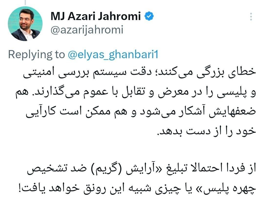 خانه/سیاستمهر تایید دیگری بر یادداشت عبدی مدیا / توییت معنا دار و مهم محمد جواد آذری جهرمی مدیرکل اسبق فنی وزارت اطلاعات و وزیر سابق ارتباطات و فناوری اطلاعاتخواندن1 دقیقه -پنجشنبه 1403/06/29 - 15:24کد خبر2757اشتراکگذاری همانطور که عرض کردم این سیستم مدتهاست فعال است و بسیار هم مورد استفاده اطلاعاتی قرار میگیرد اما علنی شدن آن توسط فراجا بسیار قابل تامل است.حالا باز هم لشگر سایبریونتان را به صفحات مجازی عبدی مدیا برای تکذیب گسیل کنید. کمتر از یک دقیقه زمان بگذارید، ثبتنام کنید و نظرتان را زیر همین پست به اشتراک بگذارید.پیامهای توهینآمیز و یا حاوی دعوت به خشونت حذف خواهند شد.ثبت نامدر ادامه بخوانید سید مجتبی خامنهای رهبر منتقم هست و نه مصلحخواندن 1 دقیقه اندکی پیش از اعلام نام رهبر سوم جمهوری اسلامی در گفتگویی تحلیلی به سناریوهای آینده با ساختار فعلی جمهوری اسلامی پرداختمخواندن 0 بالاخره اکثریت این دوره مجلس خبرگان رهبری با مشورت و رایزنی بیشتر، صلاح را در این دانست که برای گزینه رهبر سوم به سراغ آیتالله سید مجتبی خامنهای برود و نام او را نهایی و اعلام کند.خواندن 1 دقیقه سیدمجتبی خامنهای با رأی مجلس خبرگان سومین رهبر انقلاب اسلامی ایران شدخواندن 2 دقیقه آقای علی حسین قاضی زاده از تبلیغ عبدی مدیا متشکرم حتی اگر دریچه اطلاع رسانی یک ایرانی که موج سواری نمی کند و از خون جوانان وطن و شهروندان ایران بزرگ و متحد برای خود کلاه و منفعتی عاید نمی کند.خواندن 1 دقیقهباید خواندخاطرات اکبر هاشمی - ۱ اسفند ۱۳۷۸ - ملاقات عبدالله جاسبی و نگرانی از نتایج انتخاباتفیلم/ سردار مرتضی طلایی کجاست؟خاطرات اکبر هاشمی - ۱۹ شهريور ۱۳۷۸ - مذاکرات دو نفره سیاسی با واعظ طبسی تا هنگام بدرقه به سوی تهران هم ادامه داشته که در نهایت هاشمی ظاهرا از اینجا تصمیم به شرکت جدی در انتخابات مجلس ششم گرفتسوابق ادوار اخیر مجلس شورای اسلامی نشان داد که مجلس در راس امور نیست و در اختیارات فرمانده کل قوا و نیروهای مسلح در هیچ سطحی نمیتواند دخالت و یا مصوبه طی کند، چه برسد که نظارت کندآینده ایران با نامزدهای اعلام شده انتخابات ریاست جمهوری چه میشود؟ / گفتگو با دکتر تقی آزاد ارمکیمیشه با شما احساس خستگی کرد؟یک دامپزشک بسیجی بجای جراح گوش و حلق و بینی سرپرست شبکه بهداشت ایذه شد!خاطرات اکبر هاشمی - ۱۴ شهريور ۱۳۷۸ - دیدار مدیران ارشد دستگاه قضایی با هاشمی رفسنجانی و گله آنان از بی توجهی هاشمی شاهرودی رییس جدید قوه قضاییه ادامه داردخاطرات اکبر هاشمی - ۱۶ شهريور ۱۳۷۸ - در ادامه تلاش های مرحوم واعظ طبسی که در دیدارهای مکرر برای تشویق هاشمی به شرکت در انتخابات اقدام میکرد این بار هم او با هاشمی ملاقات کردخاطرات اکبر هاشمی - ۱۸ شهريور ۱۳۷۸ - ادامه بازدید ها از متعلقات و ابنیه و آثار آستان قدس
