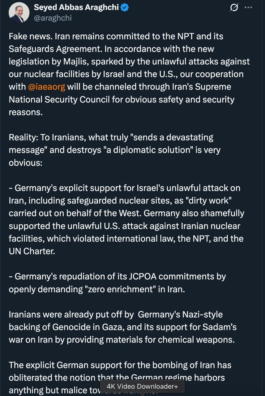 خانه/سیاست واکنش عراقچی به اظهارات وزارت خارجۀ آلمان در ایکسخواندن1 دقیقه -پنجشنبه 1404/04/12 - 17:02کد خبر20801اشتراکگذاری ایران همچنان به معاهدهۀعدم اشاعه و توافقنامه پادمان پایبند است. مطابق با قانون جدید مصوب مجلسایران همچنان به معاهدهۀعدم اشاعه و توافقنامه پادمان پایبند است. مطابق با قانون جدید مصوب مجلس که در واکنش به حملات غیرقانونی علیه تأسیسات هستهای ایران توسط اسرائیل و آمریکا تصویب شد، همکاری ایران با آژانس بهدلایل بدیهی ایمنی و امنیتی، صرفا از طریق شورای عالی امنیت ملی ایران ساماندهی خواهد شد.واقعیت این است: برای مردم ایران، آنچه واقعاً «پیام ویرانگر» میفرستد و «راهحل دیپلماتیک» را نابود میکند، کاملاً آشکار است.حمایت آشکار آلمان از حملۀ غیرقانونی اسرائیل به ایران، از جمله حمله به تأسیسات هستهای تحت پادمان، که آن را «کار کثیف» انجامشده به نیابت از غرب توصیف کردند.آلمان همچنین با وقاحت از حملۀ غیرقانونی آمریکا به تأسیسات هستهای ایران حمایت کرد؛ حملهای که ناقض حقوق بینالملل، معاهده عدم اشاعه و منشور سازمان ملل بود.نقض صریح تعهدات برجامی از سوی آلمان، از طریق مطالبه آشکار «غنیسازی صفر» در ایران.ایرانیها پیش از این نیز، از حمایت نازیگونۀ دولت آلمان از نسلکشی در غزه و همچنین حمایت آن از جنگ صدام علیه ایران از طریق تأمین مواد لازم برای ساخت سلاحهای شیمیایی، منزجر و بیزار بودند.اکنون، حمایت آشکار آلمان از بمباران ایران، این تصور را بهطور کامل از بین برده که رژیم آلمان چیزی جز سوءنیت و دشمنی نسبت به ملت ایران در سر دارد.اخبار مرتبط وزارت خارجه آلمان: تصمیم ایران برای تعلیق همکاری با آژانس پیام ویرانگری ارسال میکند: این اقدام هرگونه امکان نظارت بینالمللی بر برنامه هستهای ایران را که برای یک راهحل دیپلماتیک بسیار مهم است، از بین میبرد. ایران باید این تصمیم را لغو کند. کمتر از یک دقیقه زمان بگذارید، ثبتنام کنید و نظرتان را زیر همین پست به اشتراک بگذارید.پیامهای توهینآمیز و یا حاوی دعوت به خشونت حذف خواهند شد.ثبت نامدر ادامه بخوانید پاسخ های توییتری 2 اسفندخواندن 2 دقیقه جناب آشنا درود شما هم در حال بررسی این نظریه هستید که ممکن است اساساً این لشکرکشی آمریکا نهایتاً هدفی غیر از جمهوری اسلامی باشد؟خواندن 1 دقیقه موضوع کاملا روشن است با اشاره به قوه قضاییه آزاد شدند و این اشاره چنان پیگیری سریعی داشت که برای متهمین حتی روز تعطیل قرار قبولی وثیقه صادر و آزاد شدند.خواندن 1 دقیقه آقای دکتر درود نتیجه اعلام نظر پزشکی قانونی که خانواده ایشان از دادسرا دنبال کردند چه شد؟خواندن 1 دقیقه پاسخ های توییتری 30 بهمنخواندن 4 دقیقهباید خواندخاطرات اکبر هاشمی - ۱ اسفند ۱۳۷۸ - ملاقات عبدالله جاسبی و نگرانی از نتایج انتخاباتفیلم/ سردار مرتضی طلایی کجاست؟خاطرات اکبر هاشمی - ۱۹ شهريور ۱۳۷۸ - مذاکرات دو نفره سیاسی با واعظ طبسی تا هنگام بدرقه به سوی تهران هم ادامه داشته که در نهایت هاشمی ظاهرا از اینجا تصمیم به شرکت جدی در انتخابات مجلس ششم گرفتسوابق ادوار اخیر مجلس شورای اسلامی نشان داد که مجلس در راس امور نیست و در اختیارات فرمانده کل قوا و نیروهای مسلح در هیچ سطحی نمیتواند دخالت و یا مصوبه طی کند، چه برسد که نظارت کندآینده ایران با نامزدهای اعلام شده انتخابات ریاست جمهوری چه میشود؟ / گفتگو با دکتر تقی آزاد ارمکیمیشه با شما احساس خستگی کرد؟یک دامپزشک بسیجی بجای جراح گوش و حلق و بینی سرپرست شبکه بهداشت ایذه شد!خاطرات اکبر هاشمی - ۱۴ شهريور ۱۳۷۸ - دیدار مدیران ارشد دستگاه قضایی با هاشمی رفسنجانی و گله آنان از بی توجهی هاشمی شاهرودی رییس جدید قوه قضاییه ادامه داردخاطرات اکبر هاشمی - ۱۶ شهريور ۱۳۷۸ - در ادامه تلاش های مرحوم واعظ طبسی که در دیدارهای مکرر برای تشویق هاشمی به شرکت در انتخابات اقدام میکرد این بار هم او با هاشمی ملاقات کردخاطرات اکبر هاشمی - ۱۸ شهريور ۱۳۷۸ - ادامه بازدید ها از متعلقات و ابن