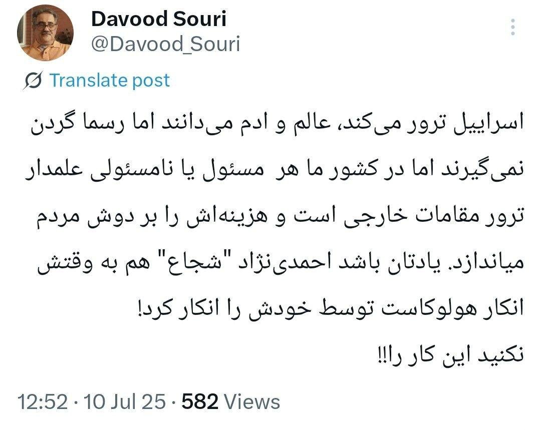 خانه/سیاستنکنید این کار را! اسراییل ترور میکند، عالم و ادم میدانند اما رسما گردن نمیگیرند اما در کشور ما هر مسئول یا نامسئولی علمدار ترور مقامات خارجی است و هزینهاش را بر دوش مردم میاندازد.خواندن0 -جمعه 1404/04/20 - 12:03کد خبر21149اشتراکگذاری کمتر از یک دقیقه زمان بگذارید، ثبتنام کنید و نظرتان را زیر همین پست به اشتراک بگذارید.پیامهای توهینآمیز و یا حاوی دعوت به خشونت حذف خواهند شد.ثبت نامدر ادامه بخوانید پاسخ های توییتری 2 اسفندخواندن 1 دقیقه جناب آشنا درود شما هم در حال بررسی این نظریه هستید که ممکن است اساساً این لشکرکشی آمریکا نهایتاً هدفی غیر از جمهوری اسلامی باشد؟خواندن 1 دقیقه موضوع کاملا روشن است با اشاره به قوه قضاییه آزاد شدند و این اشاره چنان پیگیری سریعی داشت که برای متهمین حتی روز تعطیل قرار قبولی وثیقه صادر و آزاد شدند.خواندن 1 دقیقه آقای دکتر درود نتیجه اعلام نظر پزشکی قانونی که خانواده ایشان از دادسرا دنبال کردند چه شد؟خواندن 1 دقیقه پاسخ های توییتری 30 بهمنخواندن 4 دقیقهباید خواندخاطرات اکبر هاشمی - ۱ اسفند ۱۳۷۸ - ملاقات عبدالله جاسبی و نگرانی از نتایج انتخاباتفیلم/ سردار مرتضی طلایی کجاست؟خاطرات اکبر هاشمی - ۱۹ شهريور ۱۳۷۸ - مذاکرات دو نفره سیاسی با واعظ طبسی تا هنگام بدرقه به سوی تهران هم ادامه داشته که در نهایت هاشمی ظاهرا از اینجا تصمیم به شرکت جدی در انتخابات مجلس ششم گرفتسوابق ادوار اخیر مجلس شورای اسلامی نشان داد که مجلس در راس امور نیست و در اختیارات فرمانده کل قوا و نیروهای مسلح در هیچ سطحی نمیتواند دخالت و یا مصوبه طی کند، چه برسد که نظارت کندآینده ایران با نامزدهای اعلام شده انتخابات ریاست جمهوری چه میشود؟ / گفتگو با دکتر تقی آزاد ارمکیمیشه با شما احساس خستگی کرد؟یک دامپزشک بسیجی بجای جراح گوش و حلق و بینی سرپرست شبکه بهداشت ایذه شد!خاطرات اکبر هاشمی - ۱۴ شهريور ۱۳۷۸ - دیدار مدیران ارشد دستگاه قضایی با هاشمی رفسنجانی و گله آنان از بی توجهی هاشمی شاهرودی رییس جدید قوه قضاییه ادامه داردخاطرات اکبر هاشمی - ۱۶ شهريور ۱۳۷۸ - در ادامه تلاش های مرحوم واعظ طبسی که در دیدارهای مکرر برای تشویق هاشمی به شرکت در انتخابات اقدام میکرد این بار هم او با هاشمی ملاقات کردخاطرات اکبر هاشمی - ۱۸ شهريور ۱۳۷۸ - ادامه بازدید ها از متعلقات و ابنیه و آثار آستان قدس