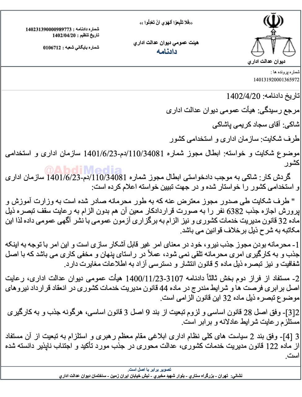 خانه/سیاست/سیاست داخلیبا شکایت سجاد کریمی پاشایی ؛ هیات عمومی دیوان عدالت اداری مجوز محرمانه ۲۳ خرداد ۱۴۰۱ سازمان اداری واستخدامی کشور به وزارت آموزش وپرورش را ابطال کردخواندن0 -چهارشنبه 1403/07/04 - 09:59کد خبر4001اشتراکگذاریتصویر تصویر تصویر تصویر تصویر PreviousNext کمتر از یک دقیقه زمان بگذارید، ثبتنام کنید و نظرتان را زیر همین پست به اشتراک بگذارید.پیامهای توهینآمیز و یا حاوی دعوت به خشونت حذف خواهند شد.ثبت نامدر ادامه بخوانید بالاخره حمایت علنی معاون اول رییس جمهور از وزیر امور اقتصادی و داراییخواندن 0 کیهان: در بند زنان زندان اوین، محکومان سیاسی مشروبات الکلی دست ساز در اختیار دارندخواندن 1 دقیقه علیعسگری، مدیرعامل شرکت صنایع پتروشیمی خلیج فارس، حاضر به گفتوگو درباره شرایط استقلال نشدخواندن 0 موحدی: قانون عفاف و حجاب را سیاسی نکنیدخواندن 1 دقیقه رسایی: آقای قالیباف! چرا مجلس و بقیه دستگاهها به قانون شفافیت عمل نمیکنند؟خواندن 1 دقیقهباید خواندخاطرات اکبر هاشمی - ۱ اسفند ۱۳۷۸ - ملاقات عبدالله جاسبی و نگرانی از نتایج انتخاباتفیلم/ سردار مرتضی طلایی کجاست؟خاطرات اکبر هاشمی - ۱۹ شهريور ۱۳۷۸ - مذاکرات دو نفره سیاسی با واعظ طبسی تا هنگام بدرقه به سوی تهران هم ادامه داشته که در نهایت هاشمی ظاهرا از اینجا تصمیم به شرکت جدی در انتخابات مجلس ششم گرفتسوابق ادوار اخیر مجلس شورای اسلامی نشان داد که مجلس در راس امور نیست و در اختیارات فرمانده کل قوا و نیروهای مسلح در هیچ سطحی نمیتواند دخالت و یا مصوبه طی کند، چه برسد که نظارت کندآینده ایران با نامزدهای اعلام شده انتخابات ریاست جمهوری چه میشود؟ / گفتگو با دکتر تقی آزاد ارمکیمیشه با شما احساس خستگی کرد؟یک دامپزشک بسیجی بجای جراح گوش و حلق و بینی سرپرست شبکه بهداشت ایذه شد!خاطرات اکبر هاشمی - ۱۴ شهريور ۱۳۷۸ - دیدار مدیران ارشد دستگاه قضایی با هاشمی رفسنجانی و گله آنان از بی توجهی هاشمی شاهرودی رییس جدید قوه قضاییه ادامه داردخاطرات اکبر هاشمی - ۱۶ شهريور ۱۳۷۸ - در ادامه تلاش های مرحوم واعظ طبسی که در دیدارهای مکرر برای تشویق هاشمی به شرکت در انتخابات اقدام میکرد این بار هم او با هاشمی ملاقات کردخاطرات اکبر هاشمی - ۱۸ شهريور ۱۳۷۸ - ادامه بازدید ها از متعلقات و ابنیه و آثار آستان قدس