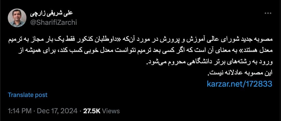 خانه/سیاستدرود خوشبختانه بر خلاف مصوبات شورای عالی انقلاب فرهنگی، مصوبه شورای عالی آموزش پرورش را هم میتوان از طریق رییس و دبیر آن پیگیری کرد و پیشنهاد اصلاح داد و هم میتوان از هیات عمومی دیوان عدالت اداری تقاضای ابطال کرد. خواندن1 دقیقه -سه شنبه 1403/09/27 - 23:48کد خبر10299اشتراکگذاری امیدوارم رییس جمهور و رییس شورای عالی آموزش و پرورش توجه کند. کمتر از یک دقیقه زمان بگذارید، ثبتنام کنید و نظرتان را زیر همین پست به اشتراک بگذارید.پیامهای توهینآمیز و یا حاوی دعوت به خشونت حذف خواهند شد.ثبت نامدر ادامه بخوانید سید مجتبی خامنهای رهبر منتقم هست و نه مصلحخواندن 1 دقیقه اندکی پیش از اعلام نام رهبر سوم جمهوری اسلامی در گفتگویی تحلیلی به سناریوهای آینده با ساختار فعلی جمهوری اسلامی پرداختمخواندن 0 بالاخره اکثریت این دوره مجلس خبرگان رهبری با مشورت و رایزنی بیشتر، صلاح را در این دانست که برای گزینه رهبر سوم به سراغ آیتالله سید مجتبی خامنهای برود و نام او را نهایی و اعلام کند.خواندن 1 دقیقه سیدمجتبی خامنهای با رأی مجلس خبرگان سومین رهبر انقلاب اسلامی ایران شدخواندن 2 دقیقه آقای علی حسین قاضی زاده از تبلیغ عبدی مدیا متشکرم حتی اگر دریچه اطلاع رسانی یک ایرانی که موج سواری نمی کند و از خون جوانان وطن و شهروندان ایران بزرگ و متحد برای خود کلاه و منفعتی عاید نمی کند.خواندن 1 دقیقهباید خواندخاطرات اکبر هاشمی - ۱ اسفند ۱۳۷۸ - ملاقات عبدالله جاسبی و نگرانی از نتایج انتخاباتفیلم/ سردار مرتضی طلایی کجاست؟خاطرات اکبر هاشمی - ۱۹ شهريور ۱۳۷۸ - مذاکرات دو نفره سیاسی با واعظ طبسی تا هنگام بدرقه به سوی تهران هم ادامه داشته که در نهایت هاشمی ظاهرا از اینجا تصمیم به شرکت جدی در انتخابات مجلس ششم گرفتسوابق ادوار اخیر مجلس شورای اسلامی نشان داد که مجلس در راس امور نیست و در اختیارات فرمانده کل قوا و نیروهای مسلح در هیچ سطحی نمیتواند دخالت و یا مصوبه طی کند، چه برسد که نظارت کندآینده ایران با نامزدهای اعلام شده انتخابات ریاست جمهوری چه میشود؟ / گفتگو با دکتر تقی آزاد ارمکیمیشه با شما احساس خستگی کرد؟یک دامپزشک بسیجی بجای جراح گوش و حلق و بینی سرپرست شبکه بهداشت ایذه شد!خاطرات اکبر هاشمی - ۱۴ شهريور ۱۳۷۸ - دیدار مدیران ارشد دستگاه قضایی با هاشمی رفسنجانی و گله آنان از بی توجهی هاشمی شاهرودی رییس جدید قوه قضاییه ادامه داردخاطرات اکبر هاشمی - ۱۶ شهريور ۱۳۷۸ - در ادامه تلاش های مرحوم واعظ طبسی که در دیدارهای مکرر برای تشویق هاشمی به شرکت در انتخابات اقدام میکرد این بار هم او با هاشمی ملاقات کردخاطرات اکبر هاشمی - ۱۸ شهريور ۱۳۷۸ - ادامه بازدید ها از متعلقات و ابنیه و آثار آستان قدس